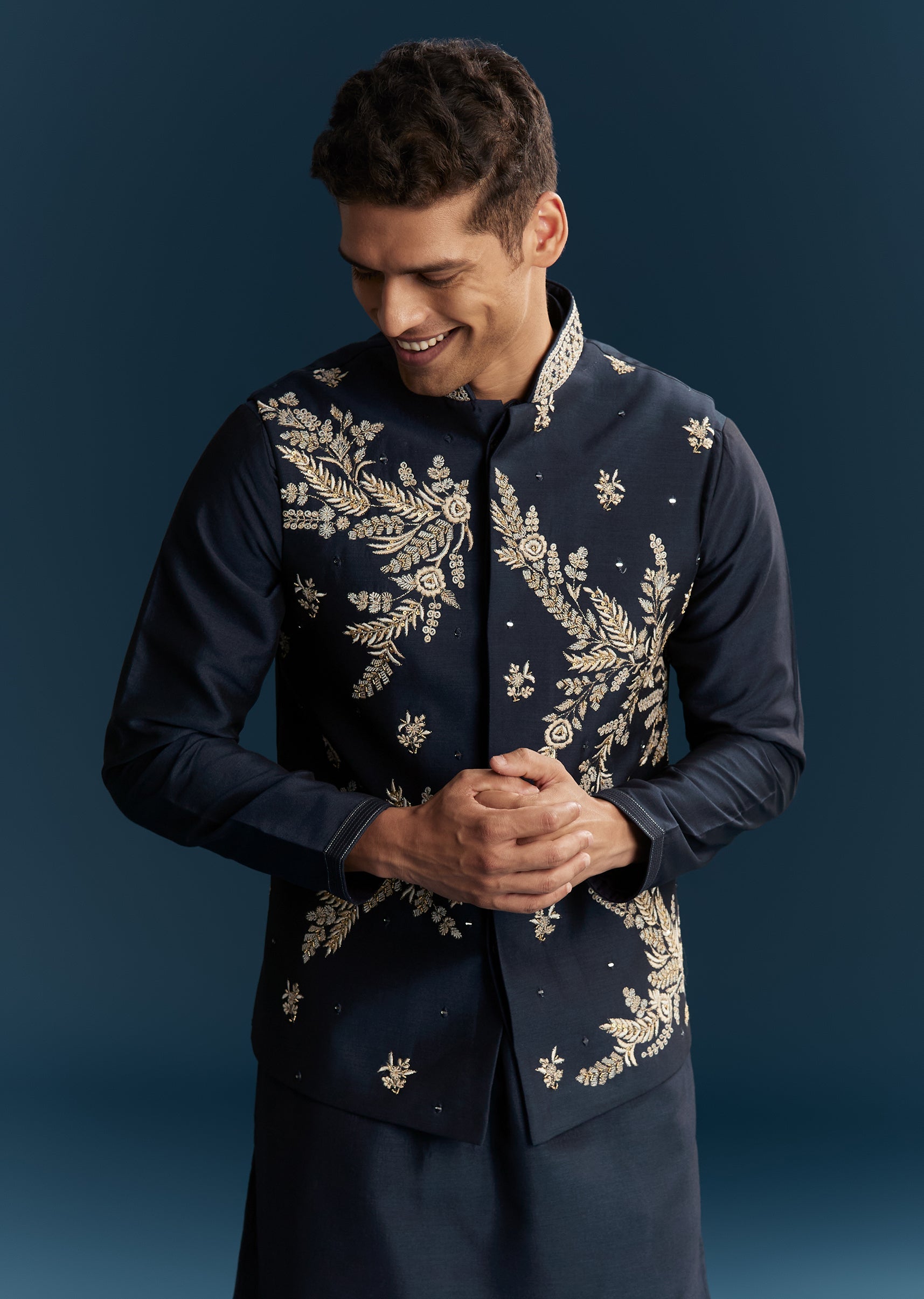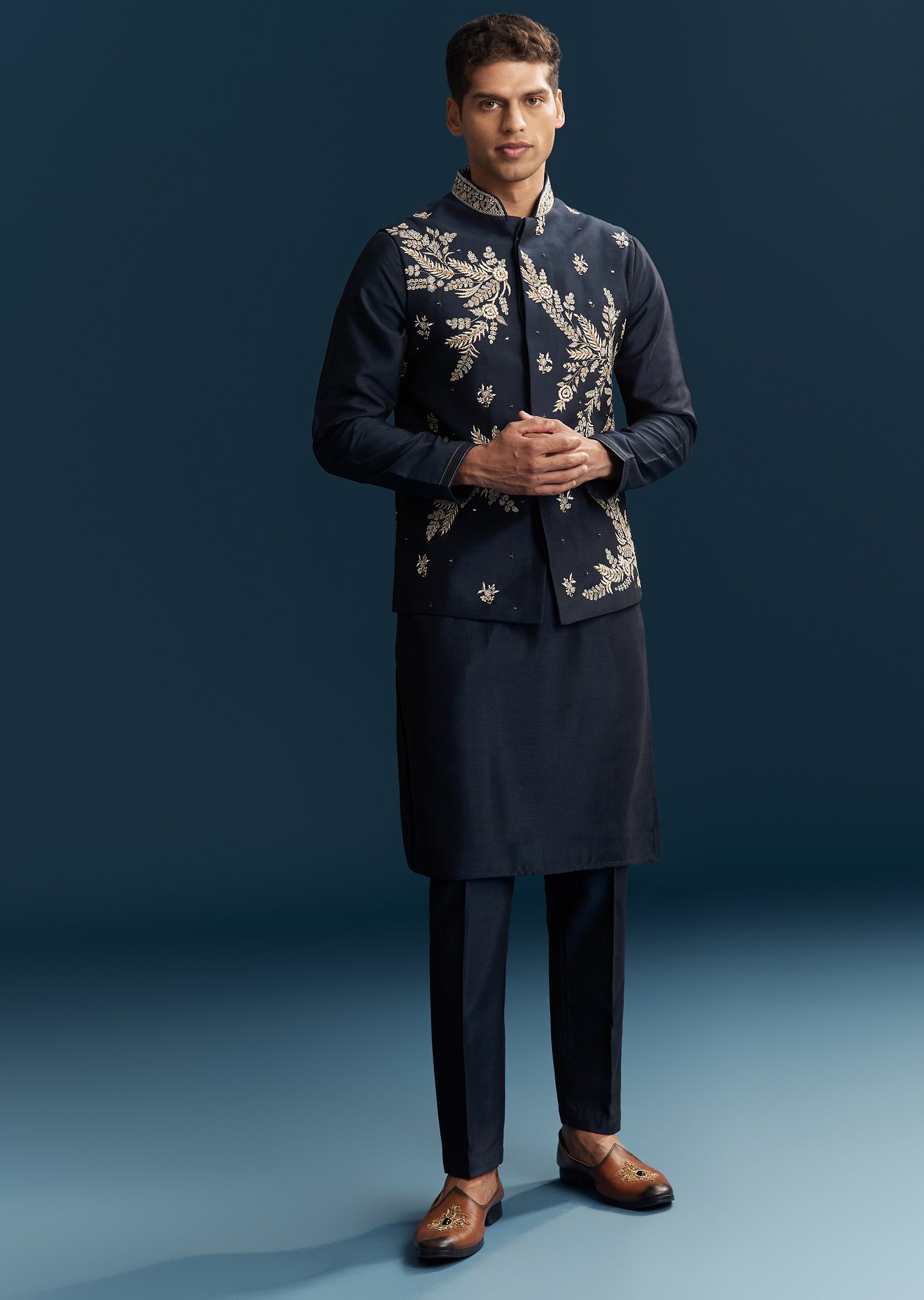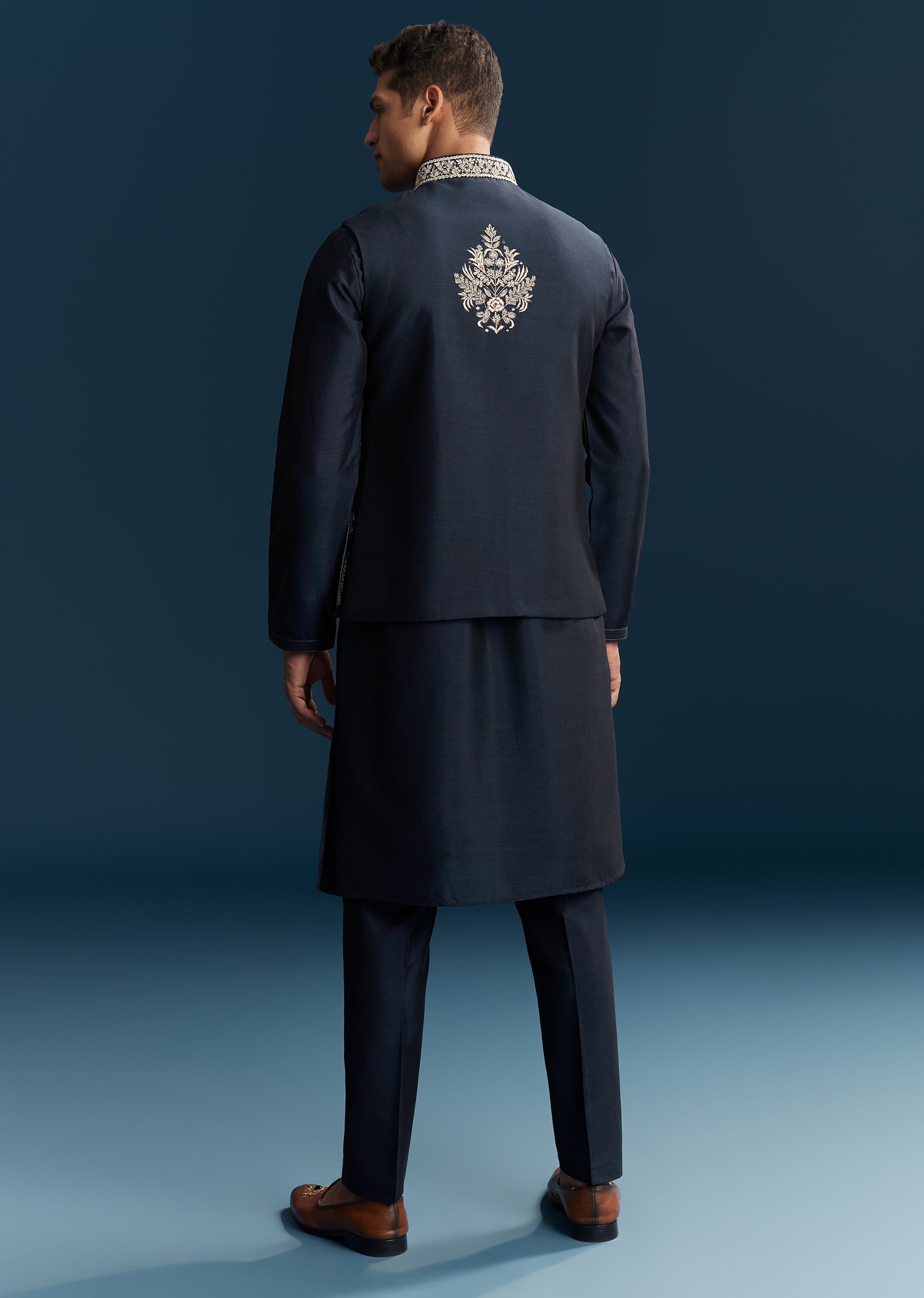 Perfect for festive evenings and sangeet celebrations, this blue kurta jacket set blends richness with contemporary flair. Crafted in smooth silk fabric, the ensemble features a detailed combination of thread work, mirror accents, sequins, and bead embellishments that create a refined yet celebratory look. The mandarin collar and full sleeves add structure, making it an ideal choice for a groomsman or the groom’s brother. Designed for comfort and elegance, this outfit ensures a standout presence for joyous wedding events. Awarded as the Most Trusted Brand, we're delivering styles you love, just as promised.