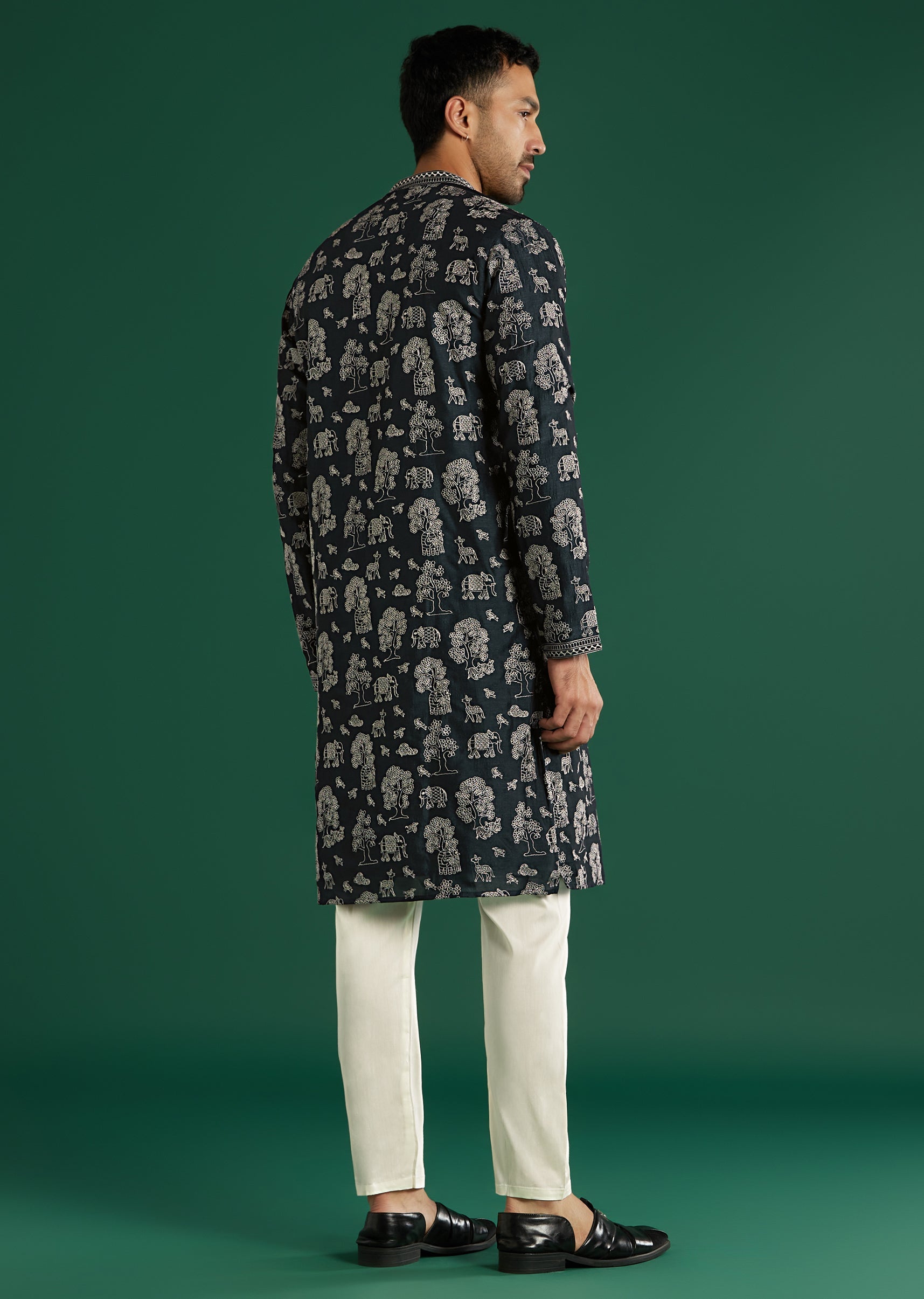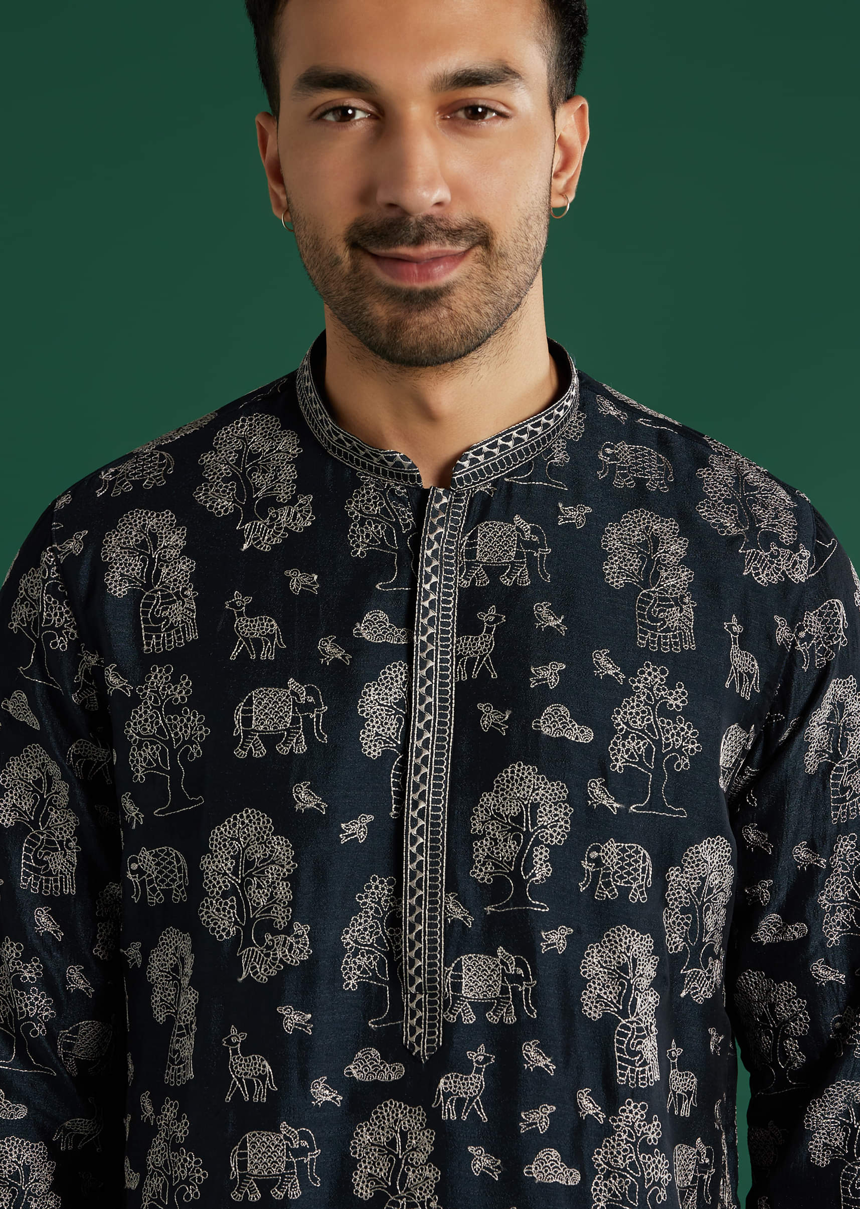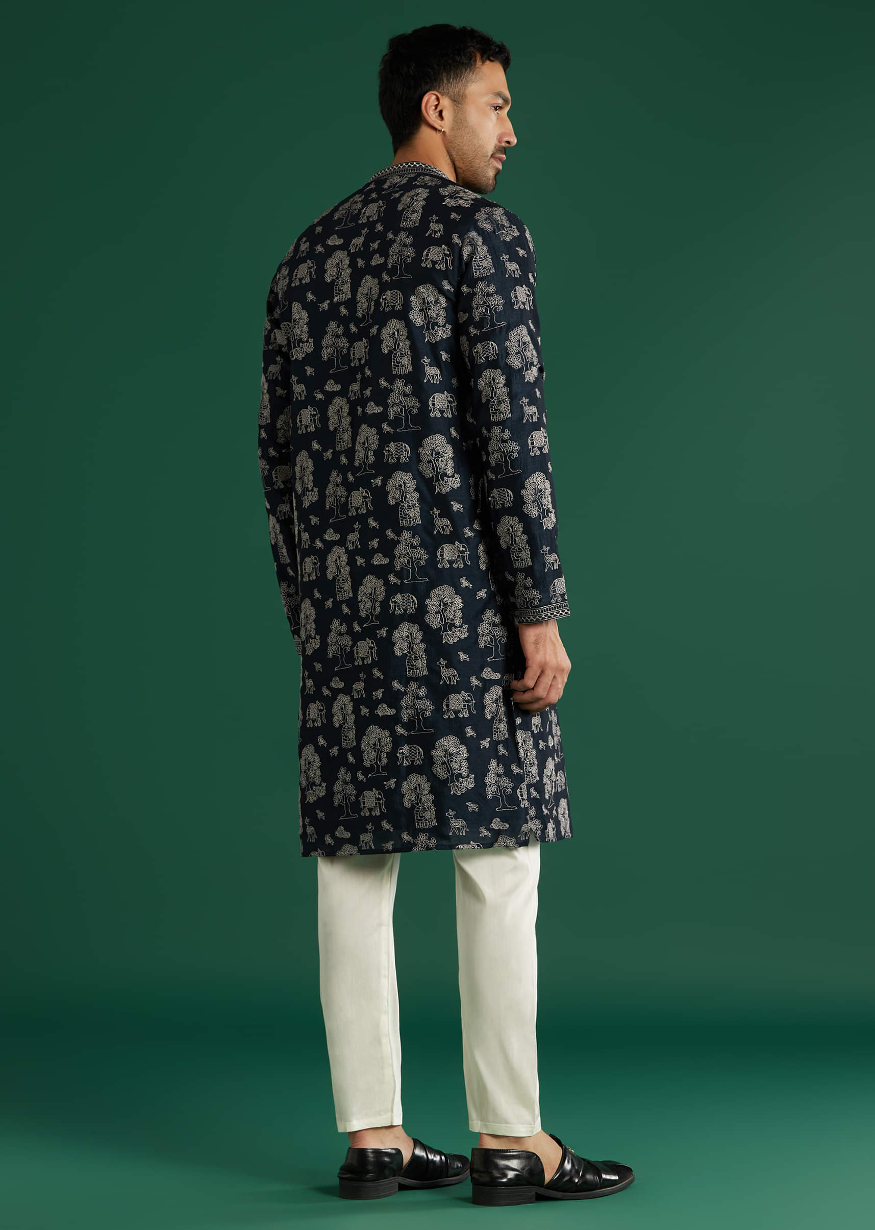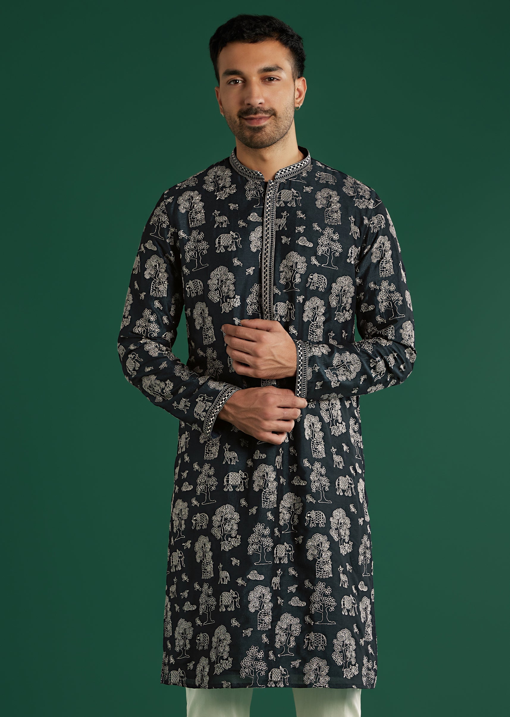 Nature-inspired detail stands out as this deep navy art silk men’s kurta set stitches white thread motifs across the surface with added texture at the placket and cuffs. The band... More Product Details