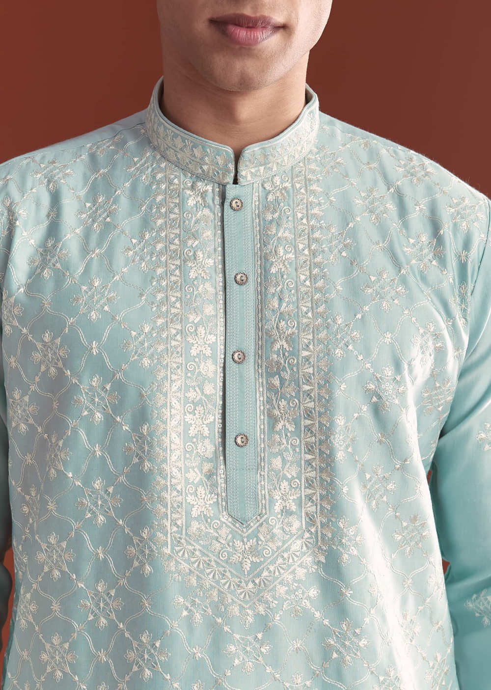 Blue Silk Kurta Set For Men With Fine Resham Embroidery