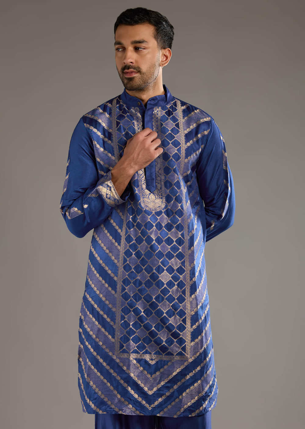 Blue Silk Kurta Set For Men With Handwoven Jacquard Work
