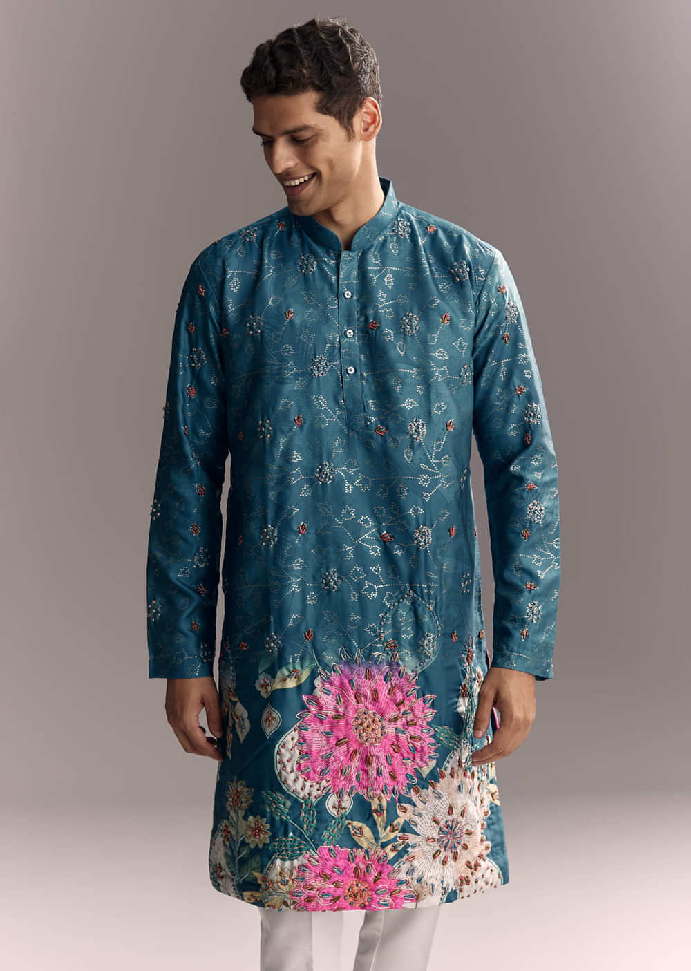Blue Silk Kurta Set For Men With Resham Embroidery