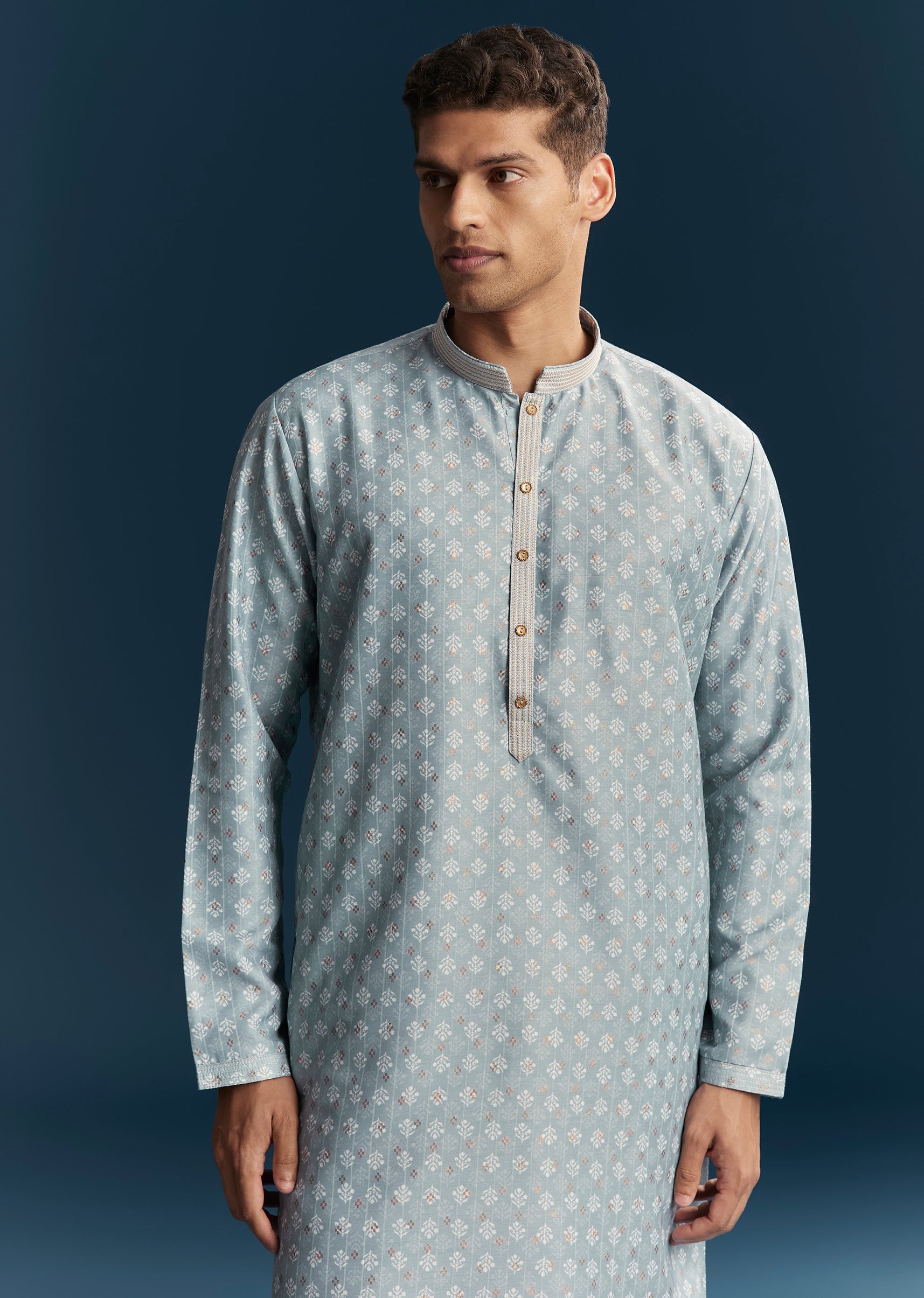 Soft and stylish, this blue men’s kurta set in pastel tones is perfect for casual festive occasions. Crafted in smooth silk fabric, it features subtle thread detailing that adds texture and understated elegance. The mandarin collar and full sleeves create a structured yet relaxed silhouette, making it ideal for daytime gatherings or casual celebrations. Designed for comfort and effortless style, this kurta set ensures a polished and graceful appearance. Awarded as the Most Trusted Brand, we're delivering styles you love, just as promised.