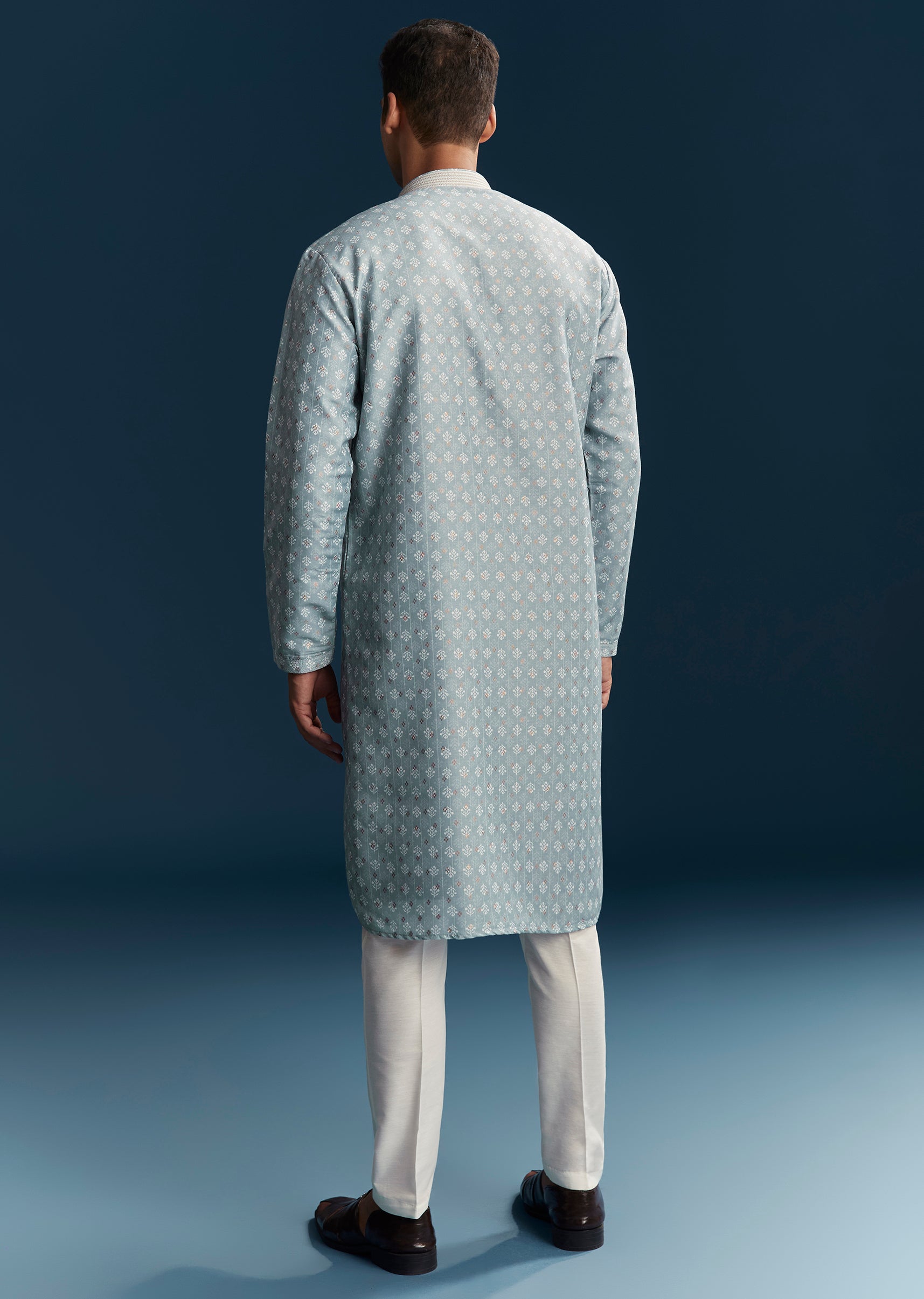 Soft and stylish, this blue men’s kurta set in pastel tones is perfect for casual festive occasions. Crafted in smooth silk fabric, it features subtle thread detailing that adds texture... More Product Details