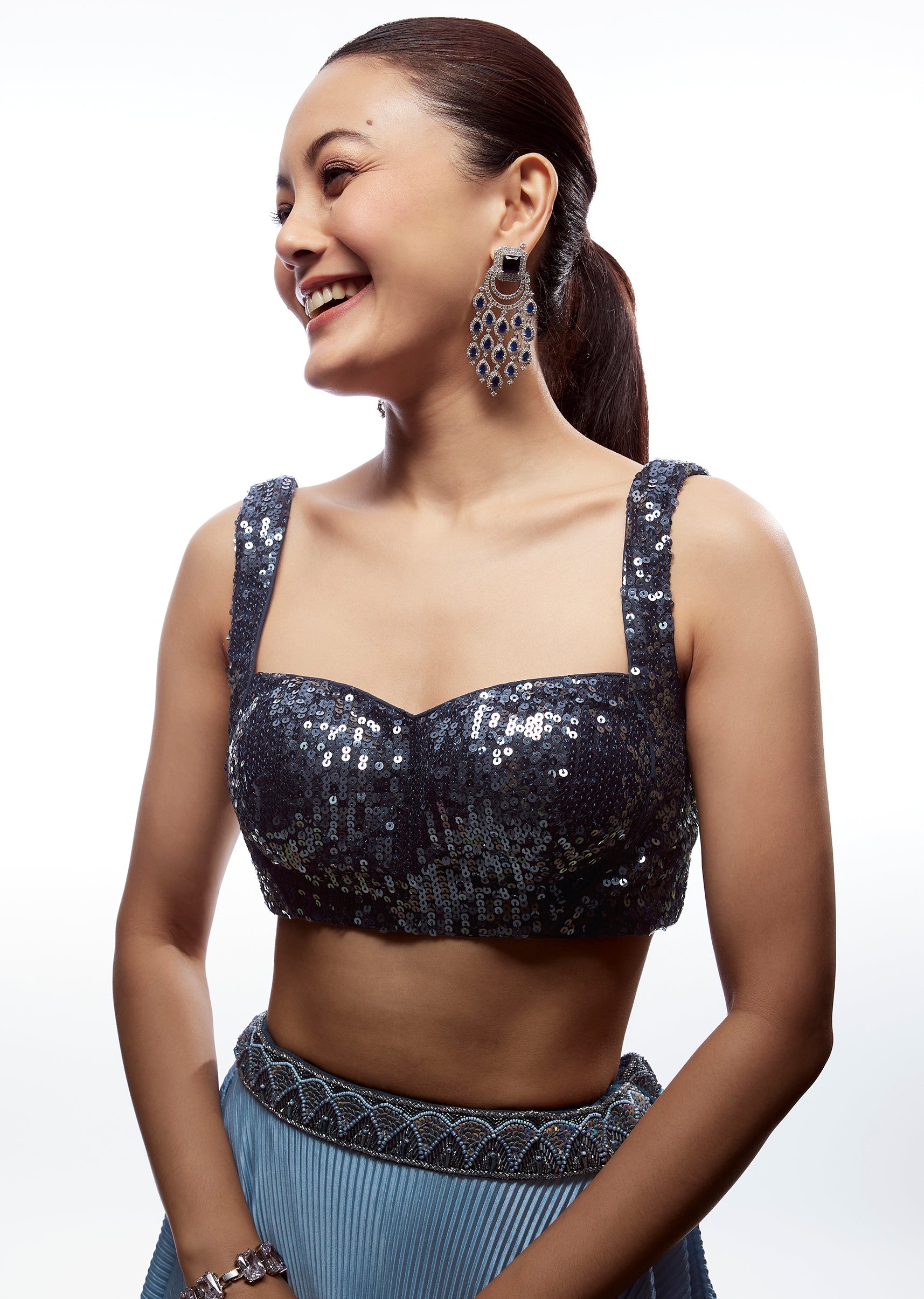 This sleeveless fancy blouse in blue has a structured square neckline and a back elastic detail for comfort. Finished with a back hook-eye opening, it’s a versatile pick for festive... More Product Details