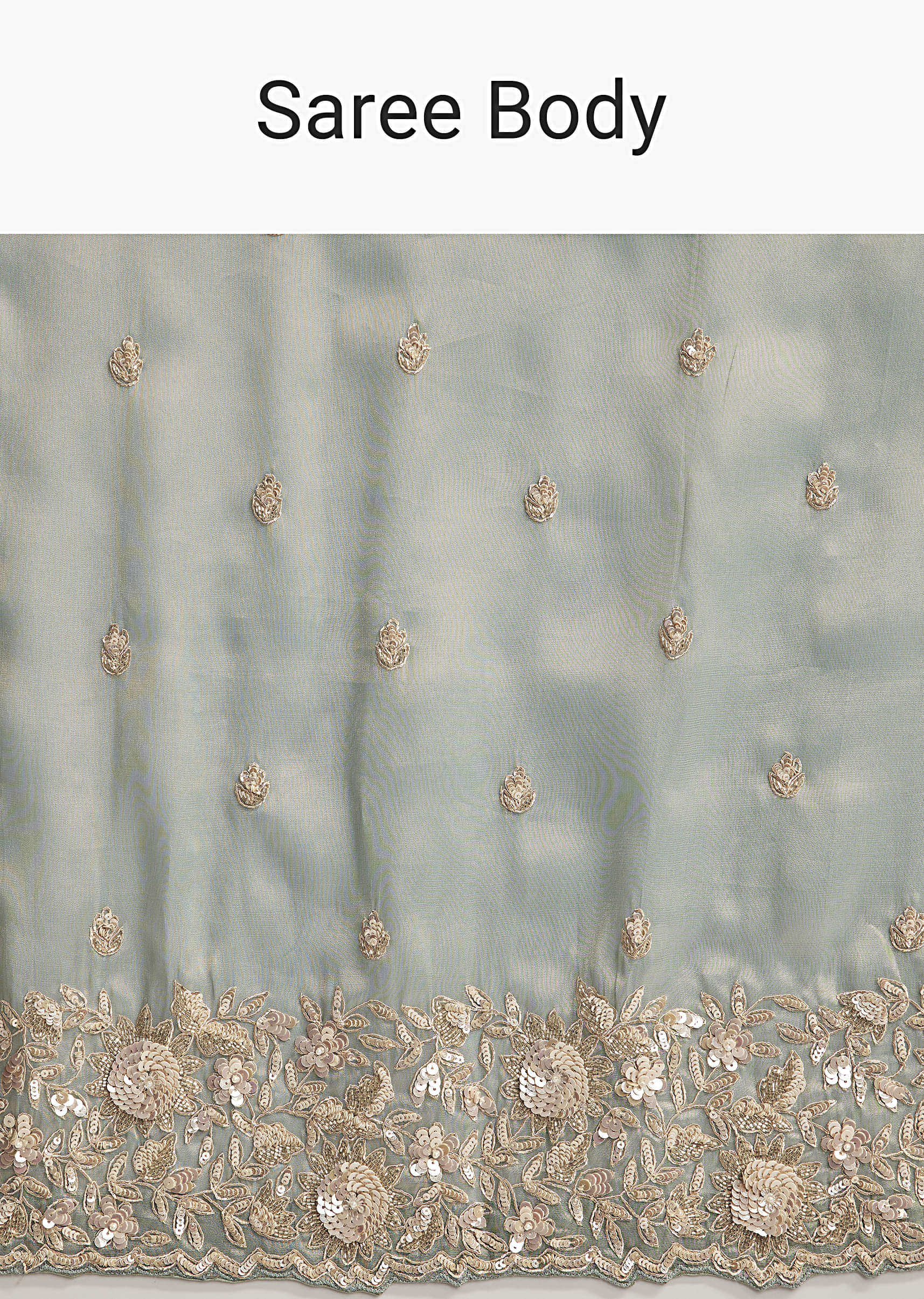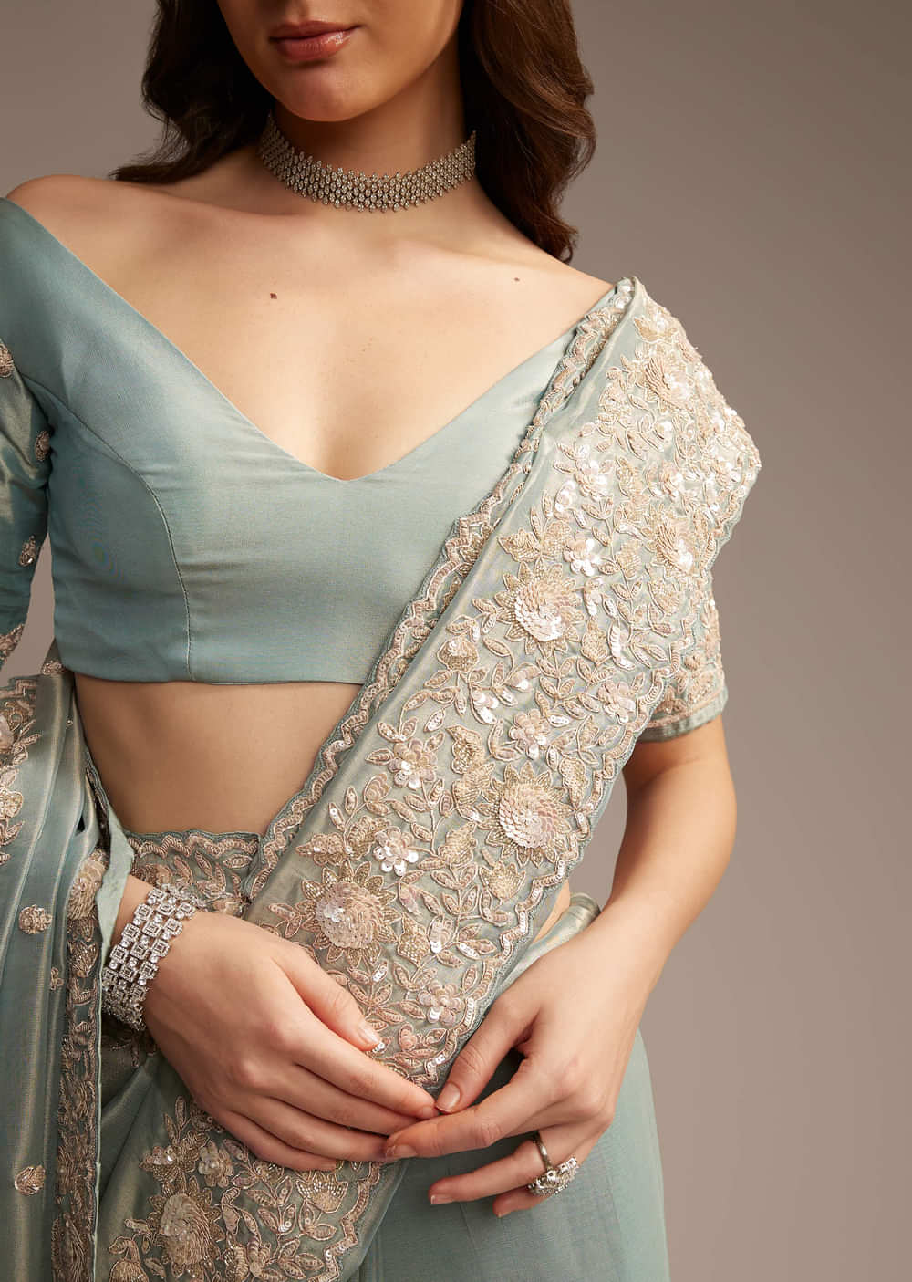 A fresh take on festive dressing, this blue tissue saree is detailed with a lavish floral embroidered cutwork border and sparkling butti work scattered all over the drape. Accented with... More Product Details