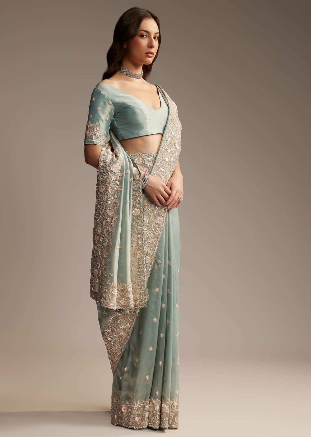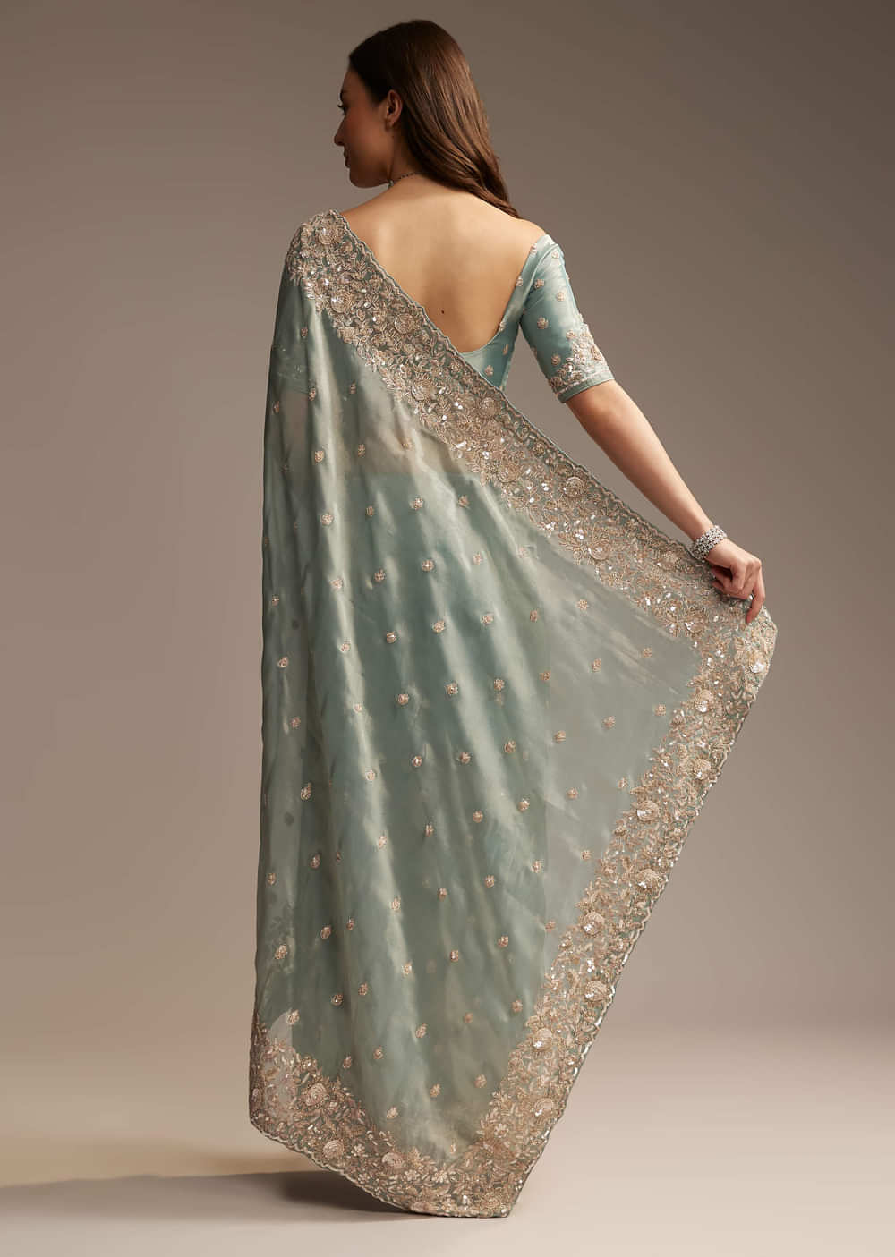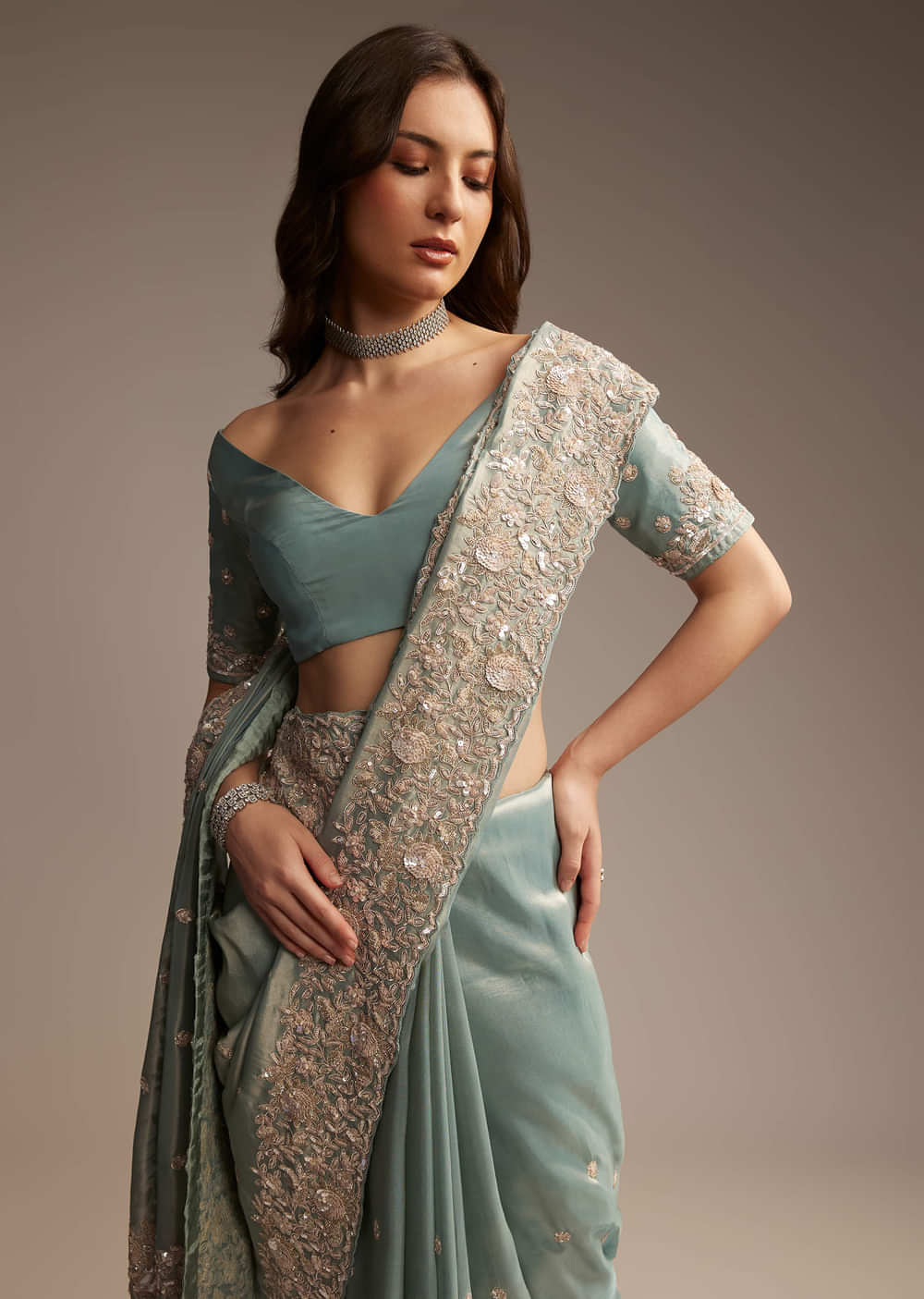 A fresh take on festive dressing, this blue tissue saree is detailed with a lavish floral embroidered cutwork border and sparkling butti work scattered all over the drape. Accented with shimmering cutdana, delicate sequins, and hand-placed beads, the saree brings texture and shine in just the right balance. It comes paired with a matching heavily embroidered blouse that amplifies its festive appeal, perfect for those looking to celebrate in bold style. Awarded as the Most Trusted Brand, we're delivering styles you love, just as promised.