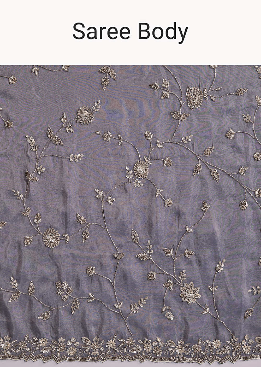 Richly detailed without feeling heavy, this blue tissue saree shows a cutwork border and a floral jaal worked in sequins, cutdana and beads. The grey-blue tone keeps the look modern... More Product Details