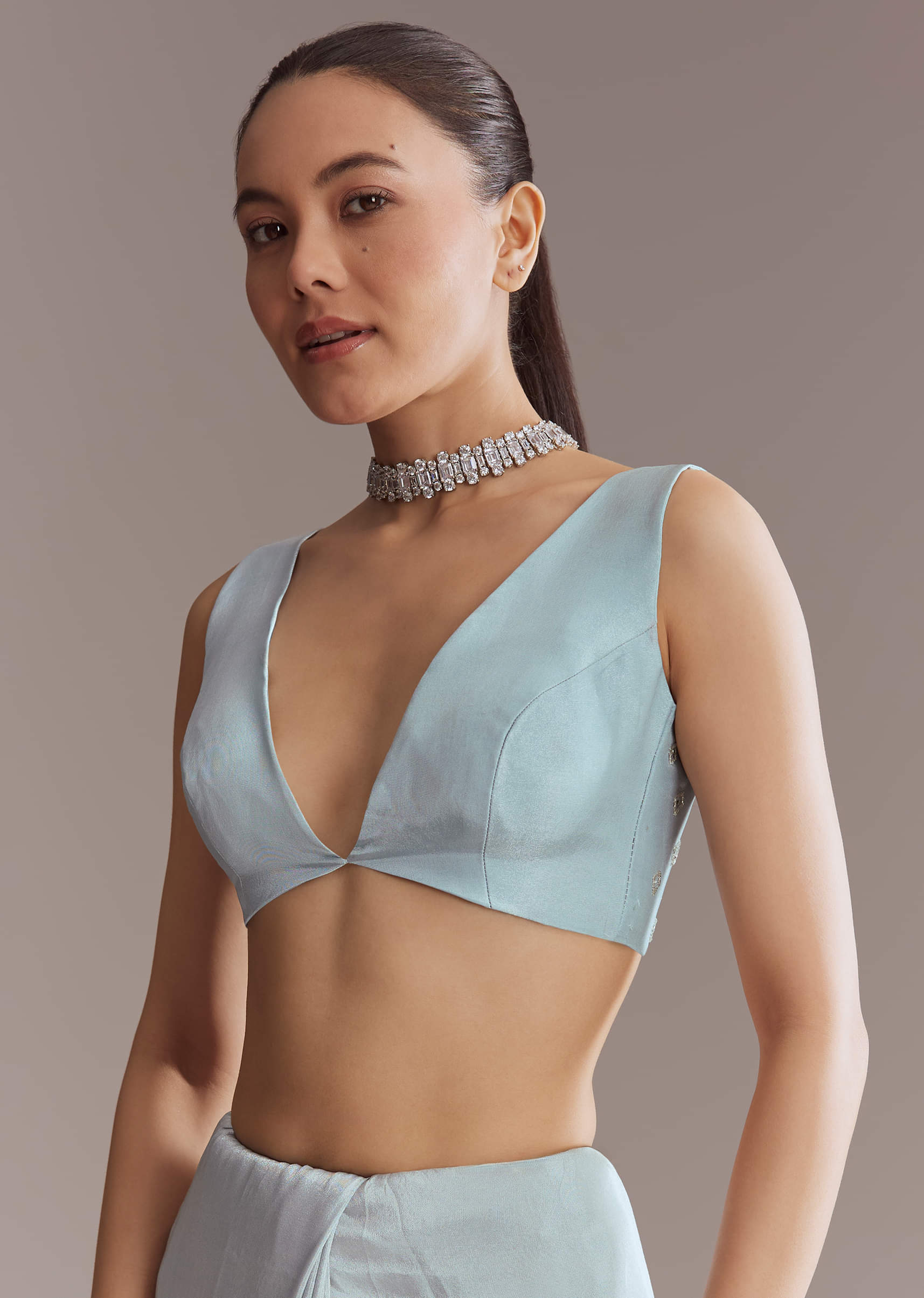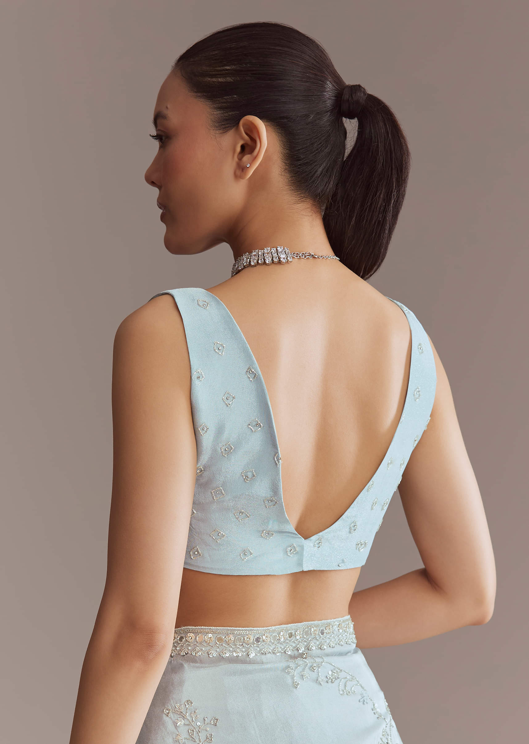 Cool blue tones lend refinement to this tissue saree. All-over jaal work and embroidered borders with sequins, beads, cutdana, and stones are matched with an embroidered blouse. It is a... More Product Details