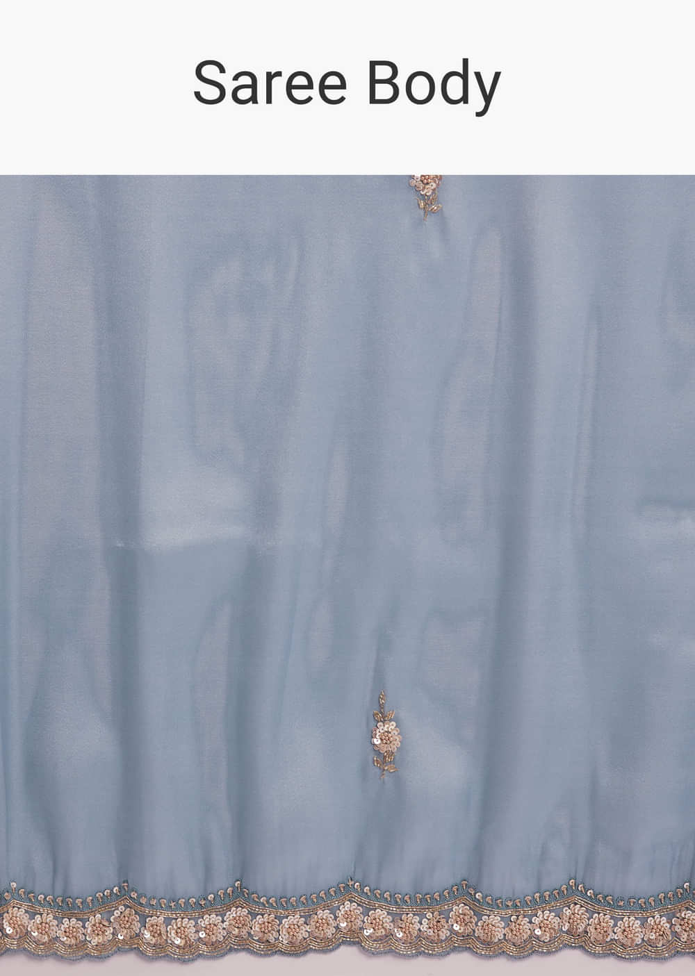 If shine and structure are on the brief, this blue tissue silk saree delivers a glossy base with refined embellishment. The scallop border and butti are embroidered with cutdana, sequins... More Product Details
