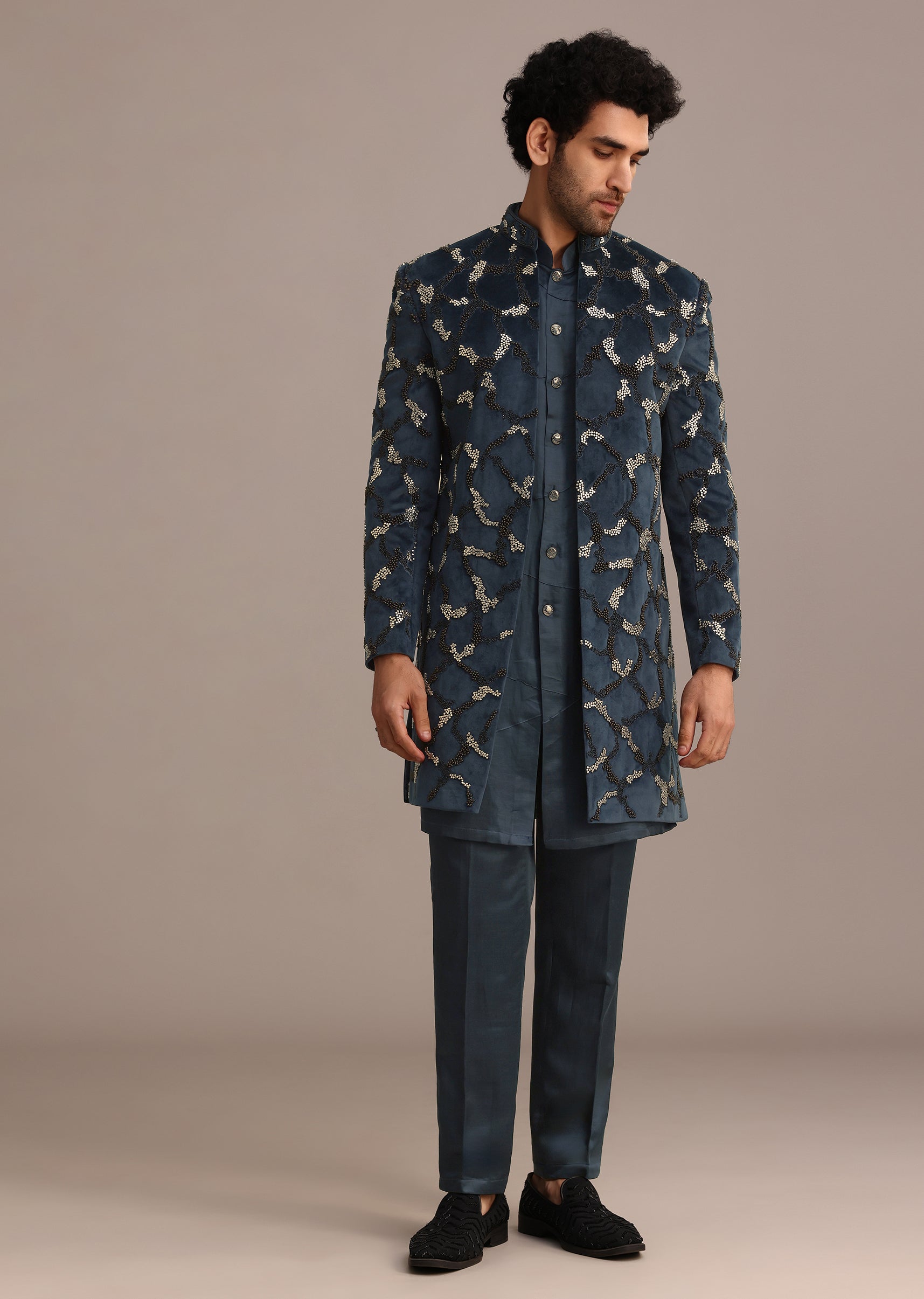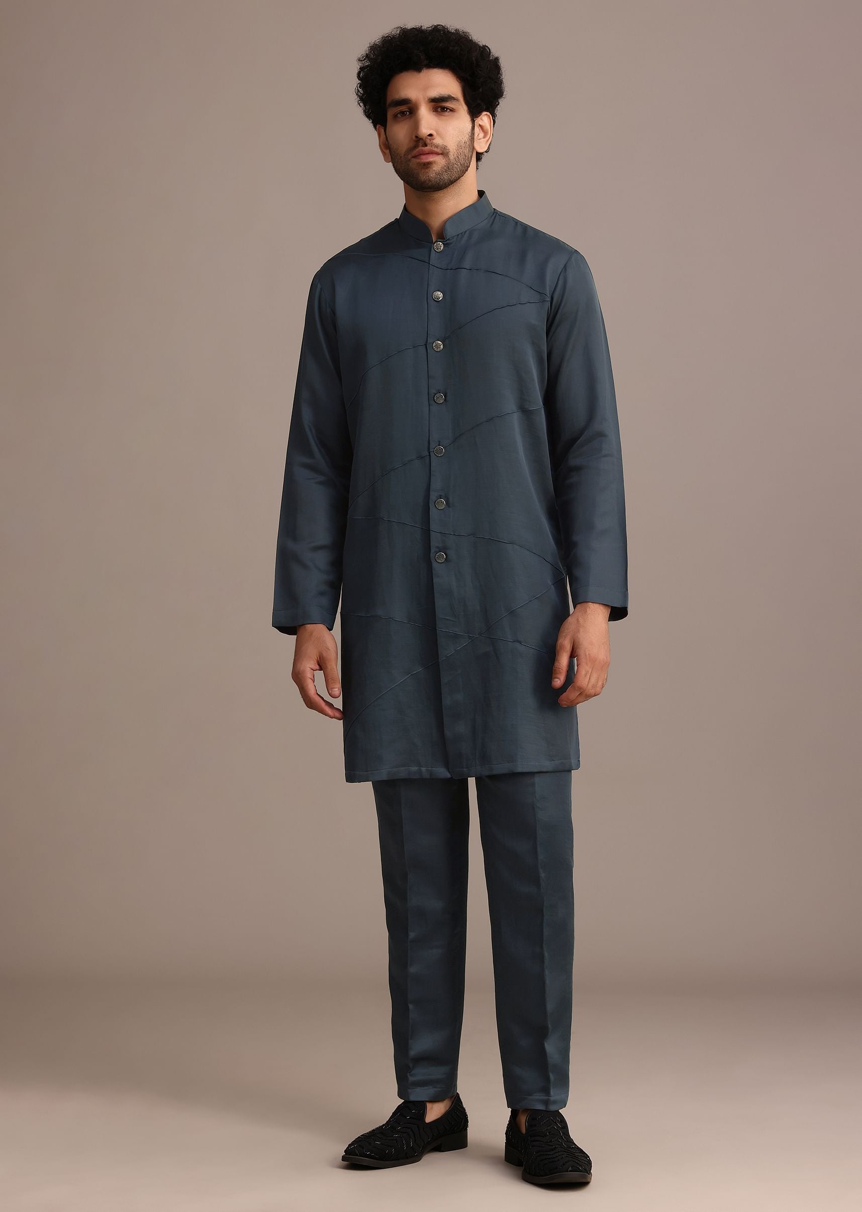 - Featuring a mandarin collar, full sleeves and front button placket elevate, the jacket comes with a kurta and coordinating pants.