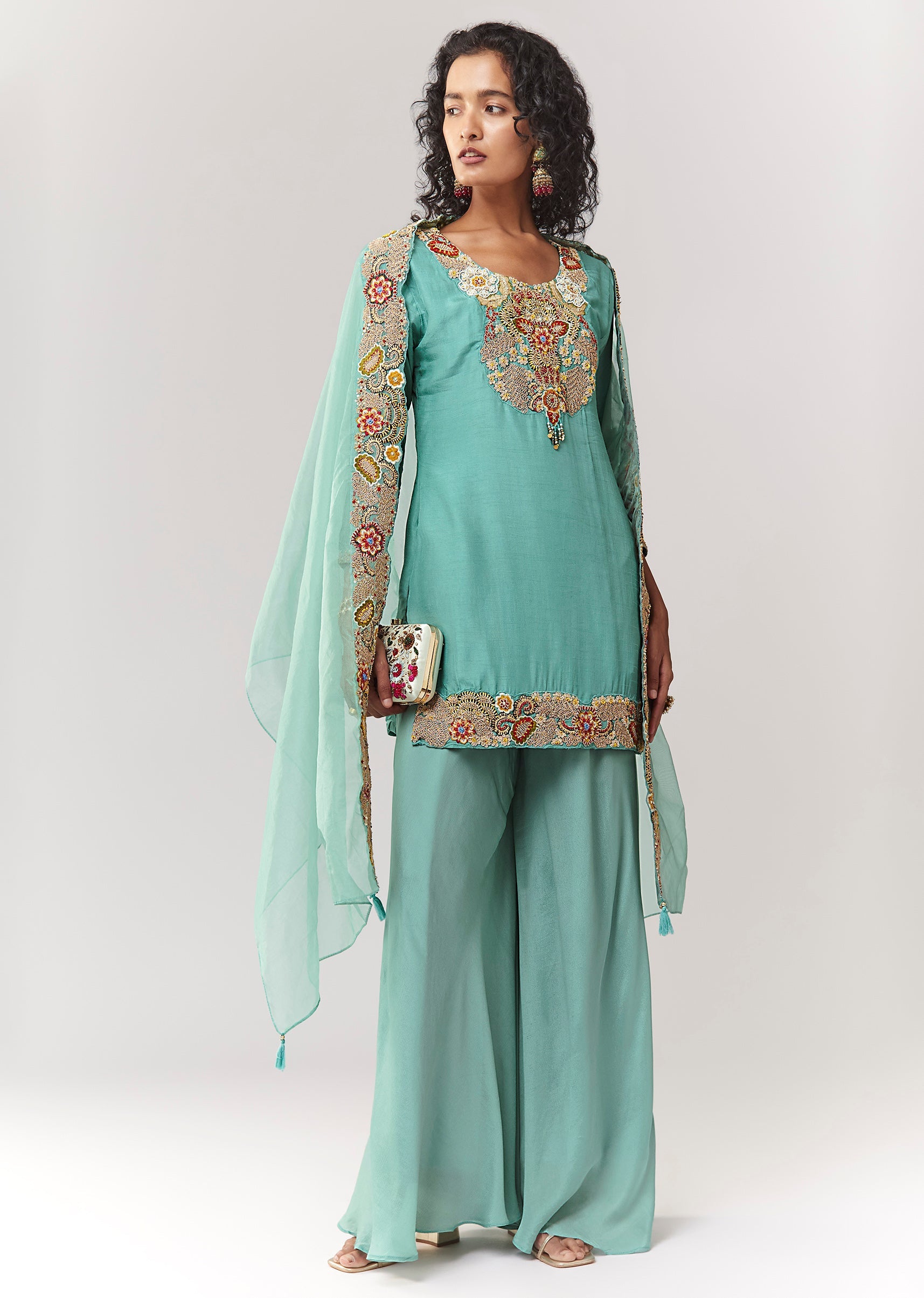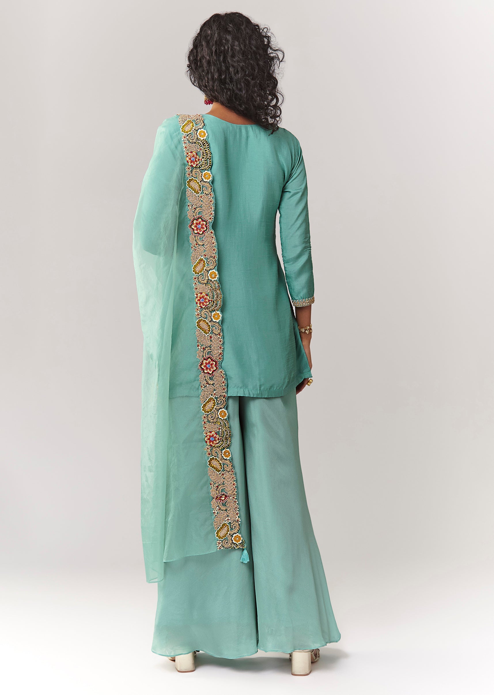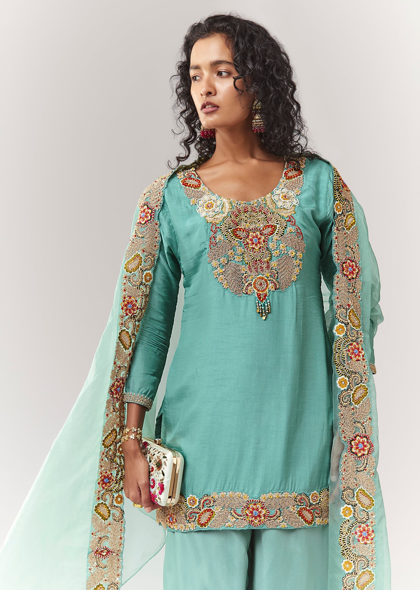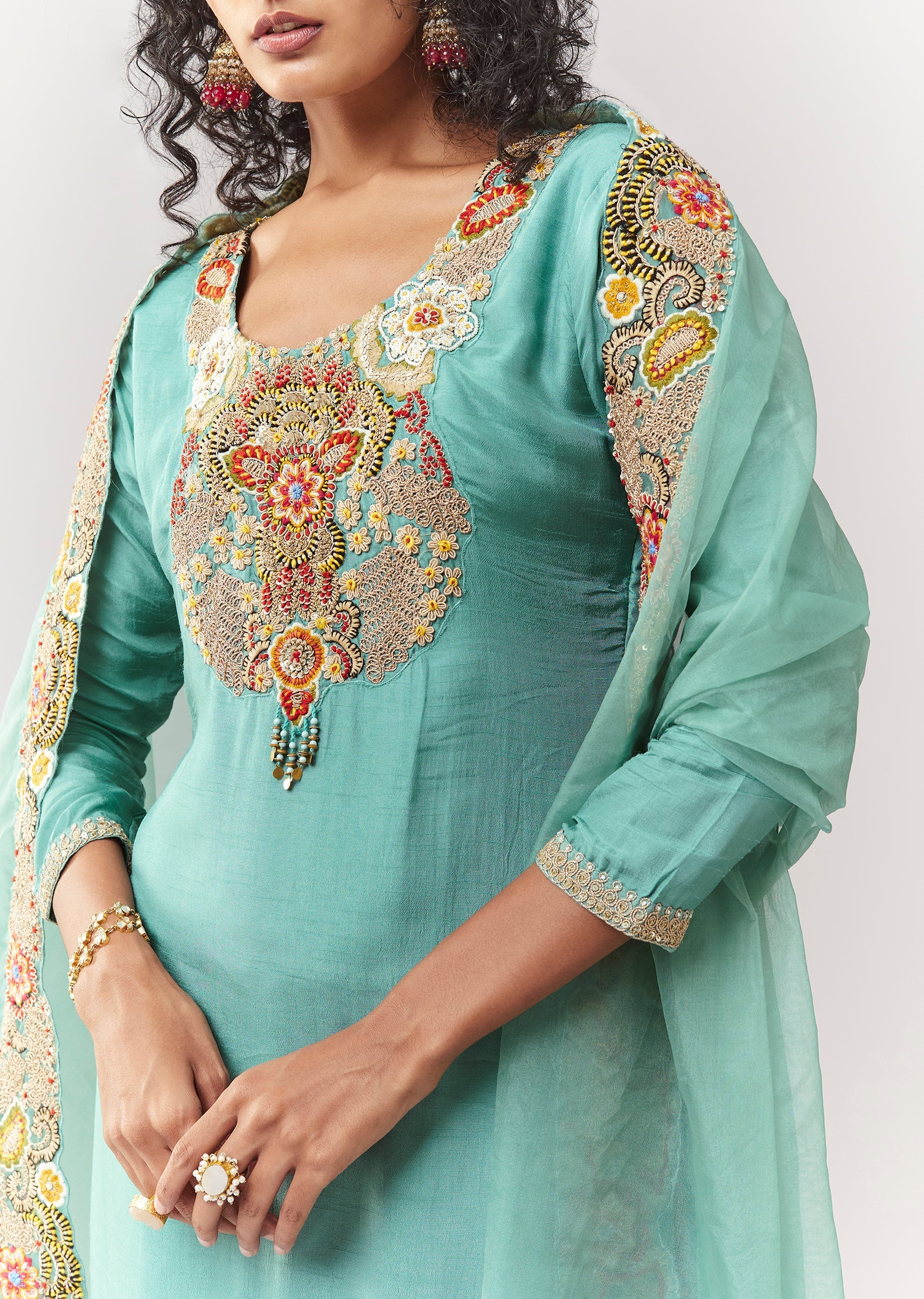 Blue Zardosi And Thread Work Straight Kurta Palazzo Set With Dupatta