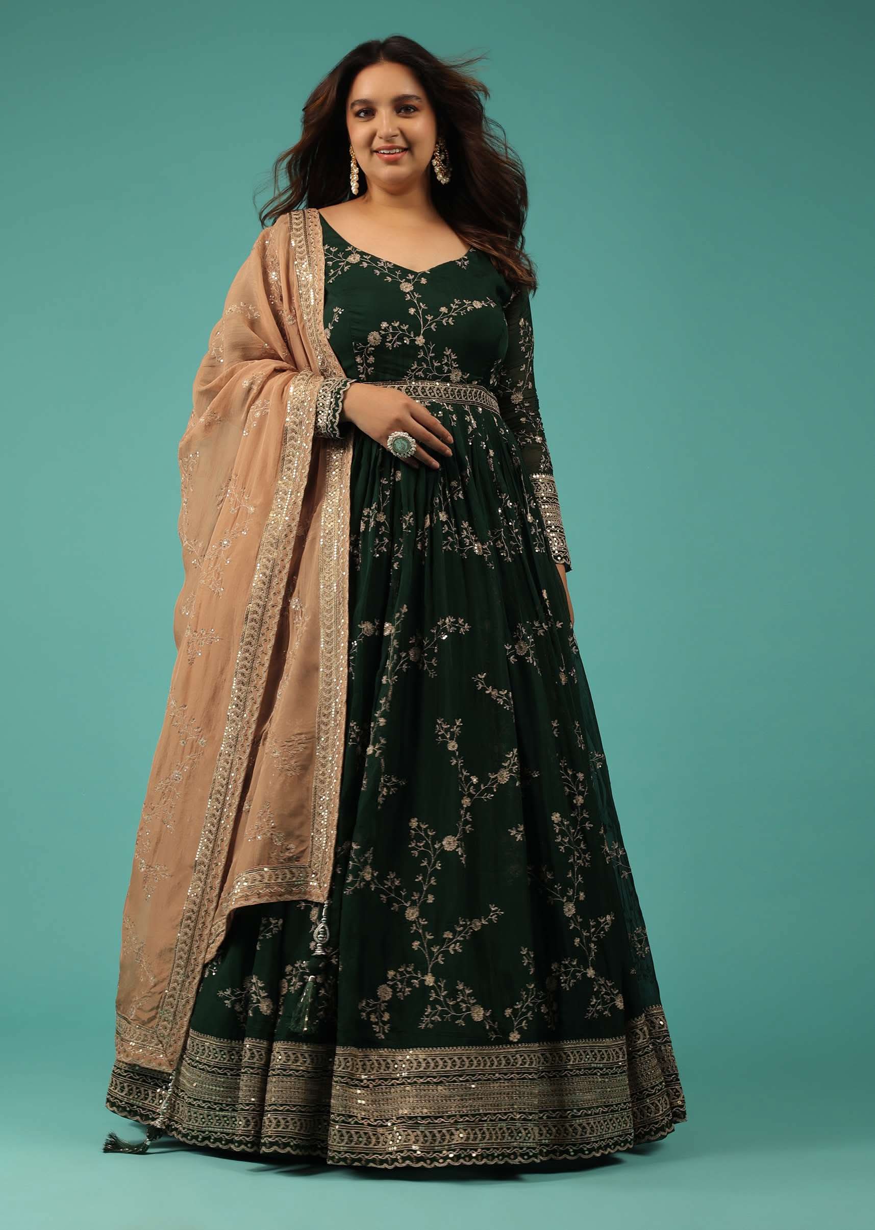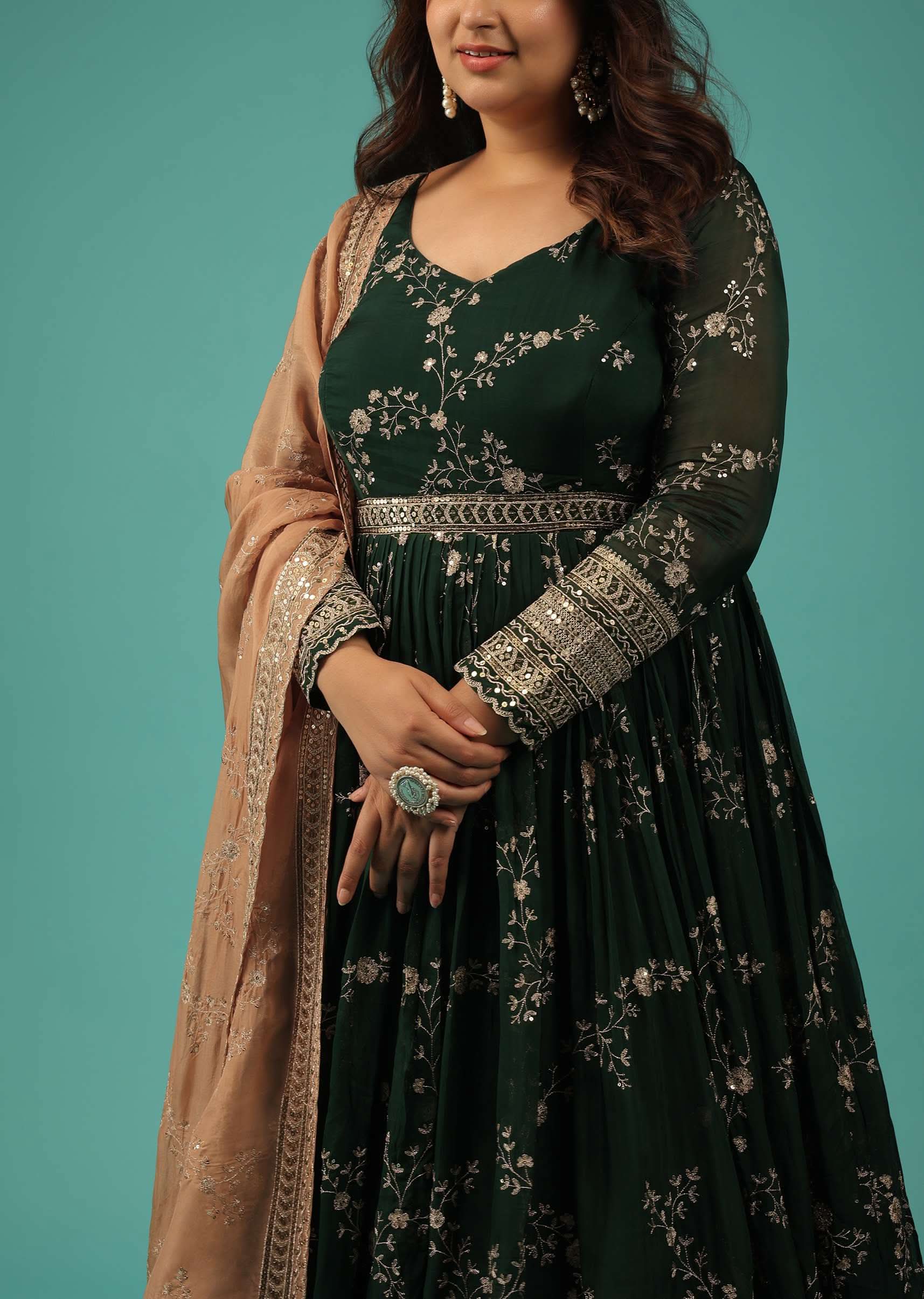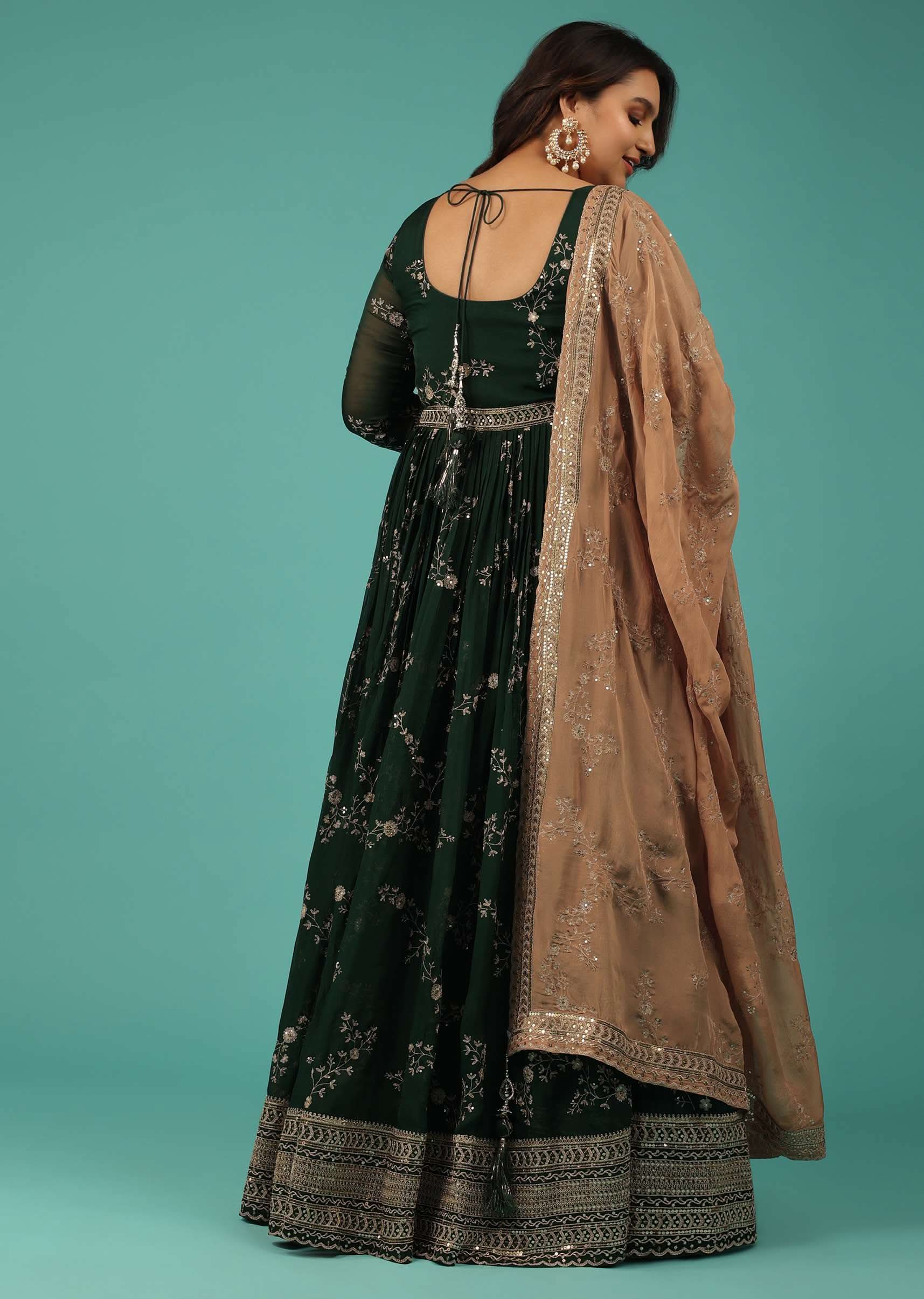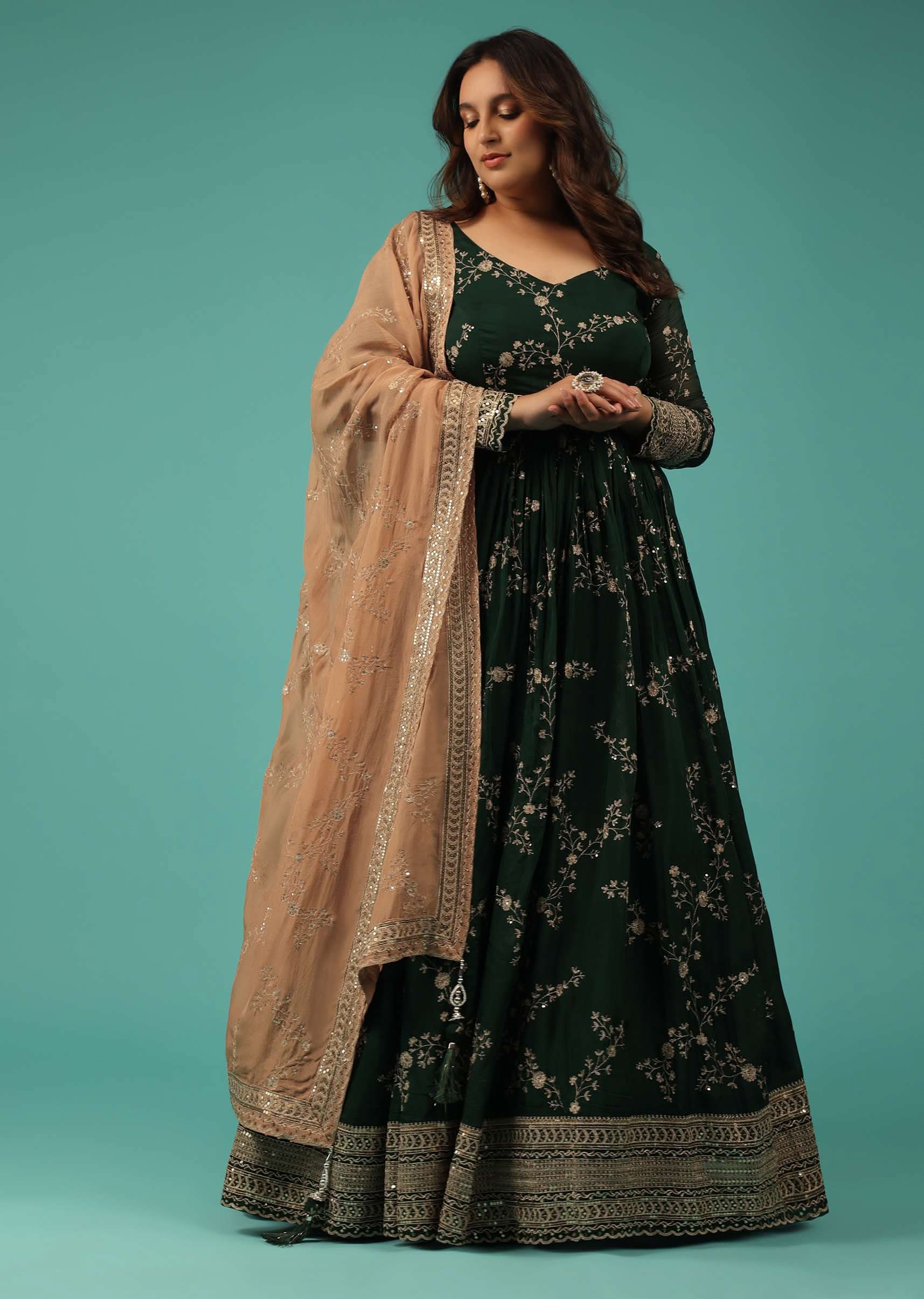 Bottle Green Silk Anarkali Suit With Zari And Sequins Work Along With Embroidered Floral Jaal