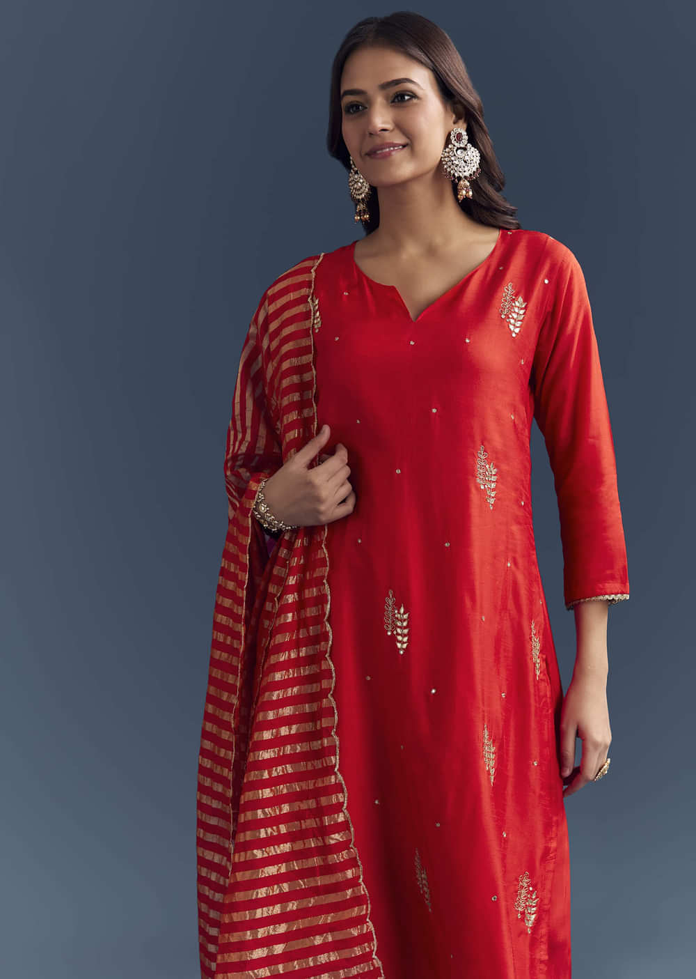 Bright Orange Silk Kurta Set With Zari And Gota Work