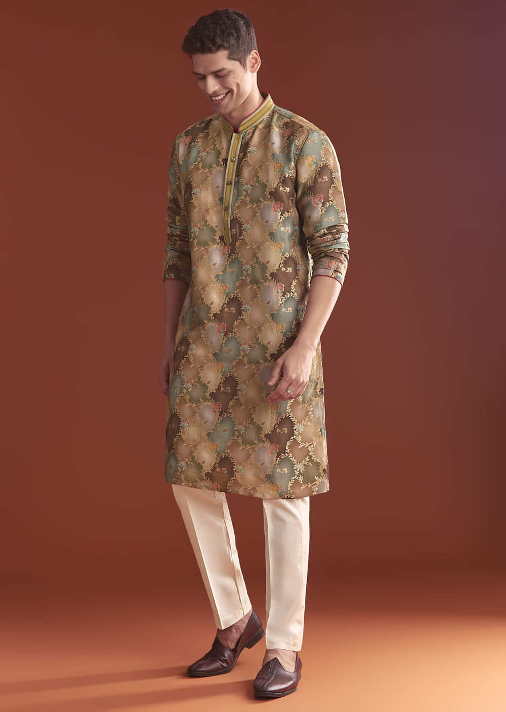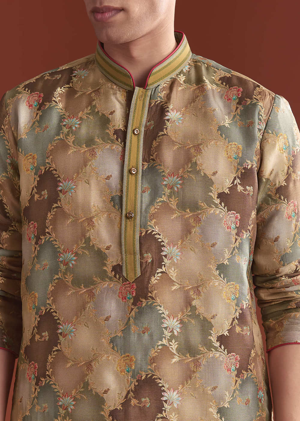Brown Banarasi Kurta Set For Men With Vine Pattern