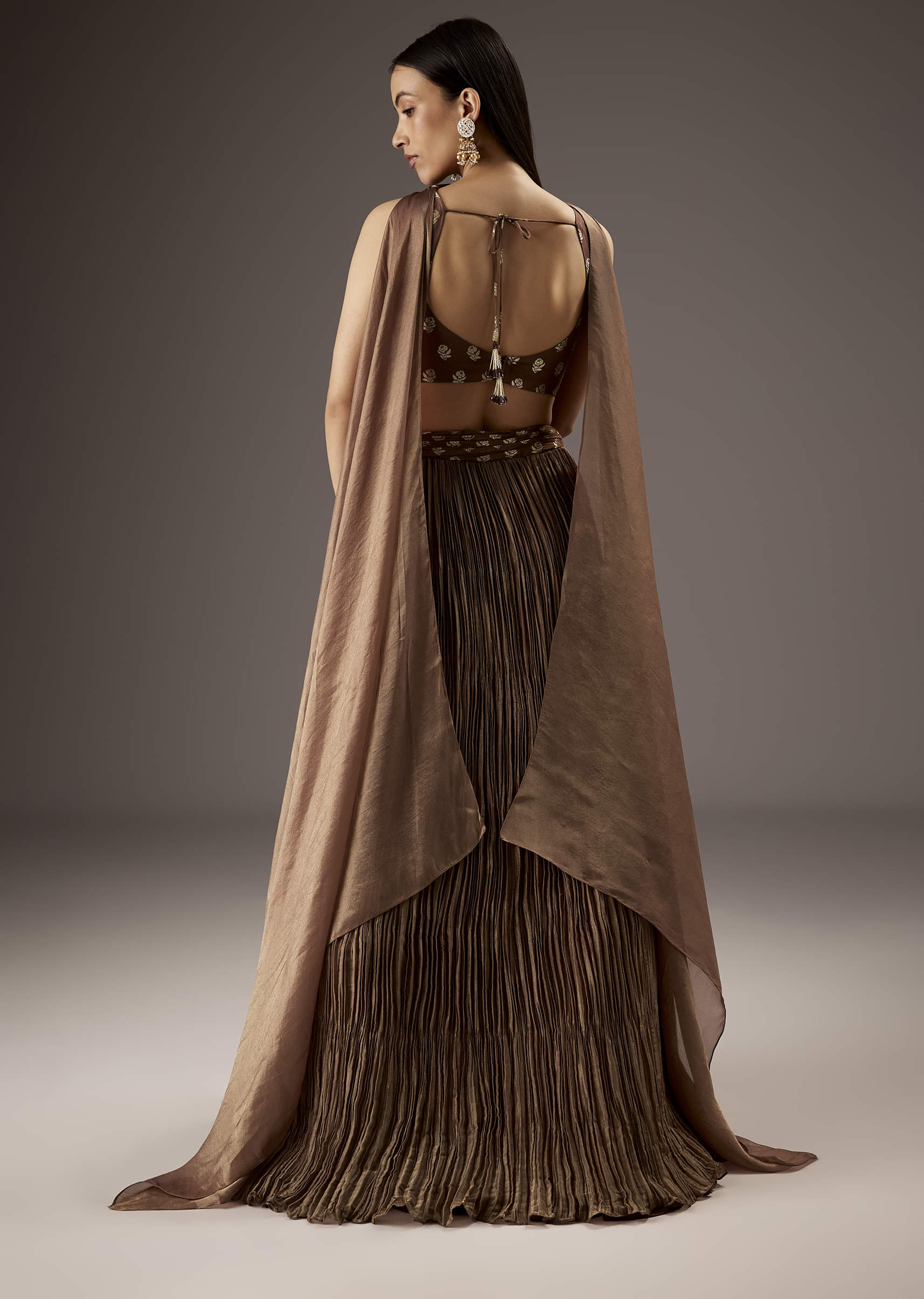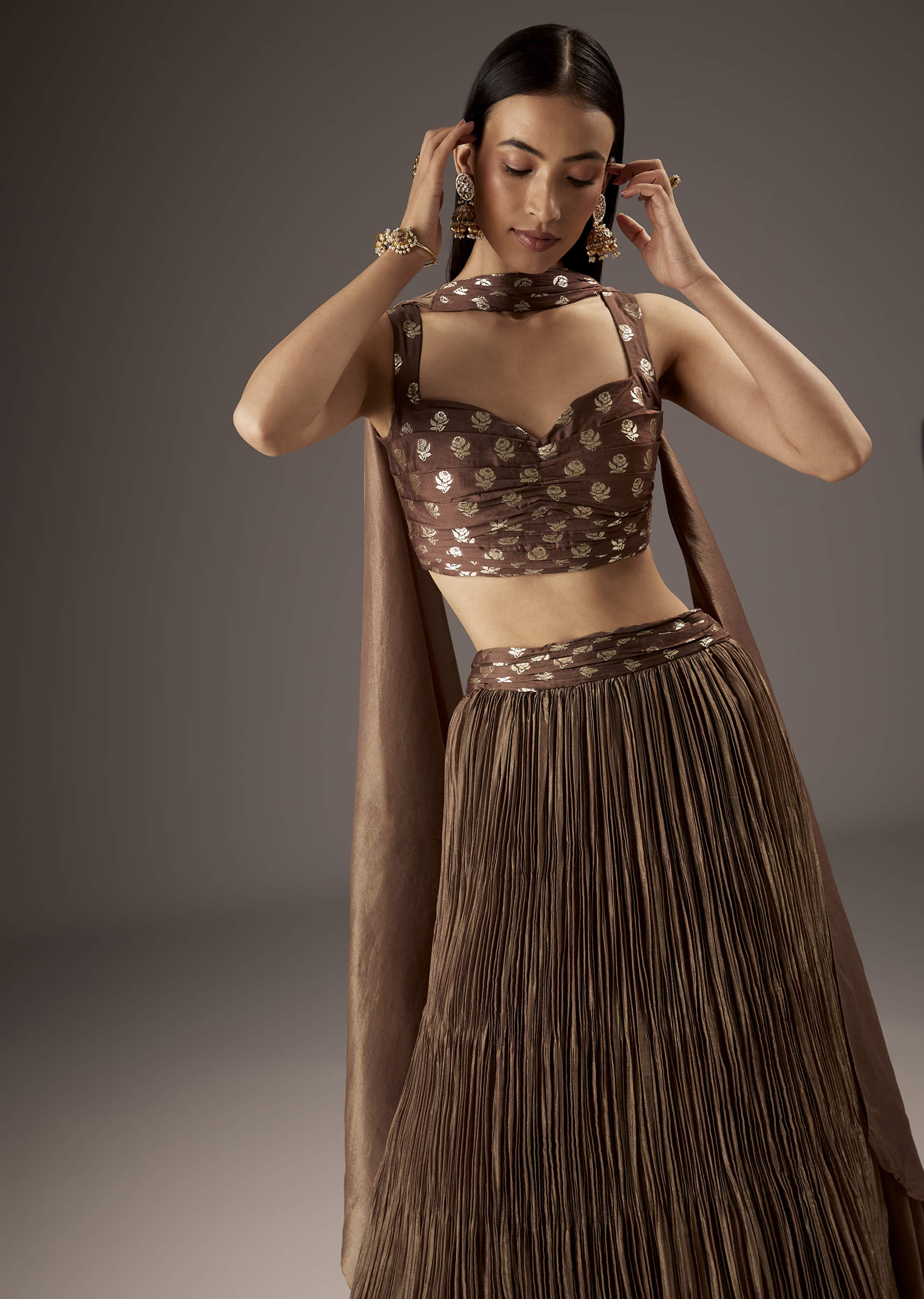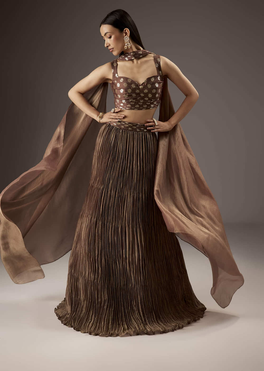 Rich and regal, this brown Banarasi silk lehenga is the definition of understated luxury. Ideal for sangeet, reception, or engagement functions. Awarded as the Most Trusted Brand, we're delivering styles you love, just as promised.