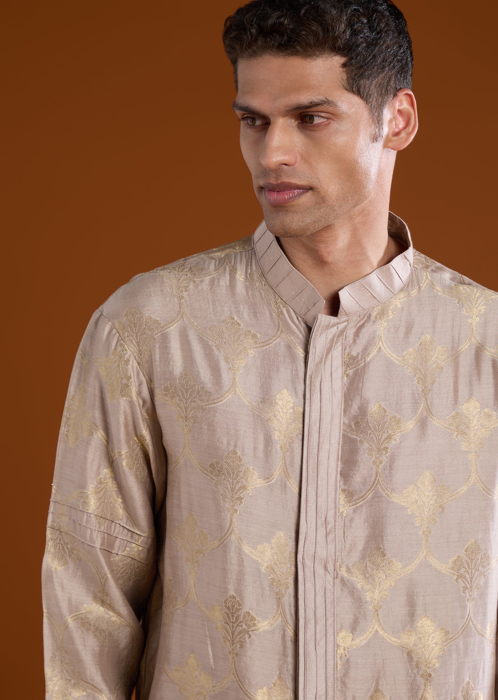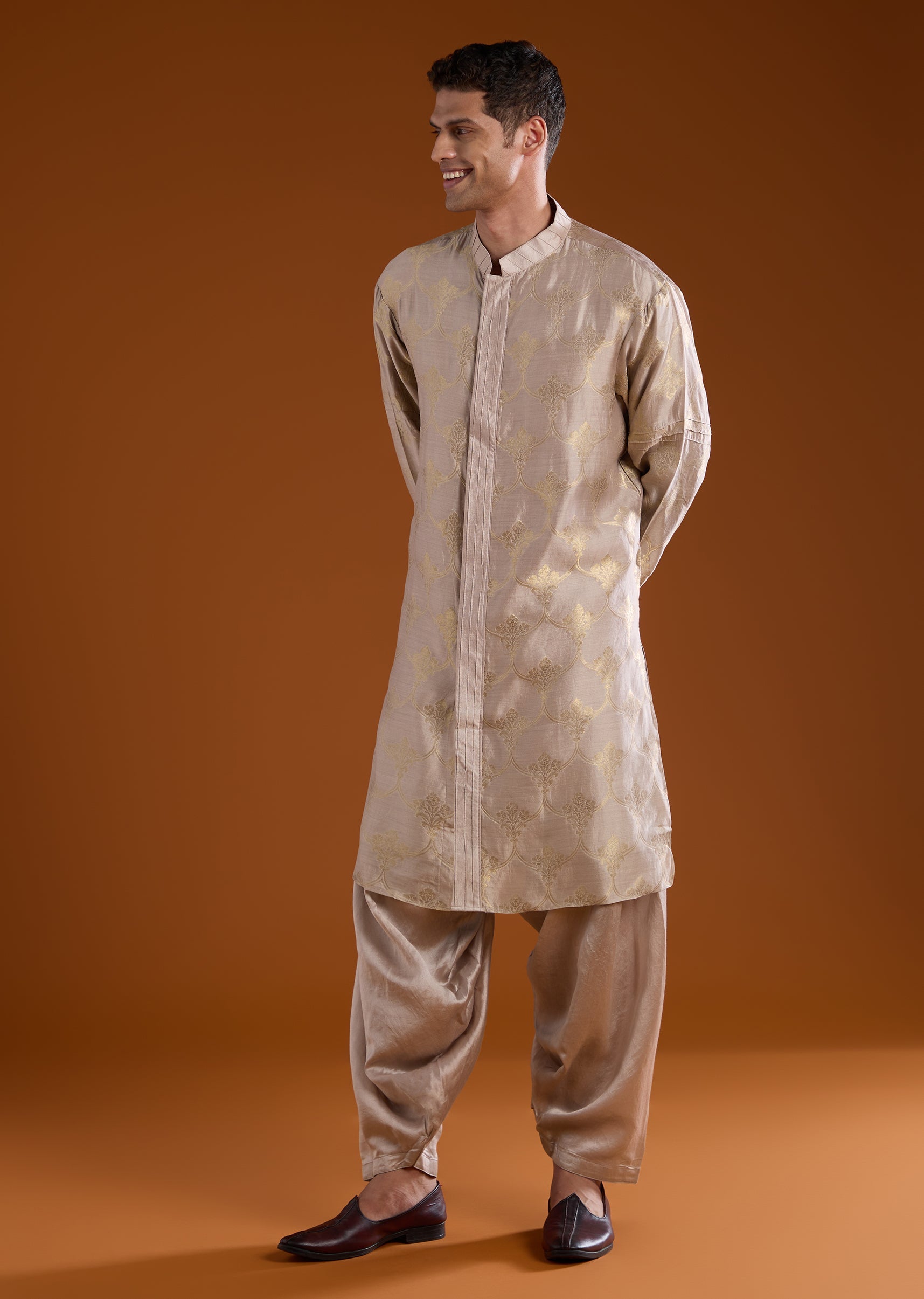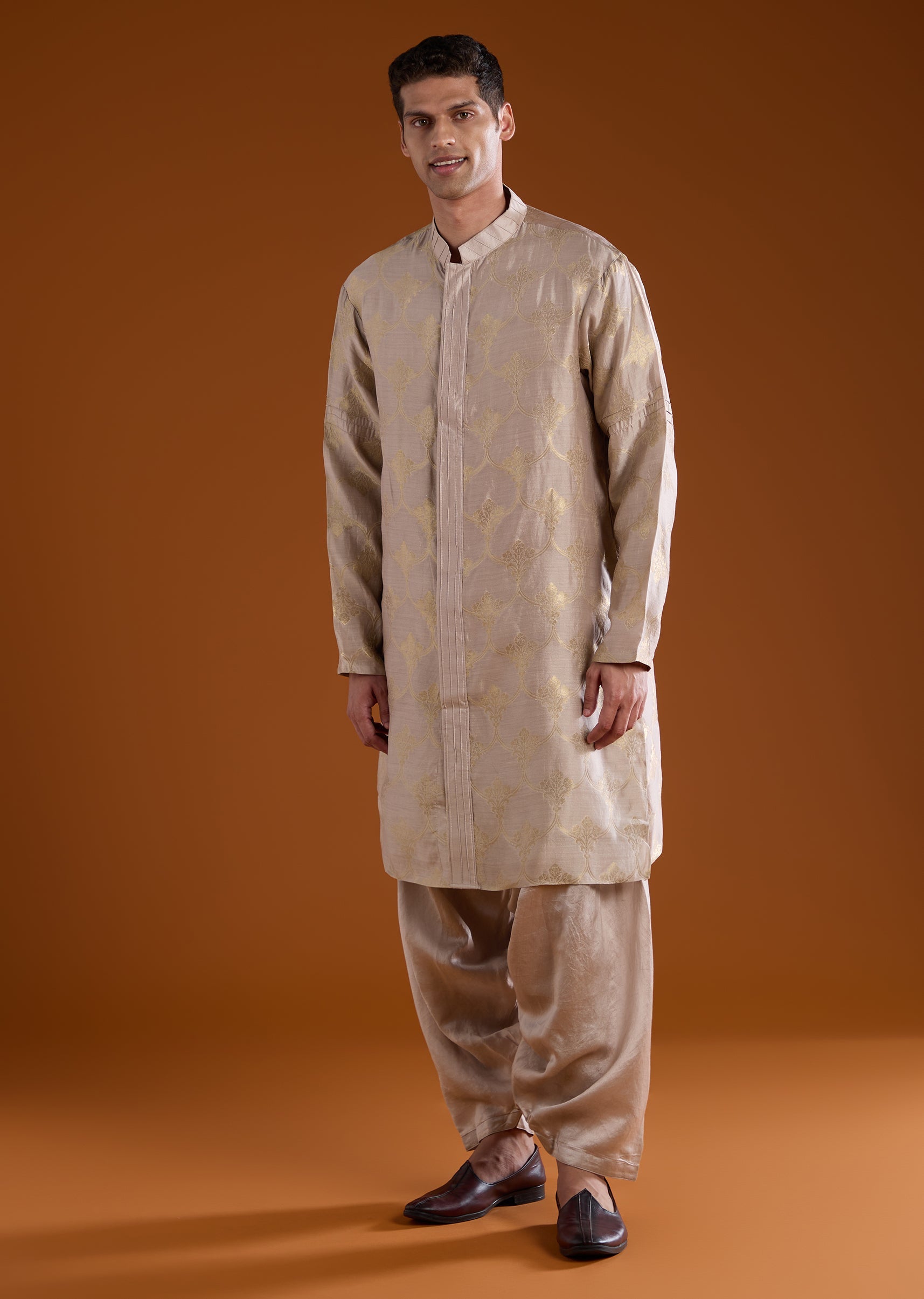 Bring timeless charm to your festive wardrobe with this banarasi silk kurta set adorned with shimmering cut dana and sequin detailing that enhances its rich traditional weave. The full sleeve kurta features a classic mandarin collar and a front hook eye closure, offering a refined and graceful silhouette. Paired with comfortable drawstring pants, the ensemble is ideal for weddings, cultural events, and celebratory occasions. Awarded as the Most Trusted Brand, we're delivering styles you love, just as promised.