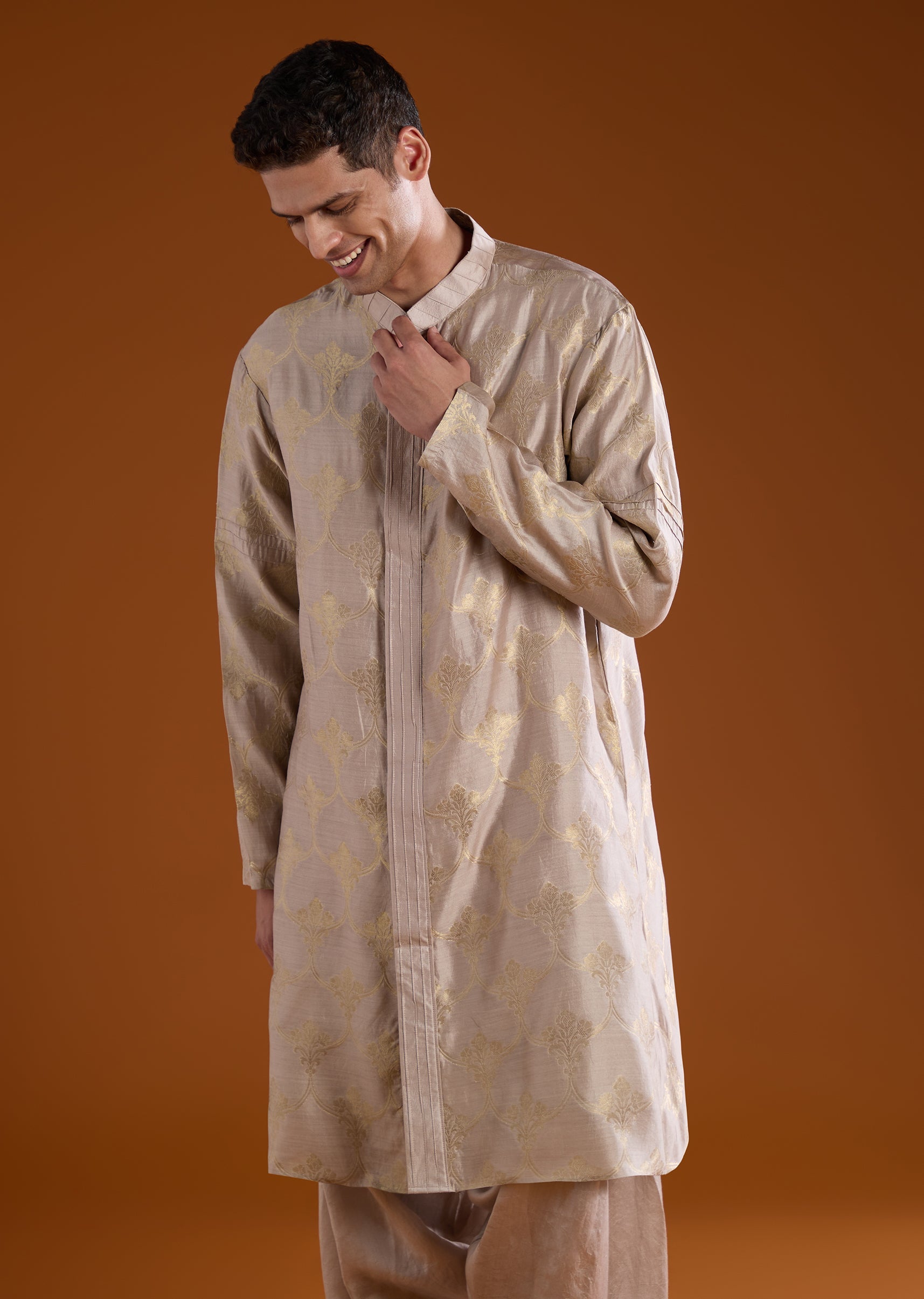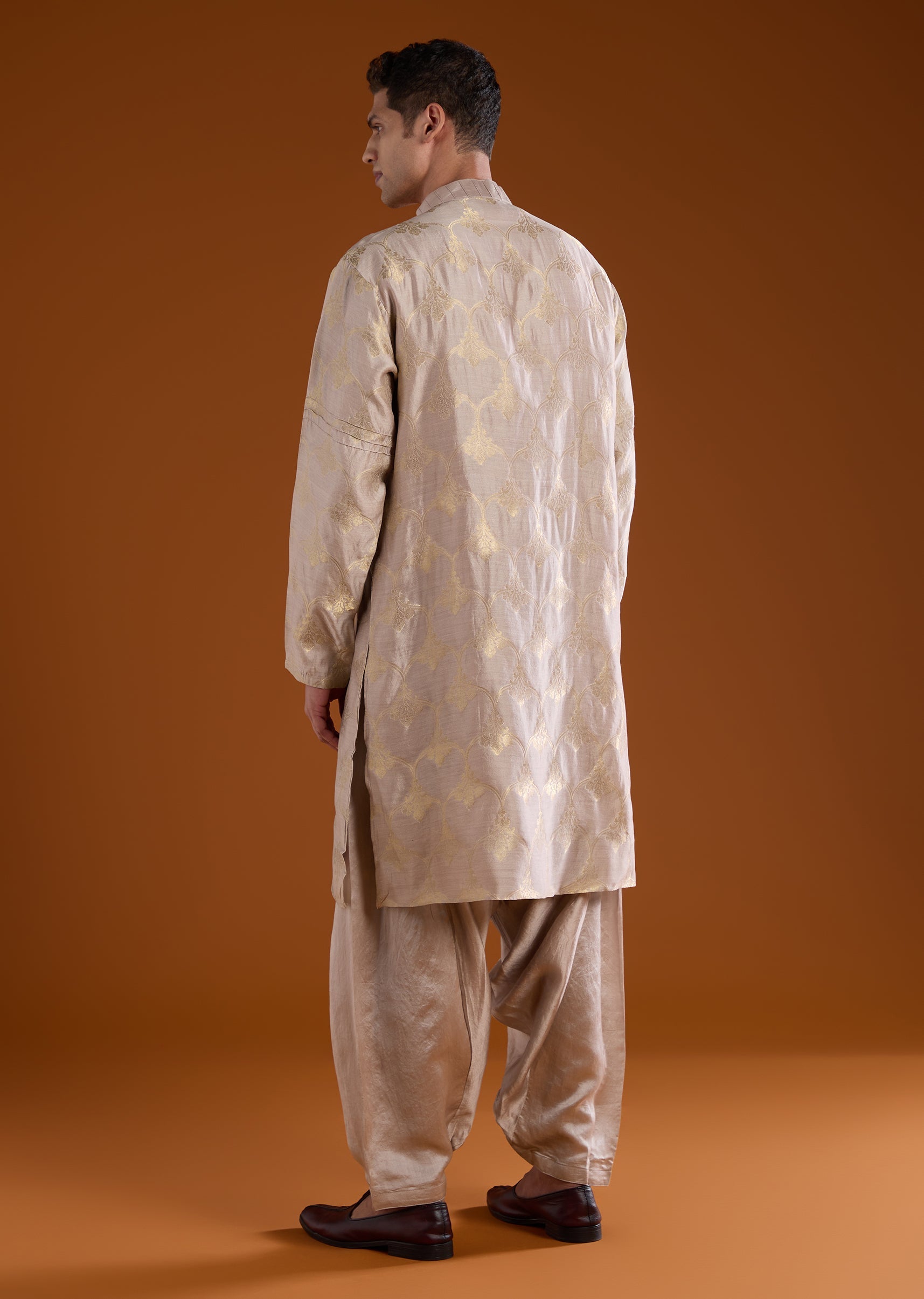 Bring timeless charm to your festive wardrobe with this banarasi silk kurta set adorned with shimmering cut dana and sequin detailing that enhances its rich traditional weave. The full sleeve... More Product Details