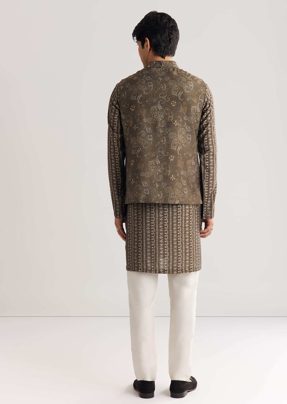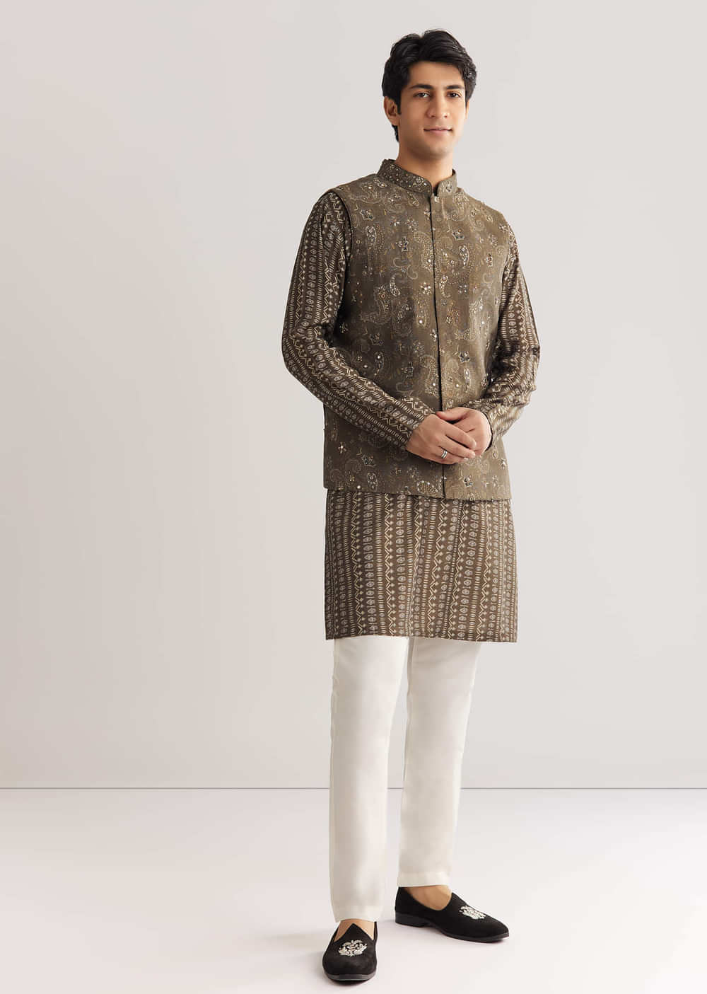 Brown Chanderi Silk Jacket Kurta Set With Mirror And Stone Work