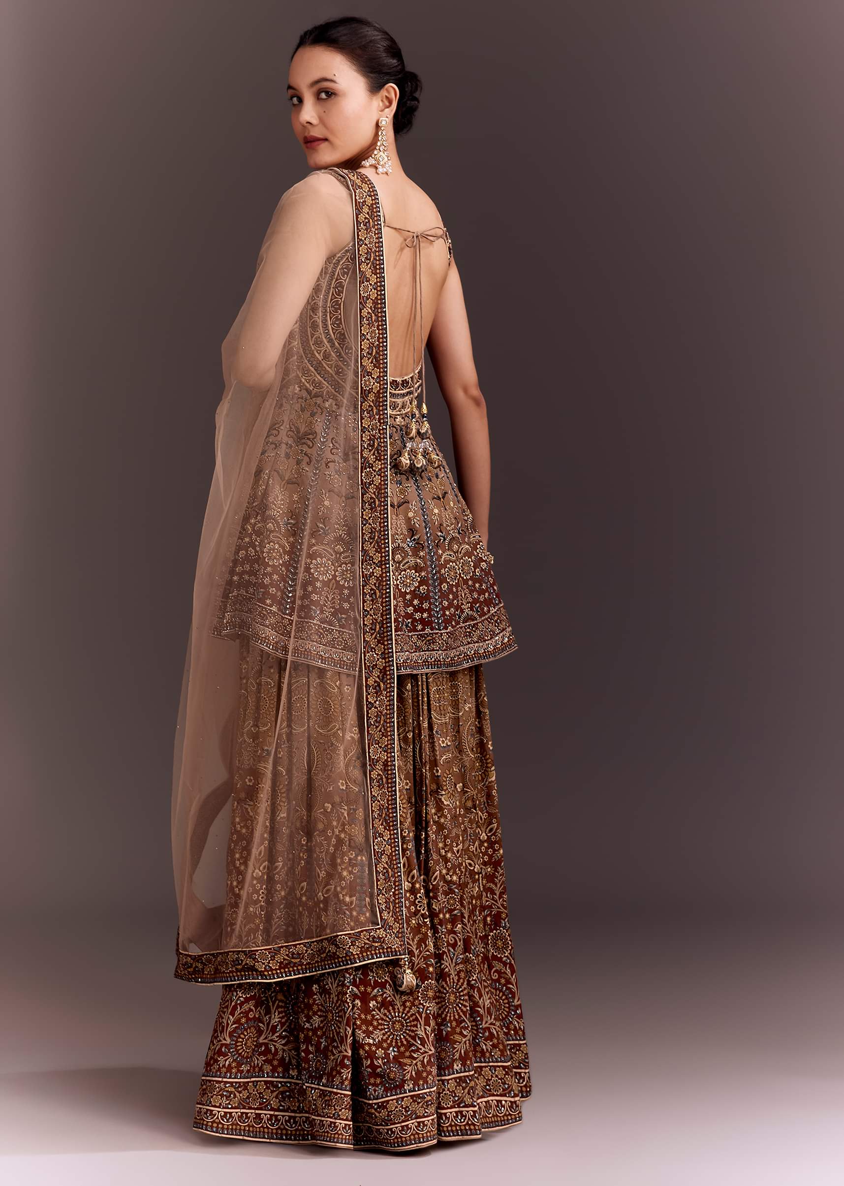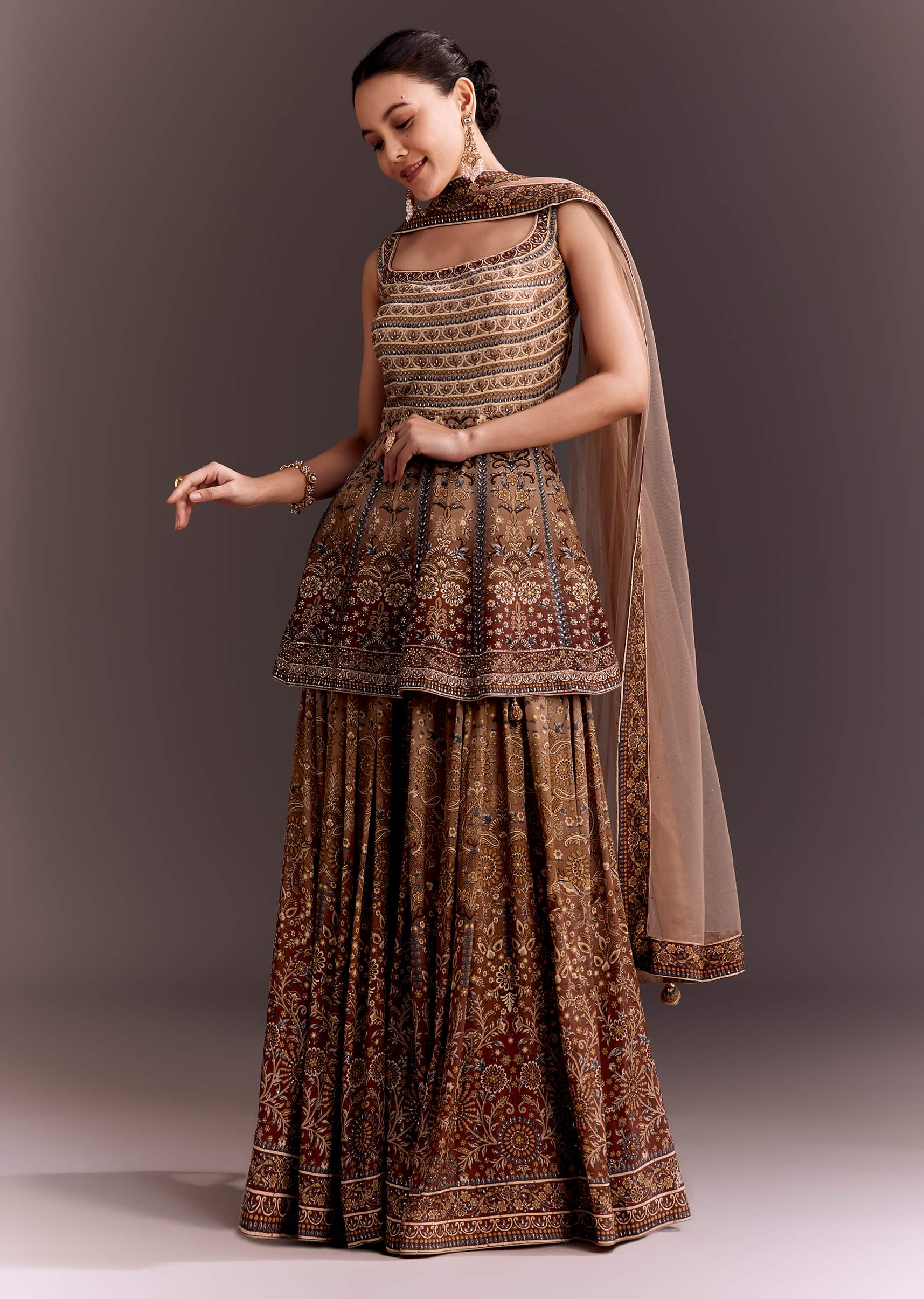 This brown ombre palazzo set showcases meticulous embroidery with stone and sequins, creating an exquisite ethnic outfit. The peplum style kurta is designed with intricate horizontal and vertical patterns, paired... More Product Details