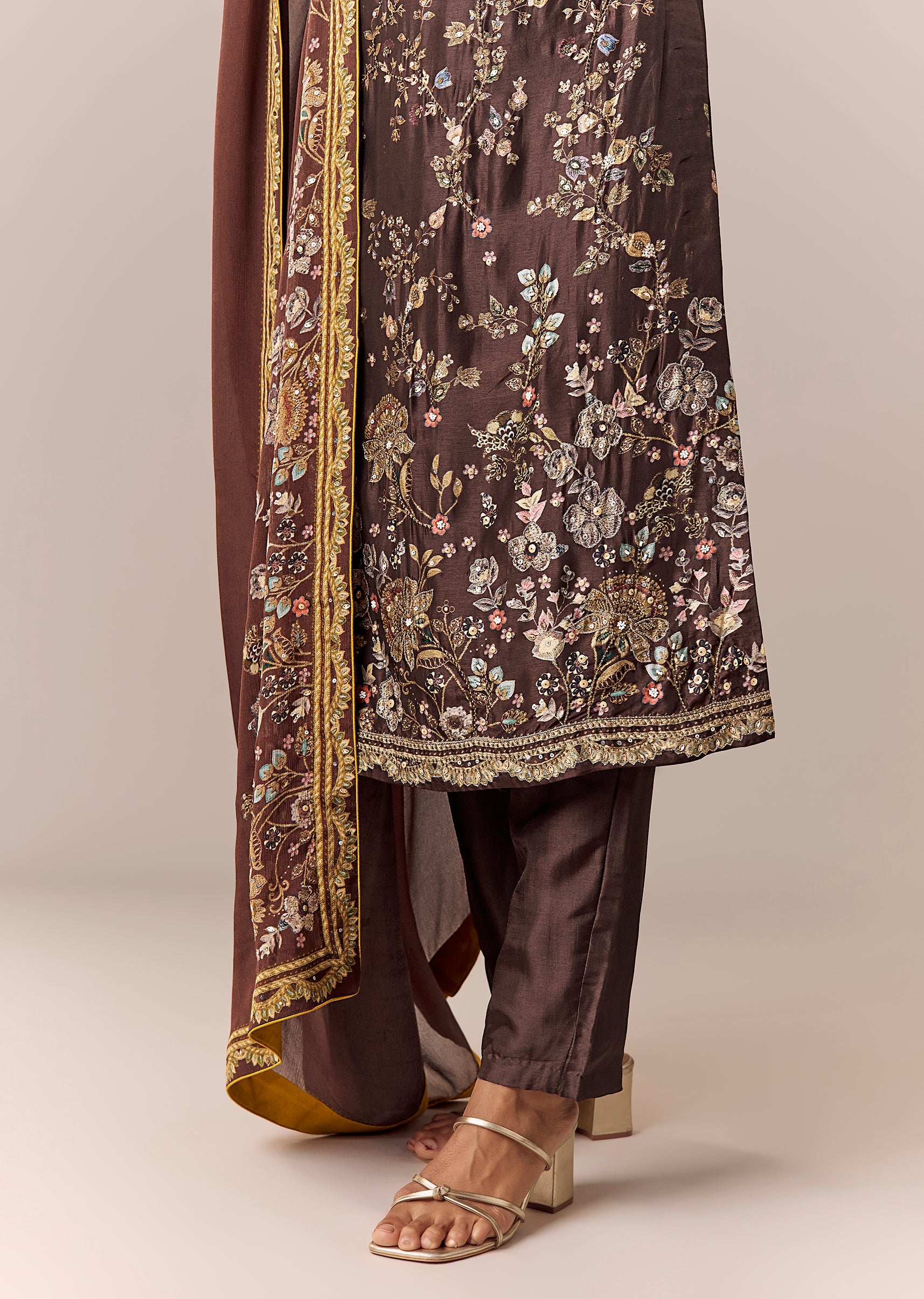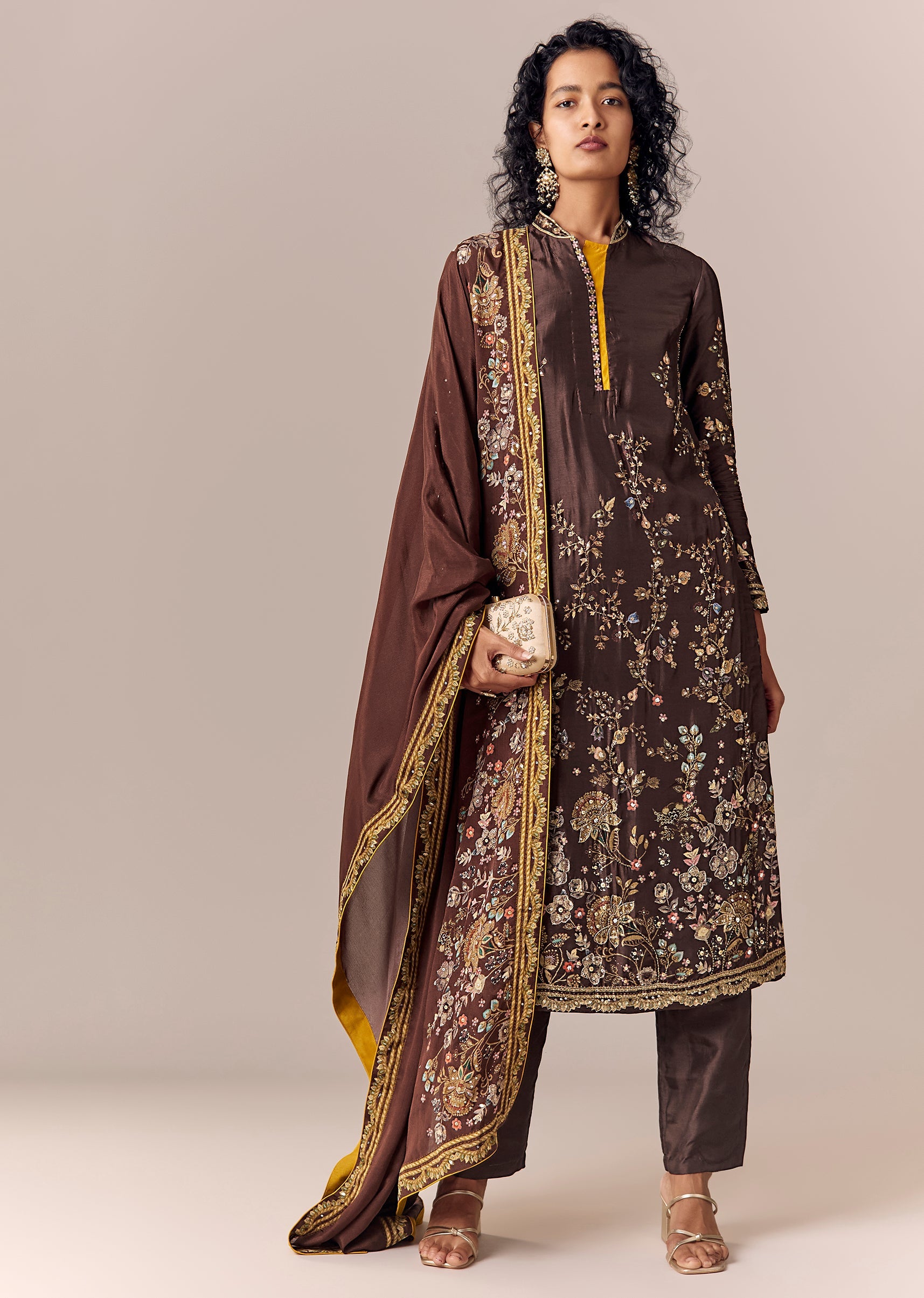 Brown Floral Printed Kurta Pant Set With Dupatta