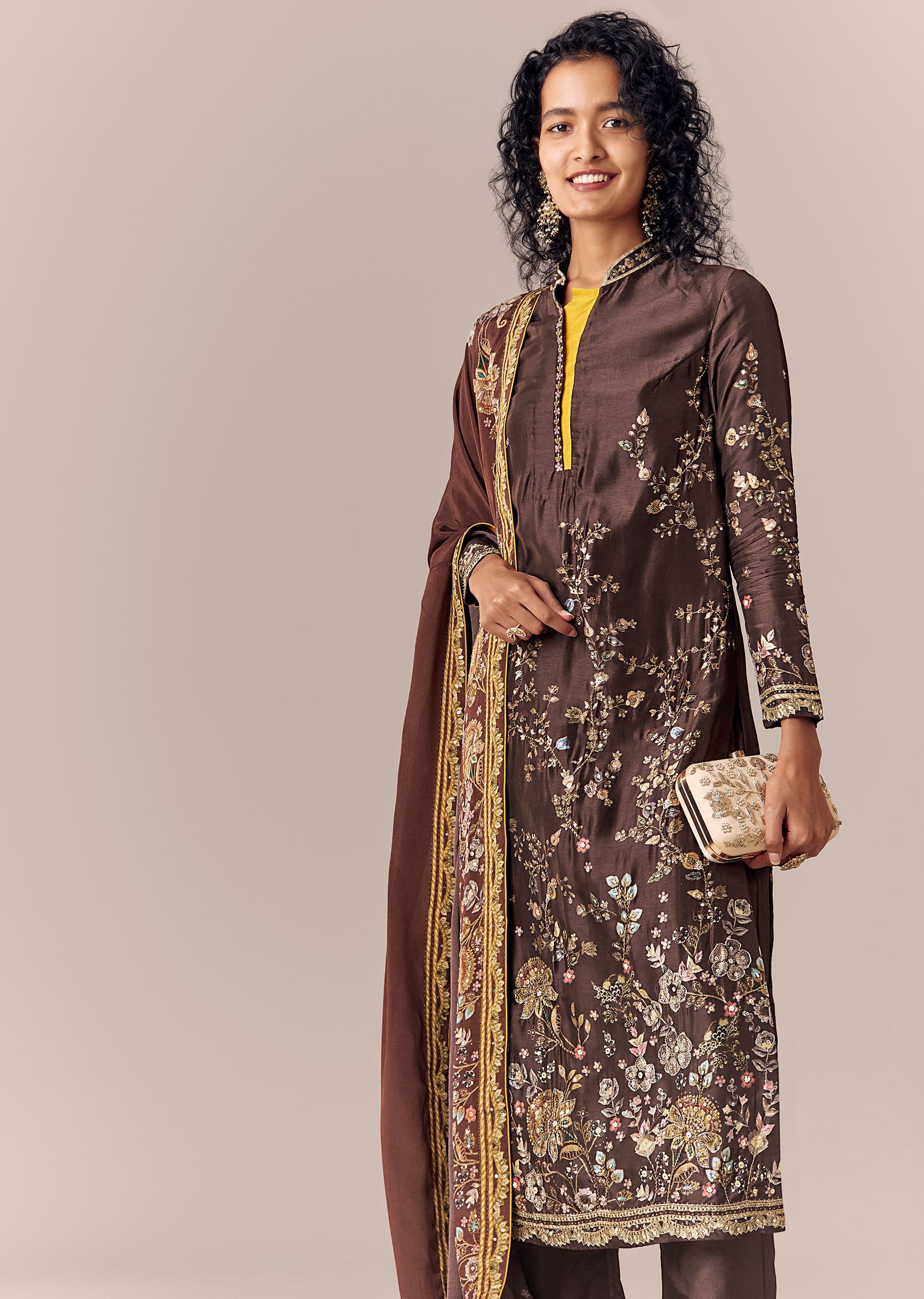 A classic straight kurta set in earthy brown floral print with beads and sequin embroidery. Designed with full sleeves, mandarin collar, side slits and side zip. Includes straight pants with... More Product Details