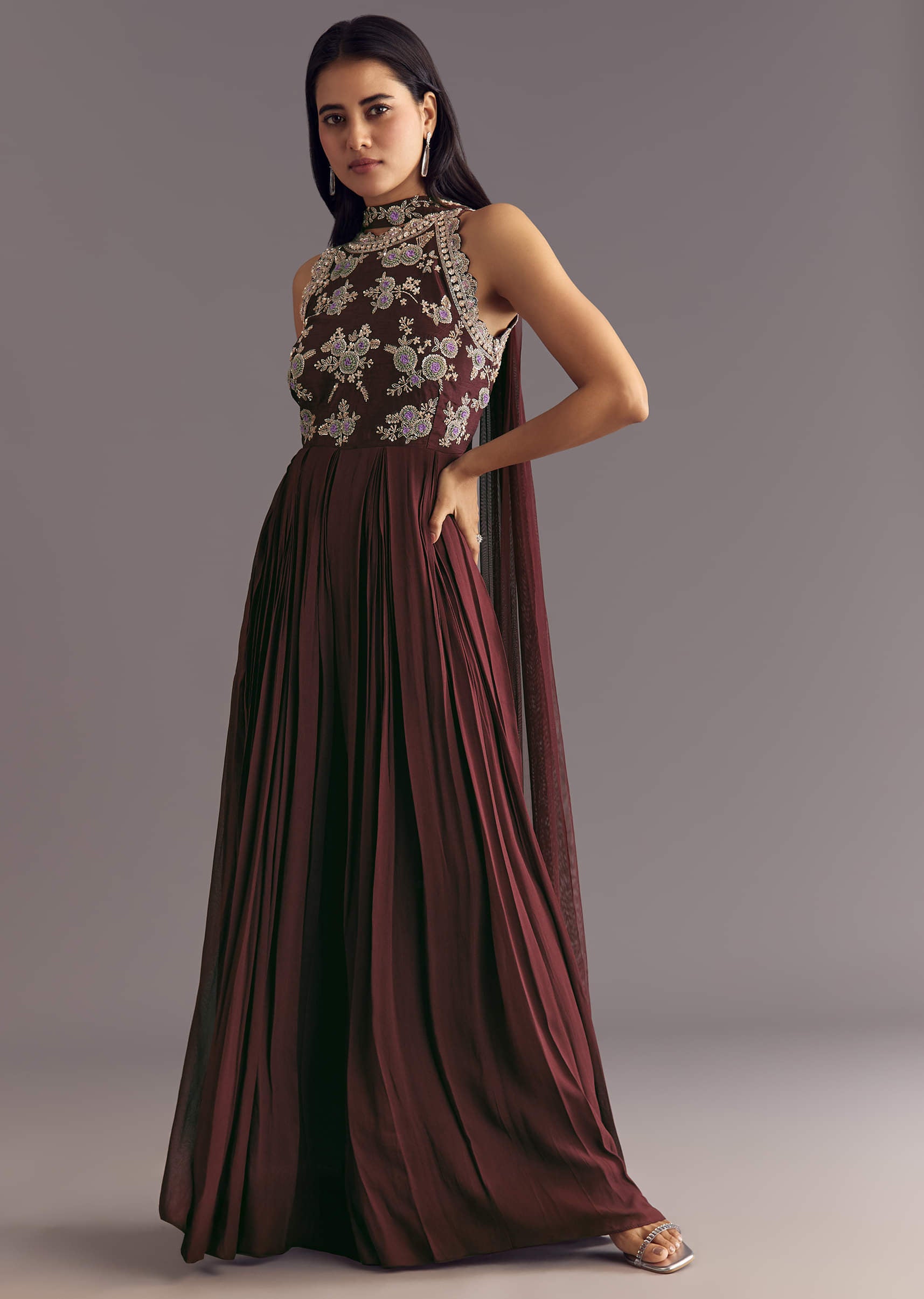 Brown Georgette Jumpsuit With Beads And Cutdana Embroidery