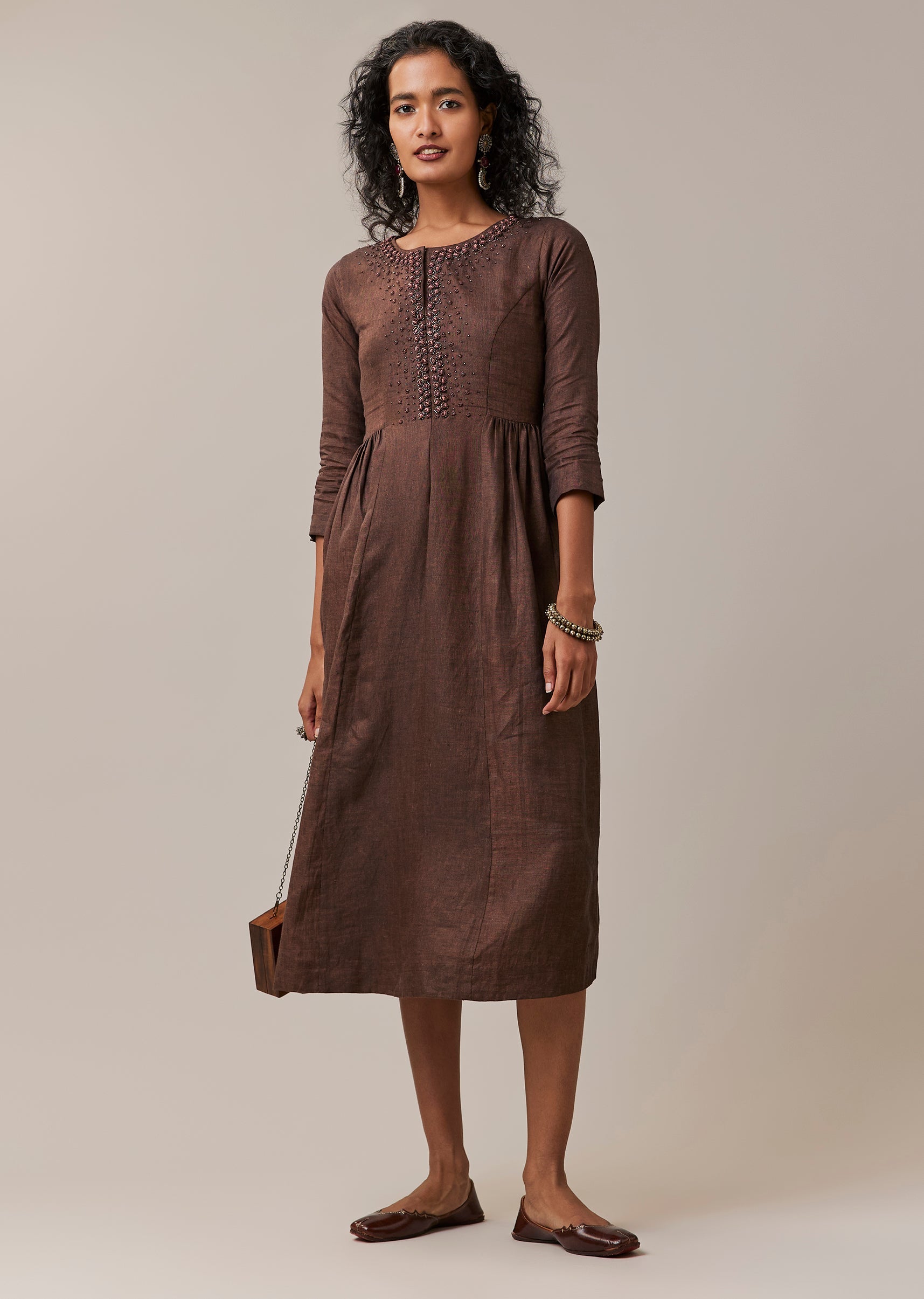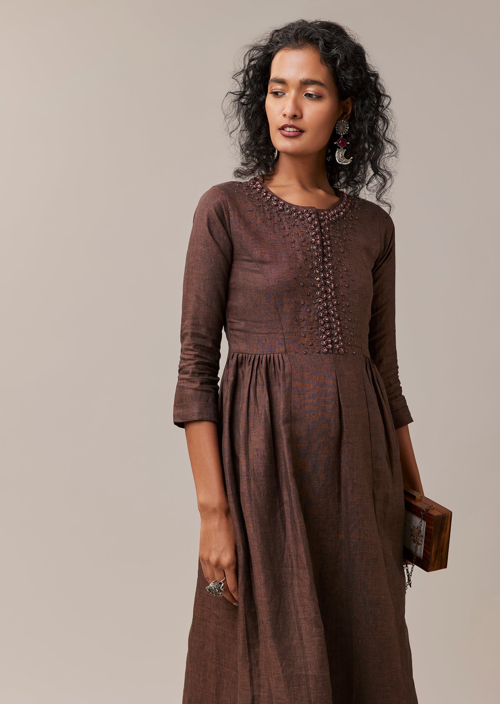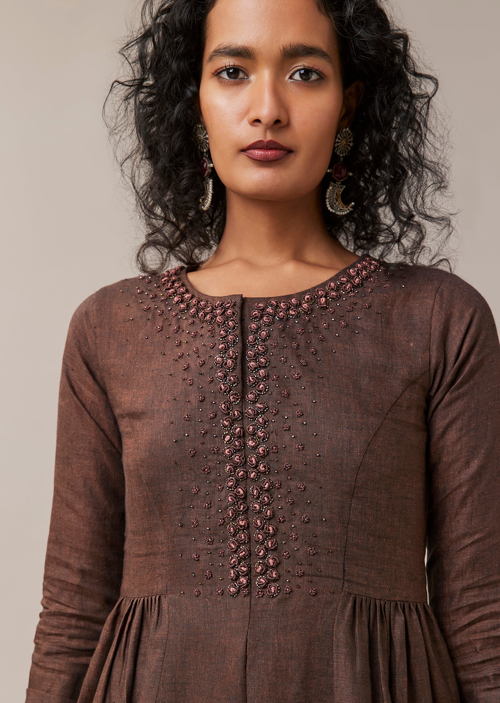 Crafted with understated elegance, this long kurta showcases delicate French knot hand embroidery that adds artisanal charm to its clean silhouette. Made in breathable linen, it features a classic round... More Product Details