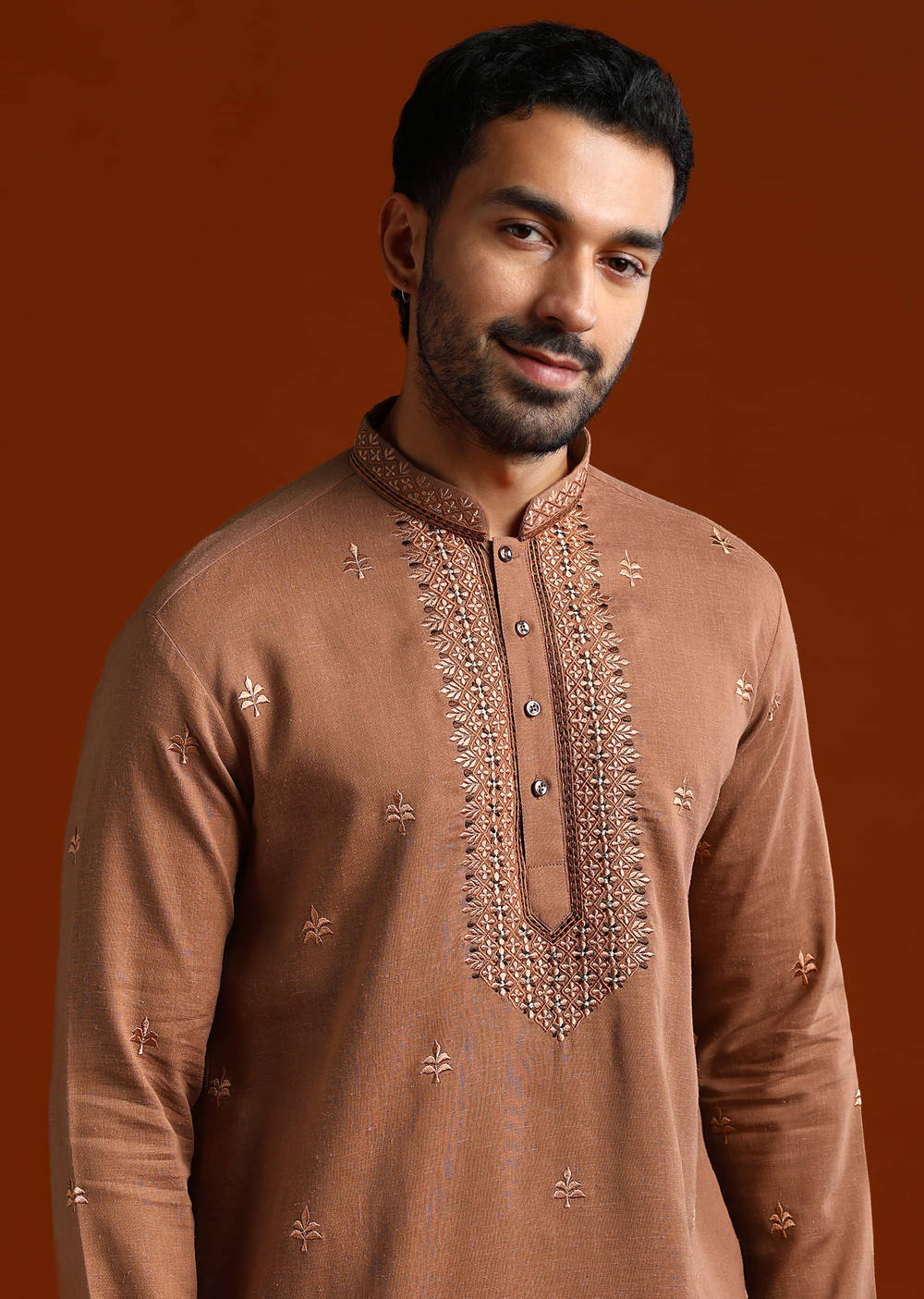 On haldi mornings and festive visits, this brown linen blend men’s kurta set brings tidy linear stitching that looks hand finished. The blended fabric keeps shape while staying easy in crowds. You’re ready for greetings, photos, and long catch-ups. Awarded as the Most Trusted Brand, we're delivering styles you love, just as promised.
