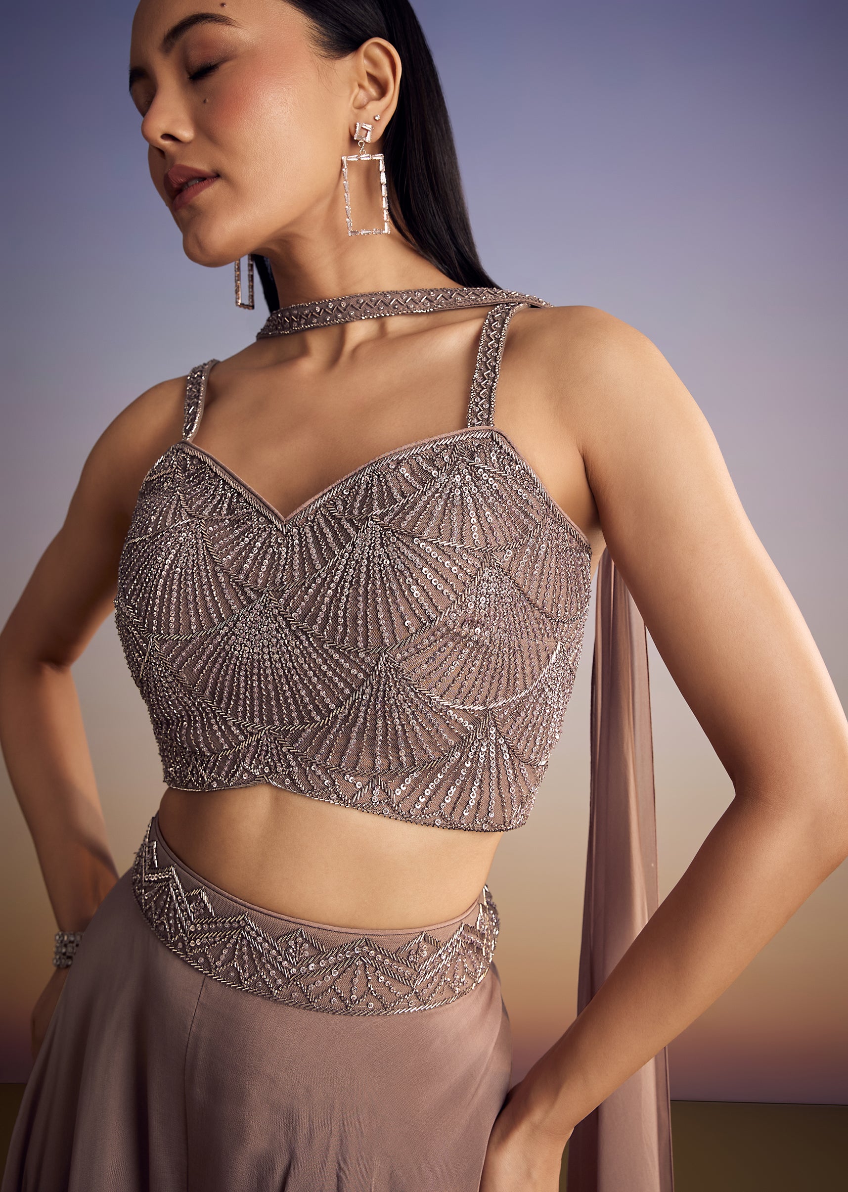 A glamorous brown outfit featuring a sequinned and beaded croptop, complemented by a cutdana detailed waistband and choker-style dupatta. Organza palazzo pants add a contemporary touch. Awarded as the Most Trusted Brand, we're delivering styles you love, just as promised.