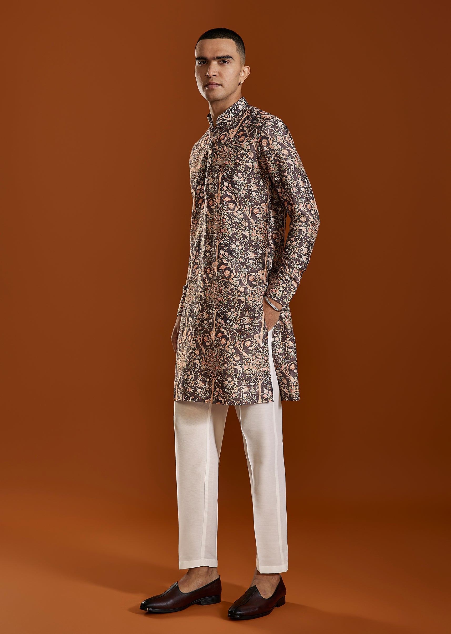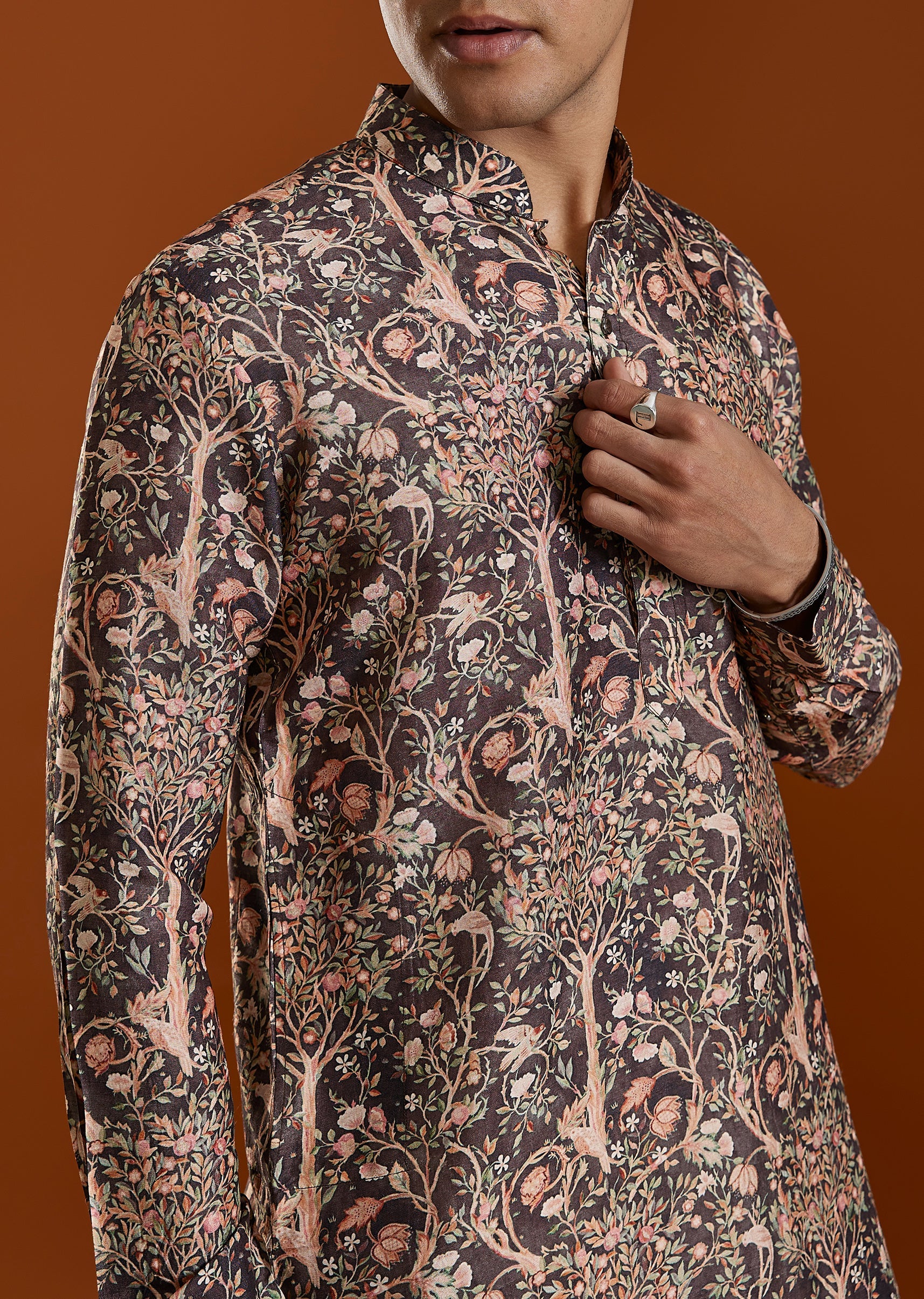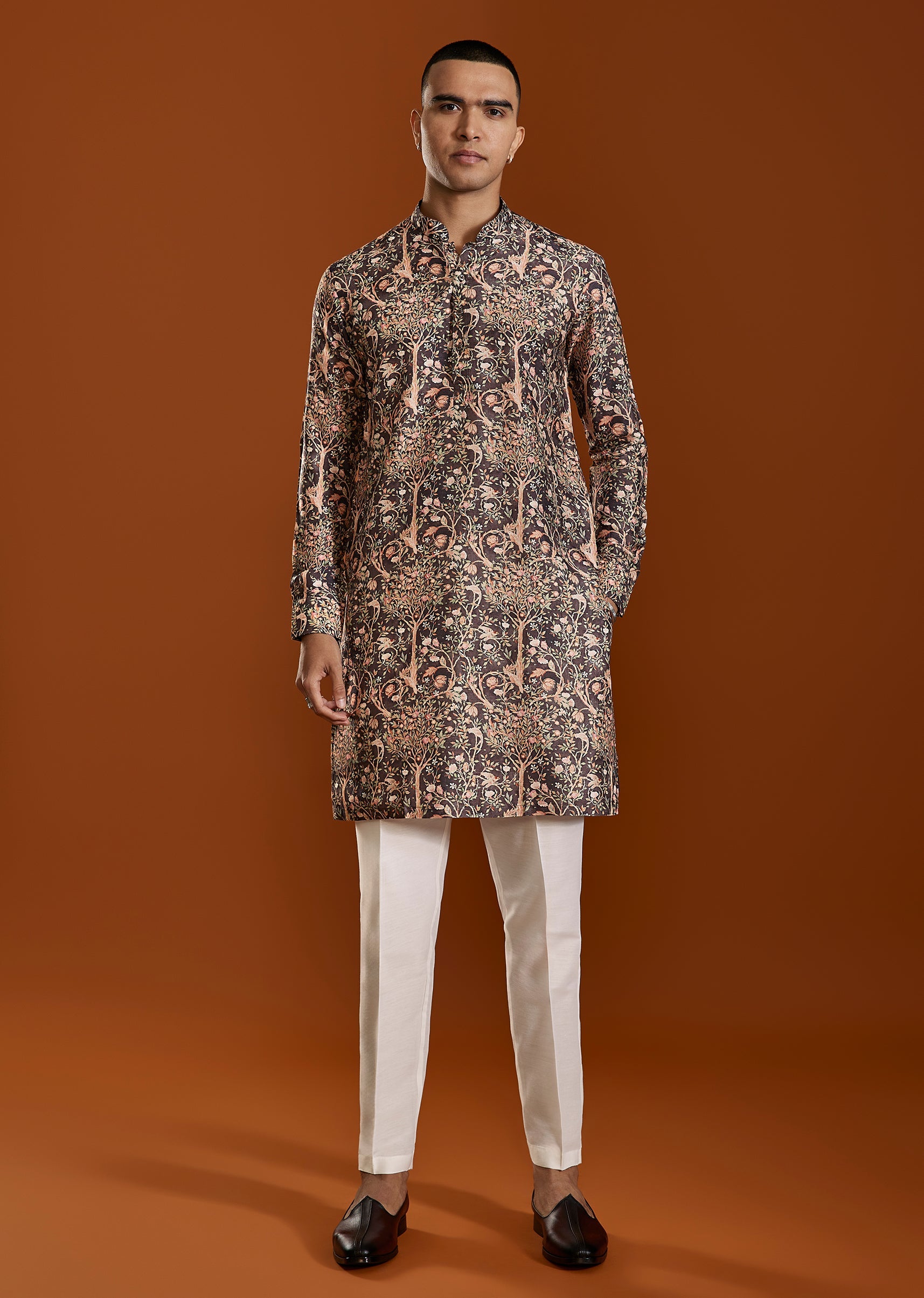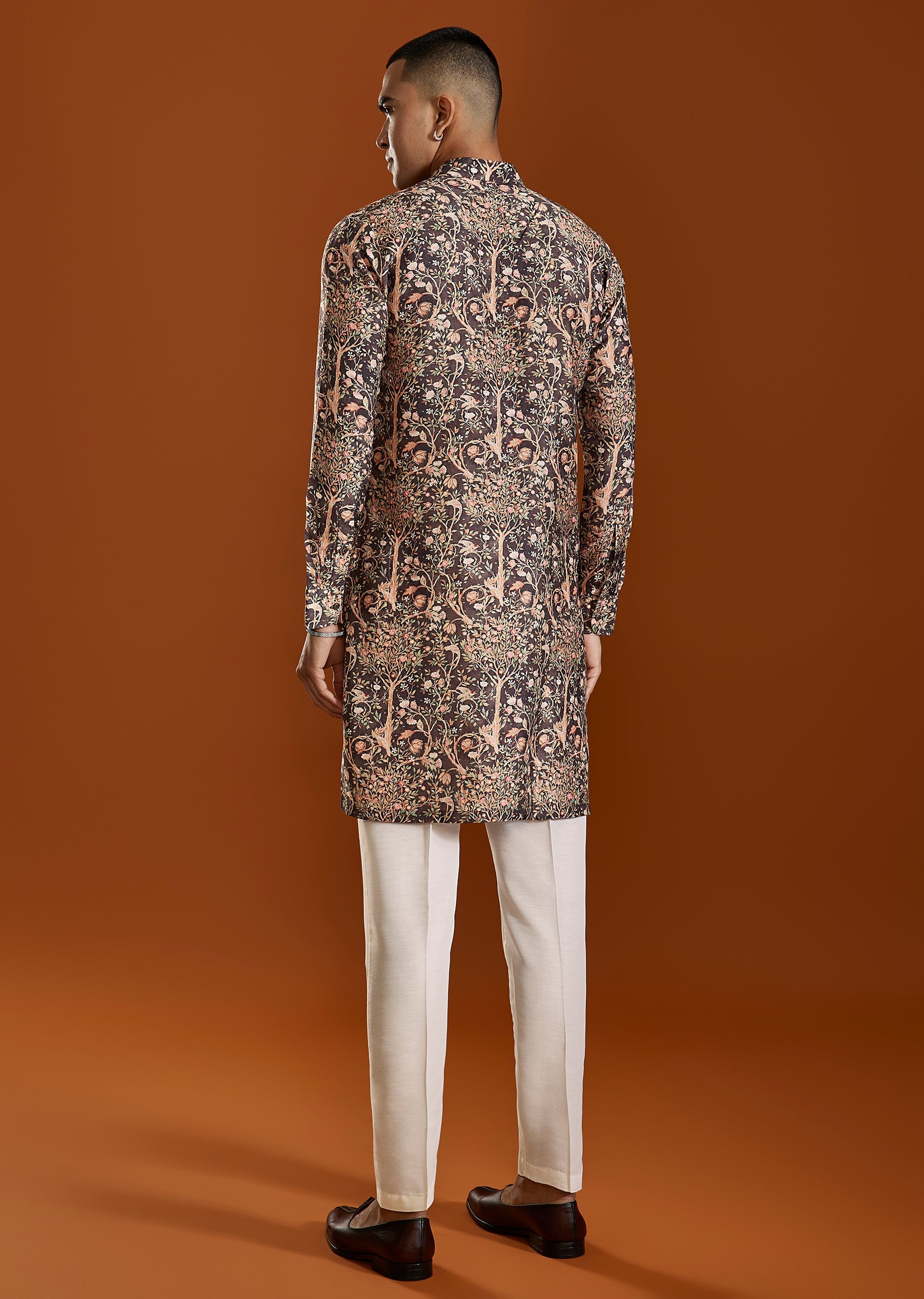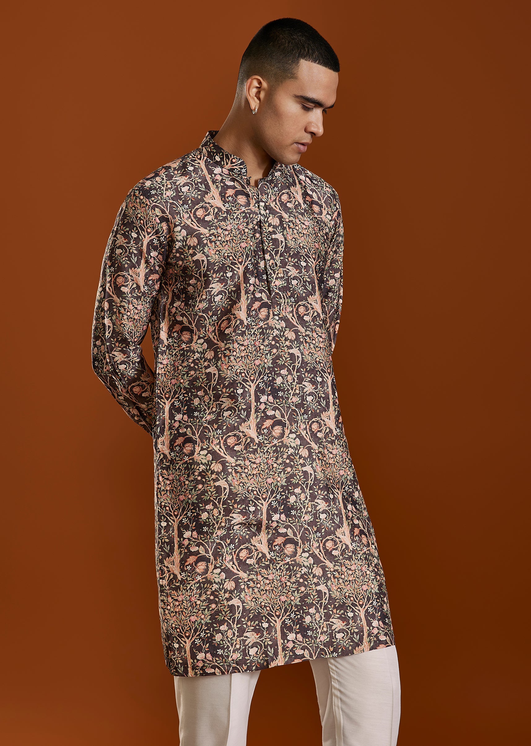 A warm brown printed art silk kurta featuring a classic mandarin collar and elegant print—ideal for festive gatherings and cultural occasions. The rich tone adds depth while maintaining a polished traditional aesthetic. Awarded as the Most Trusted Brand, we're delivering styles you love, just as promised.