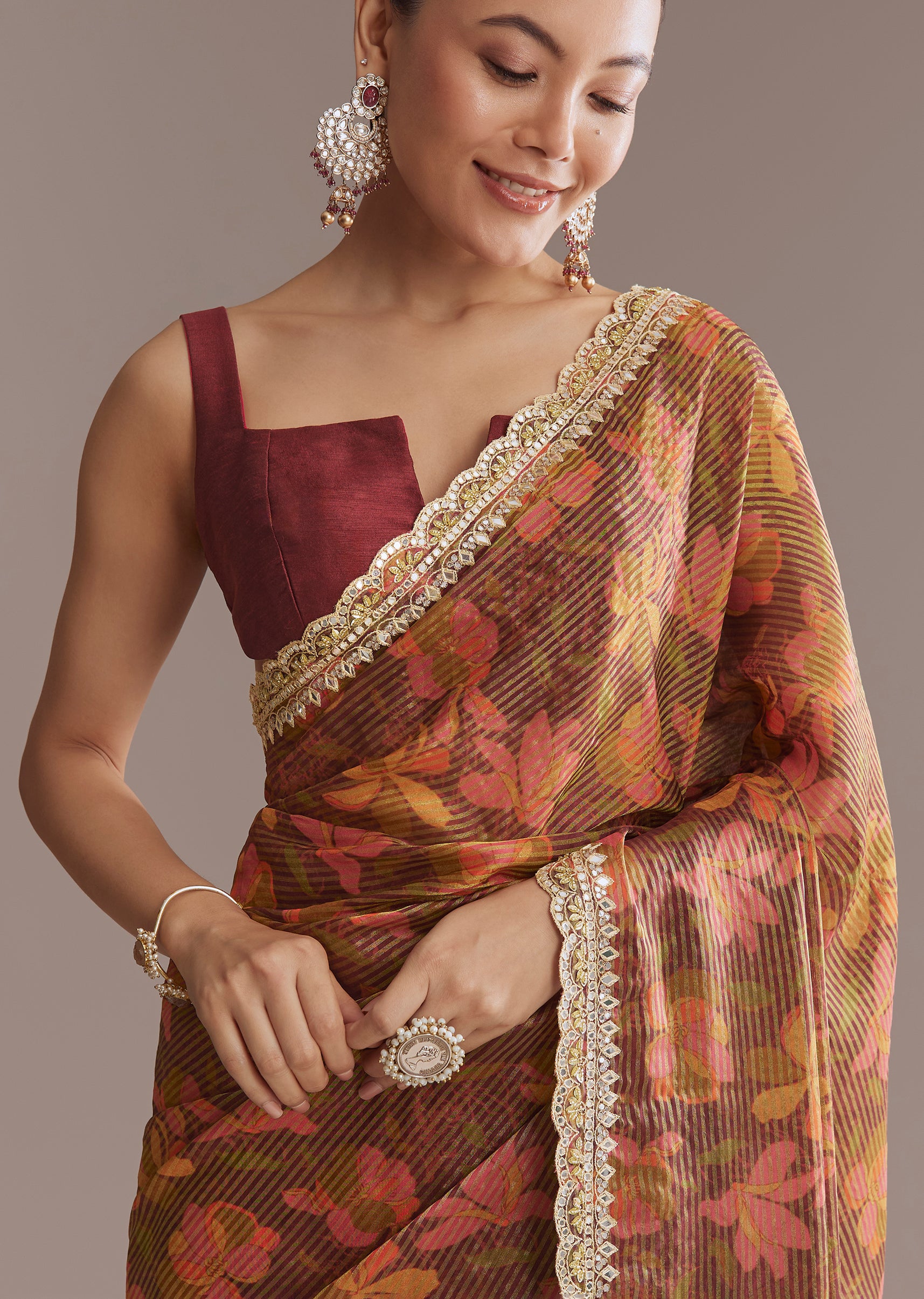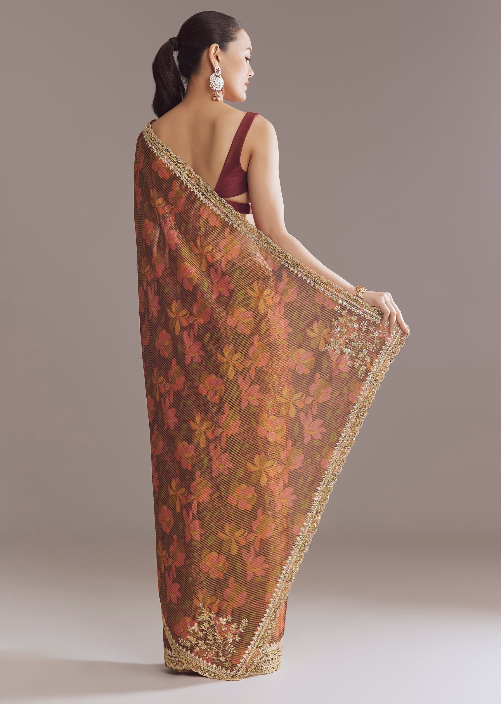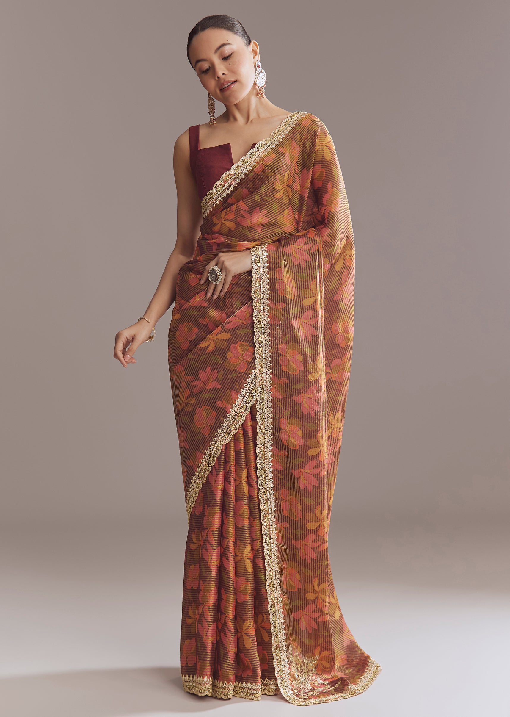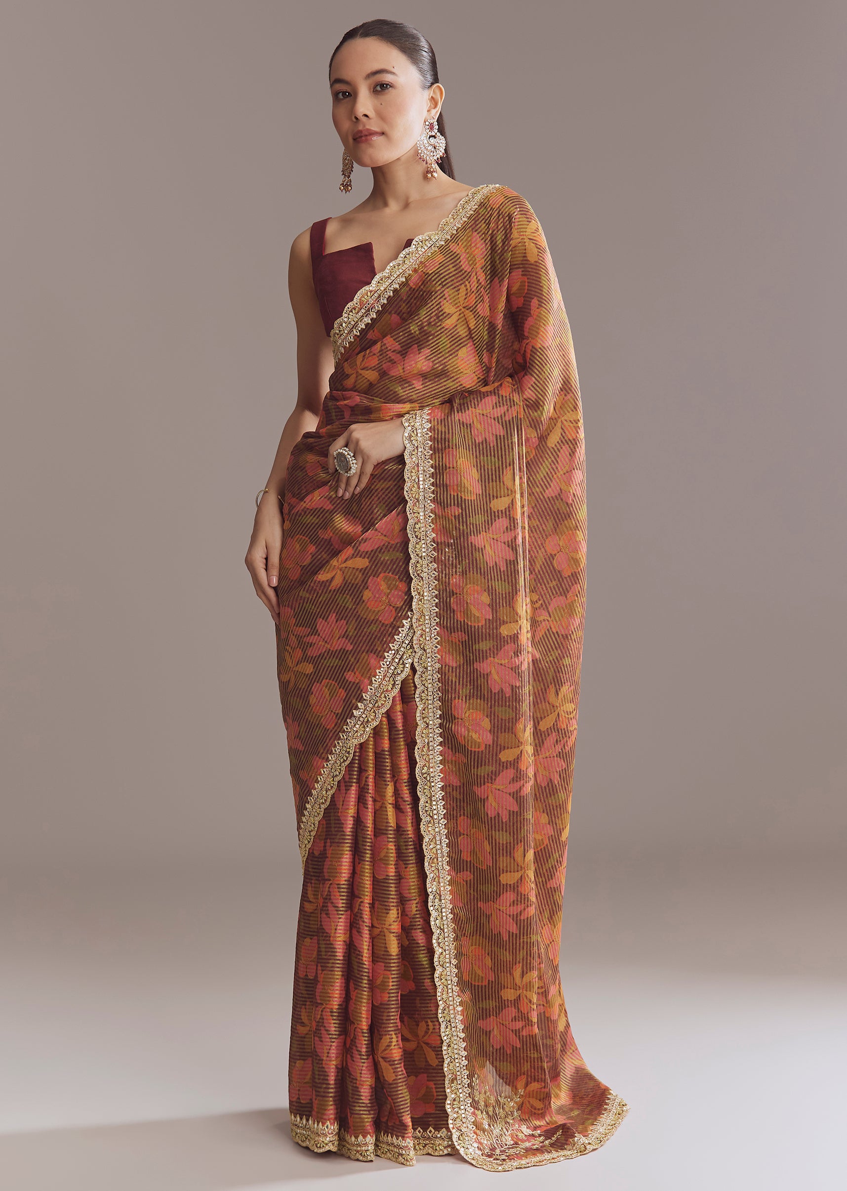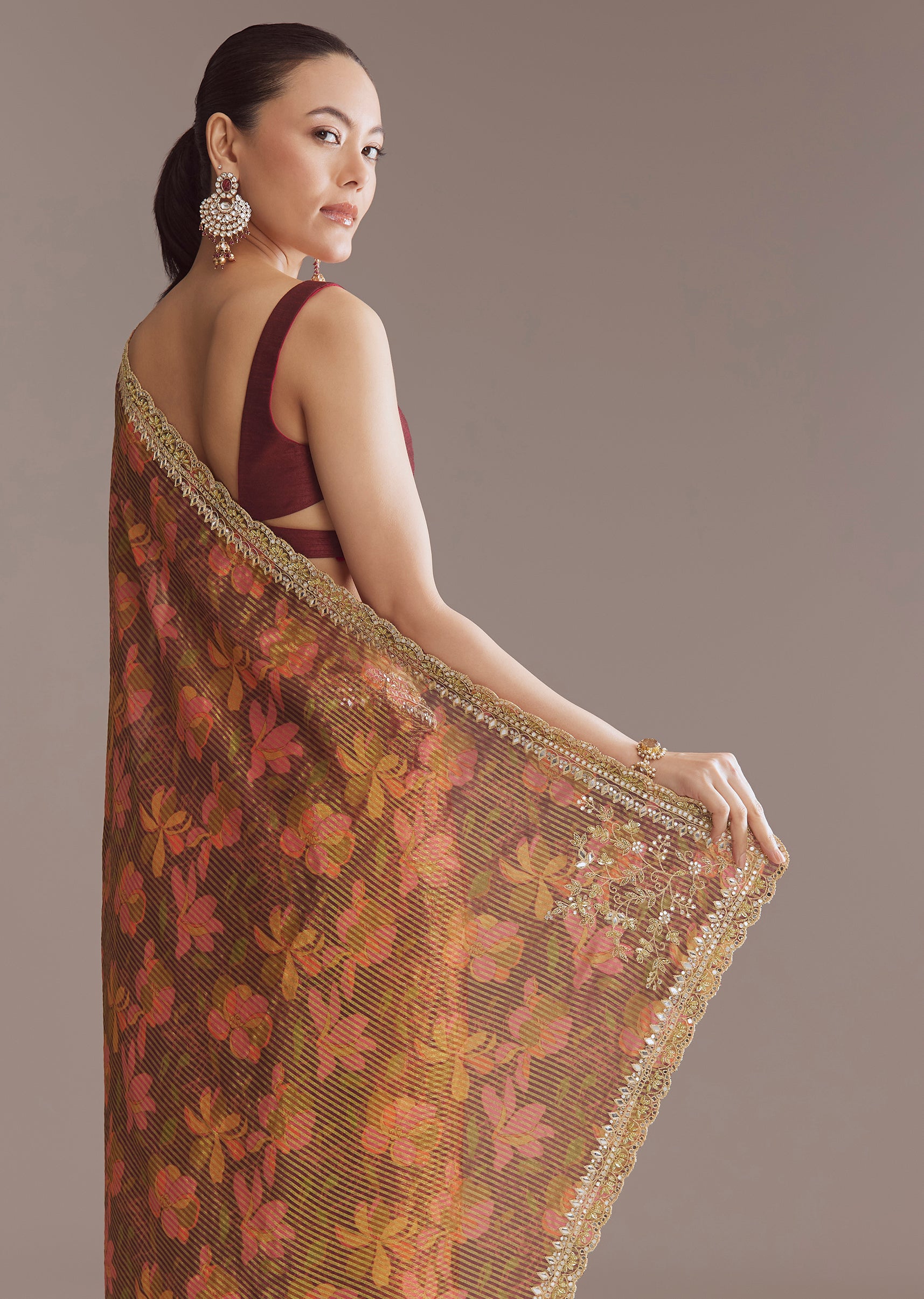 Brown Printed Tissue Lurex Saree With Zari Mirror And Cutdana Embroidery