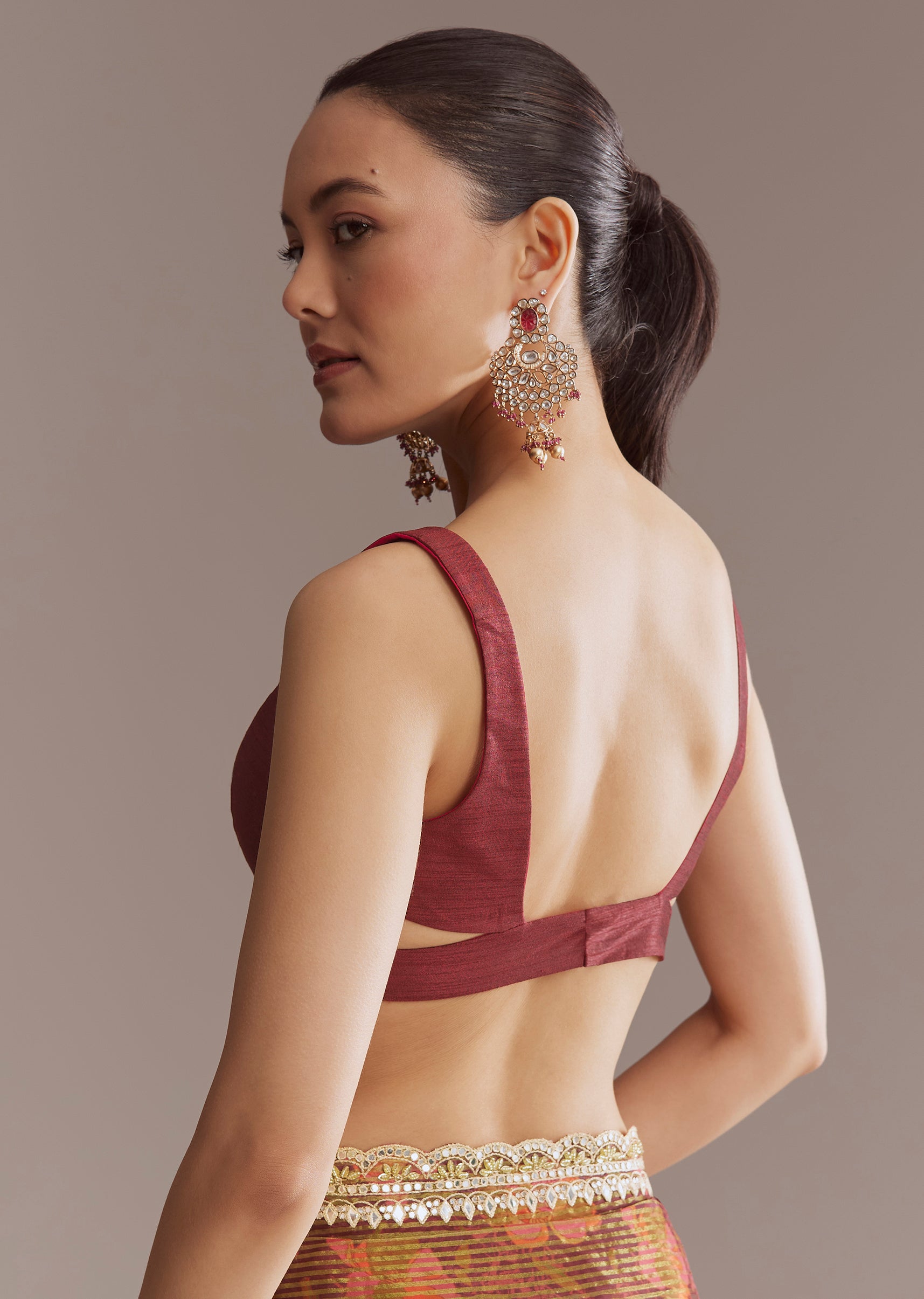 Rooted in rustic grace, this brown tissue lurex saree is framed with zari, mirror, and cutdana embroidery on scalloped edges for earthy glamour. Awarded as the Most Trusted Brand, we're delivering styles you love, just as promised.