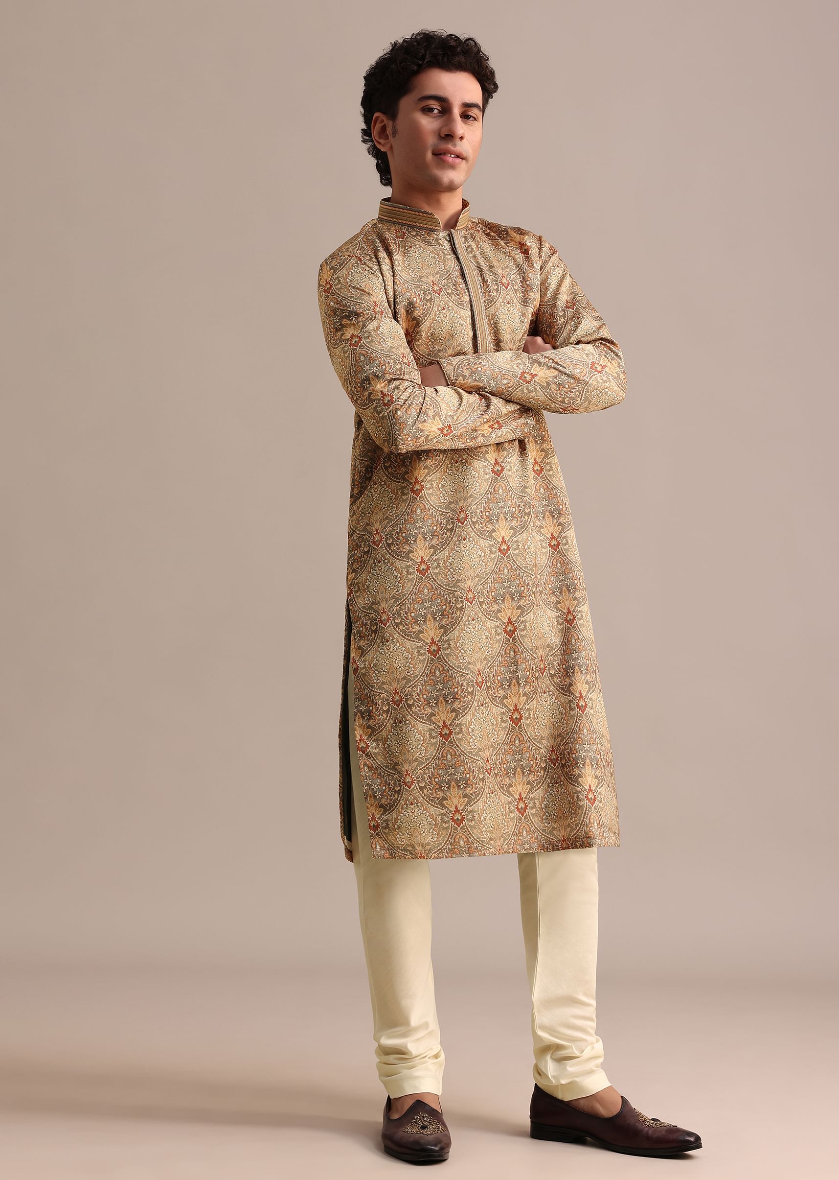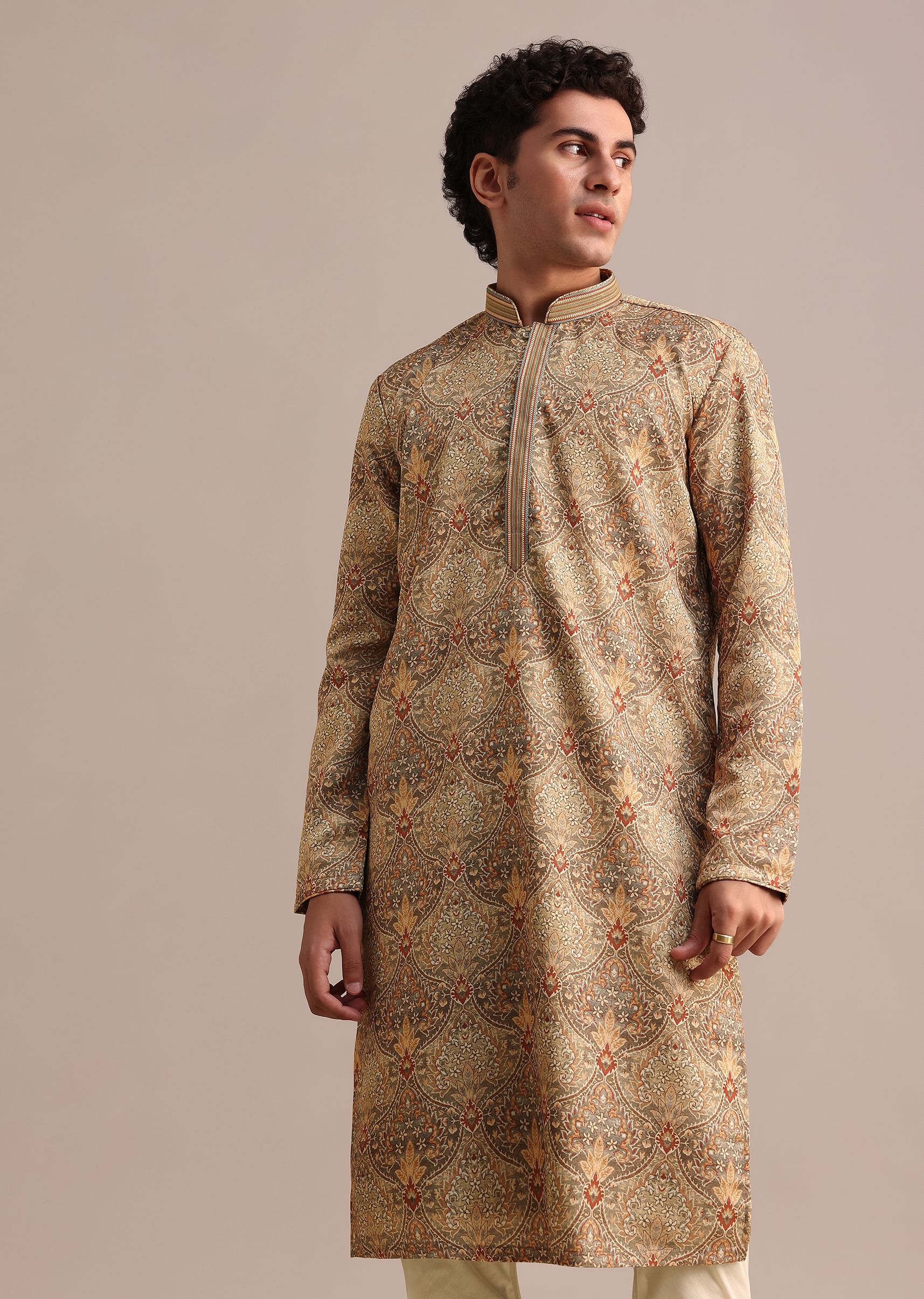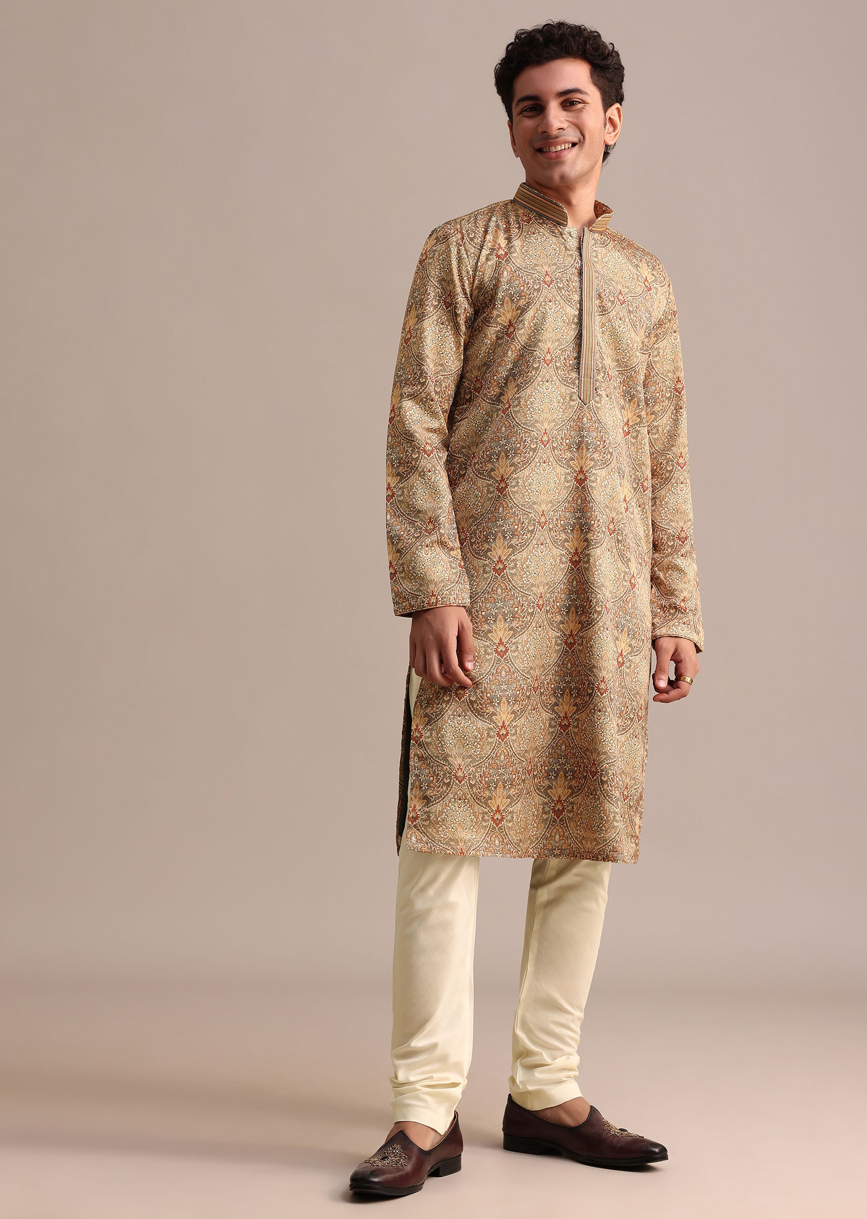 - Indulge in the luxurious feel of our brown satin kurta set adorned with intricate prints that add a touch of sophistication.