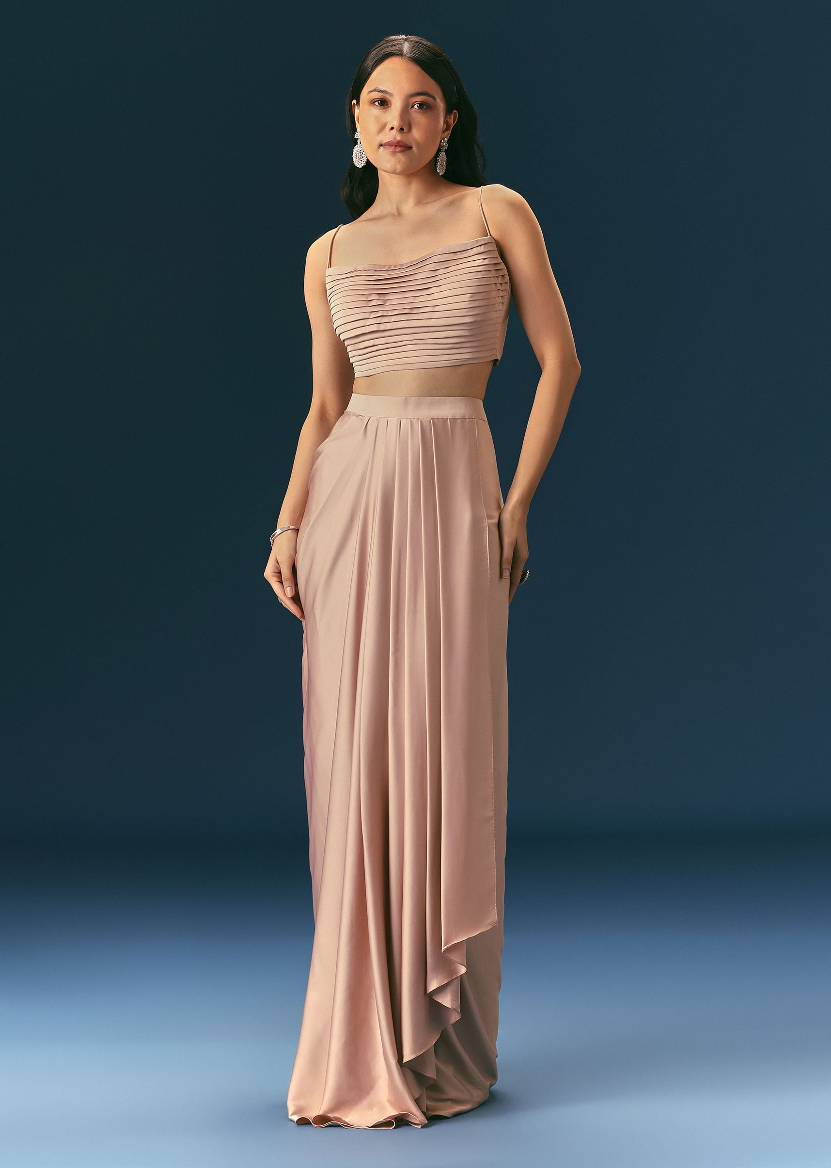 Elevating your style at every occasion is this fusion cape and skirt set that will garner you everyones attention. Fabricated on an earthy brown base the hand embellished cape comes adorned with self on self work that is used to created floral motifs. Complemented with pleated bustier and a draped skirt this outfit will add charm to grandeur soiree and cocktail parties. Awarded as the Most Trusted Brand, we're delivering styles you love, just as promised.