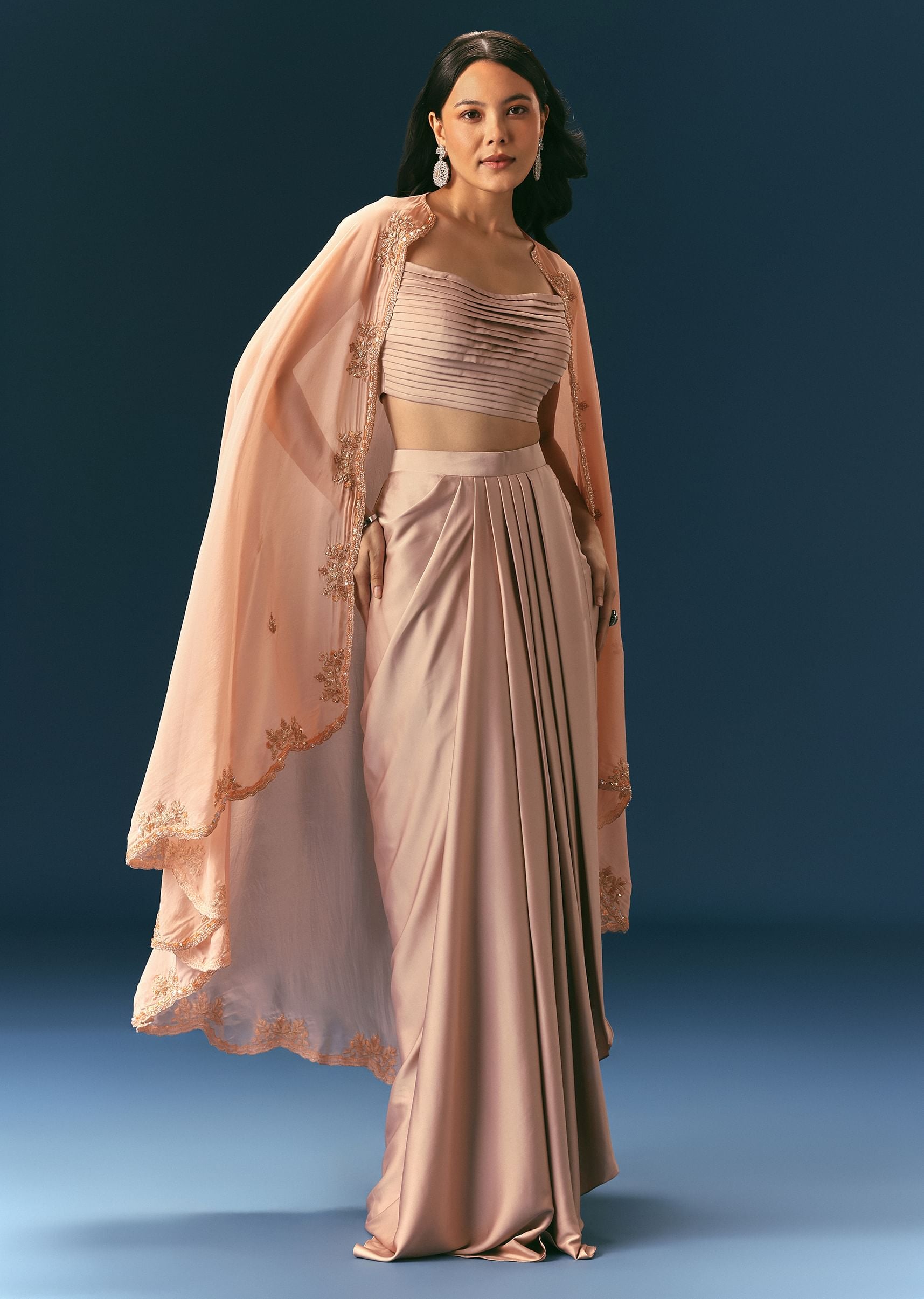 Brown Scallop Embroidered Cape With Bustier And Draped Skirt