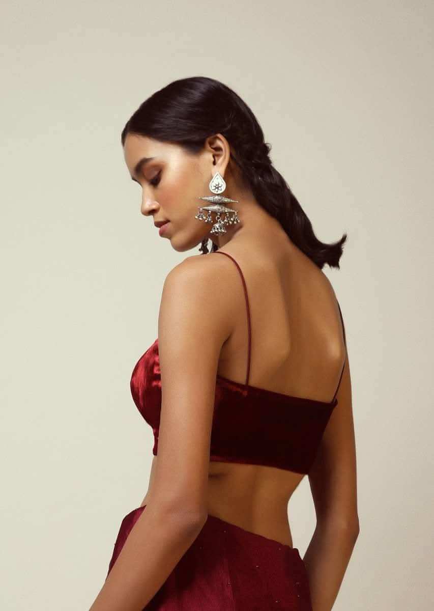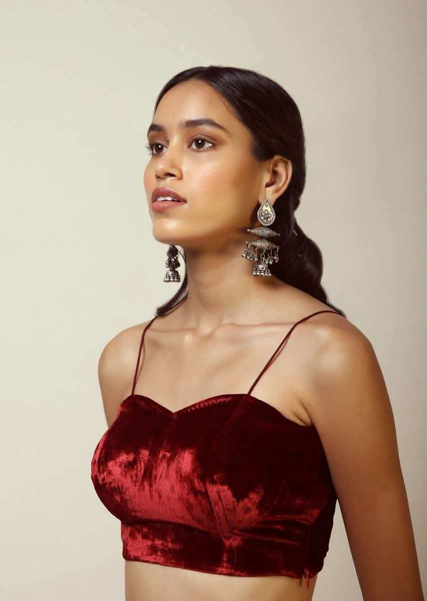 Burgundy Blouse Fabricated In Velvet With Spaghetti Straps And Sweetheart Neckline