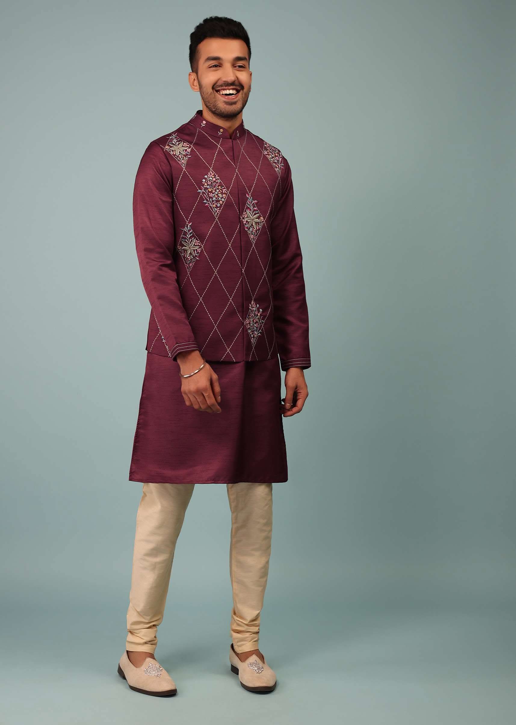 - Festive Ruby Wine Red Bandi Jacket in handloom raw silk suiting fabric with floral jaal embroidery.