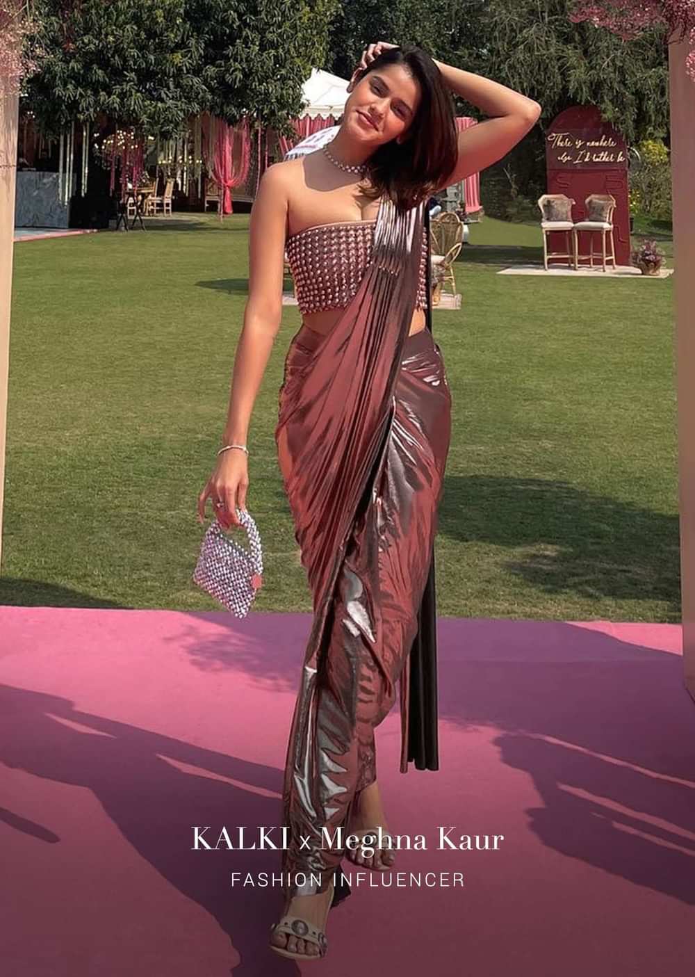- Burlwood pink ready pleated saree in metallic lycra with pleated pallu.