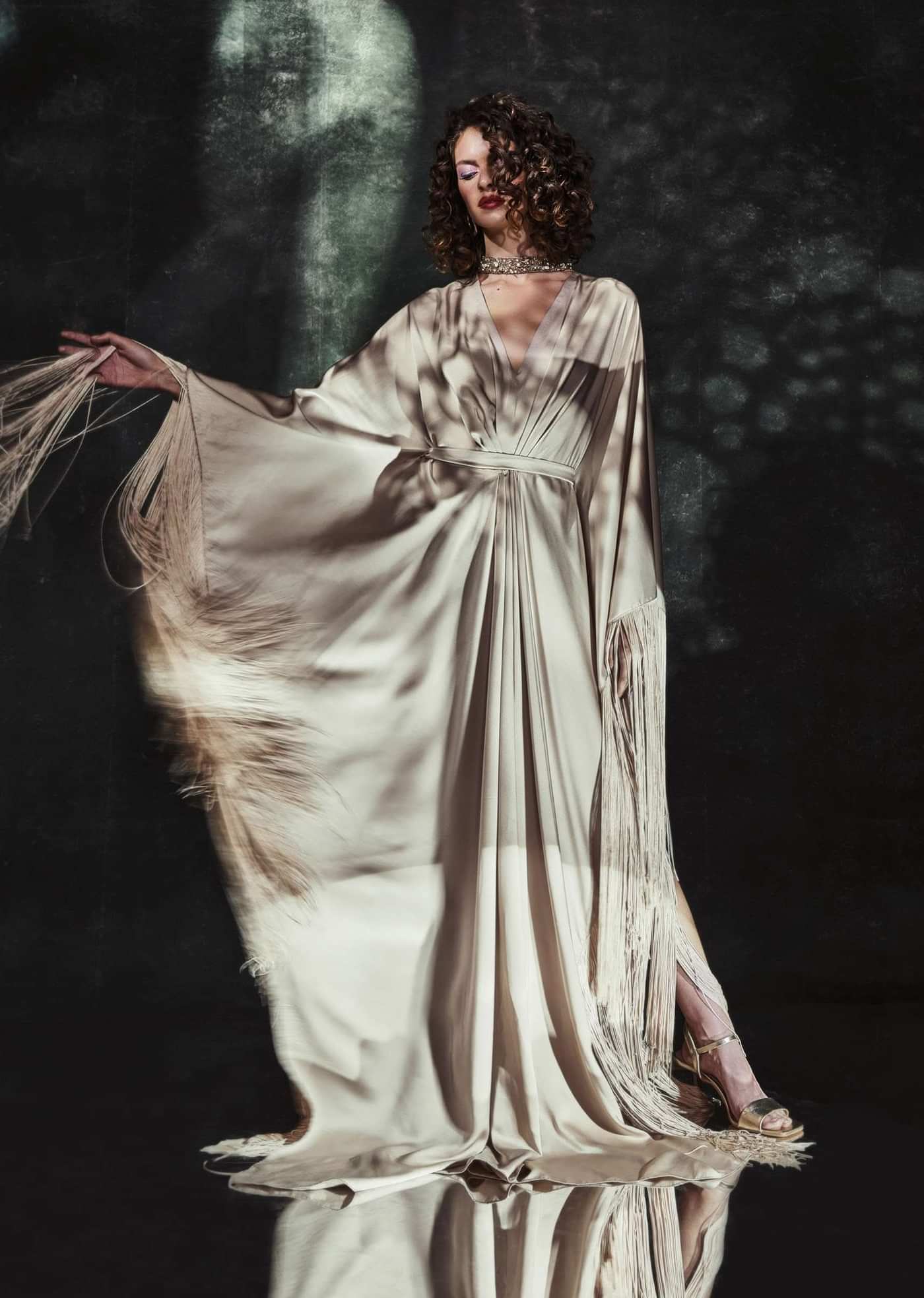 • The kaftan comes in a V-neckline with an embroidered strap in pearls and cut dana around the neck, secured with a hook... More Product Details