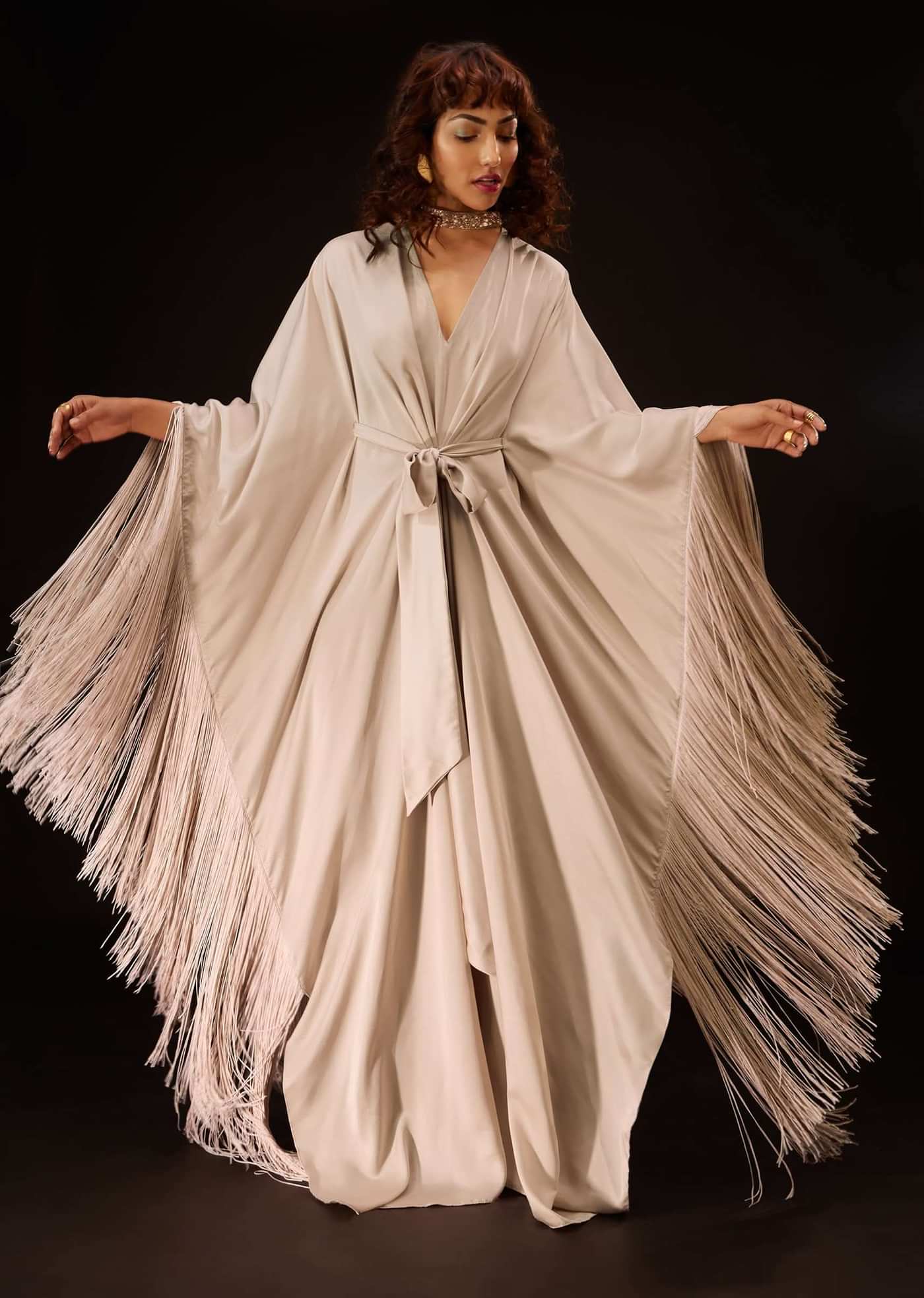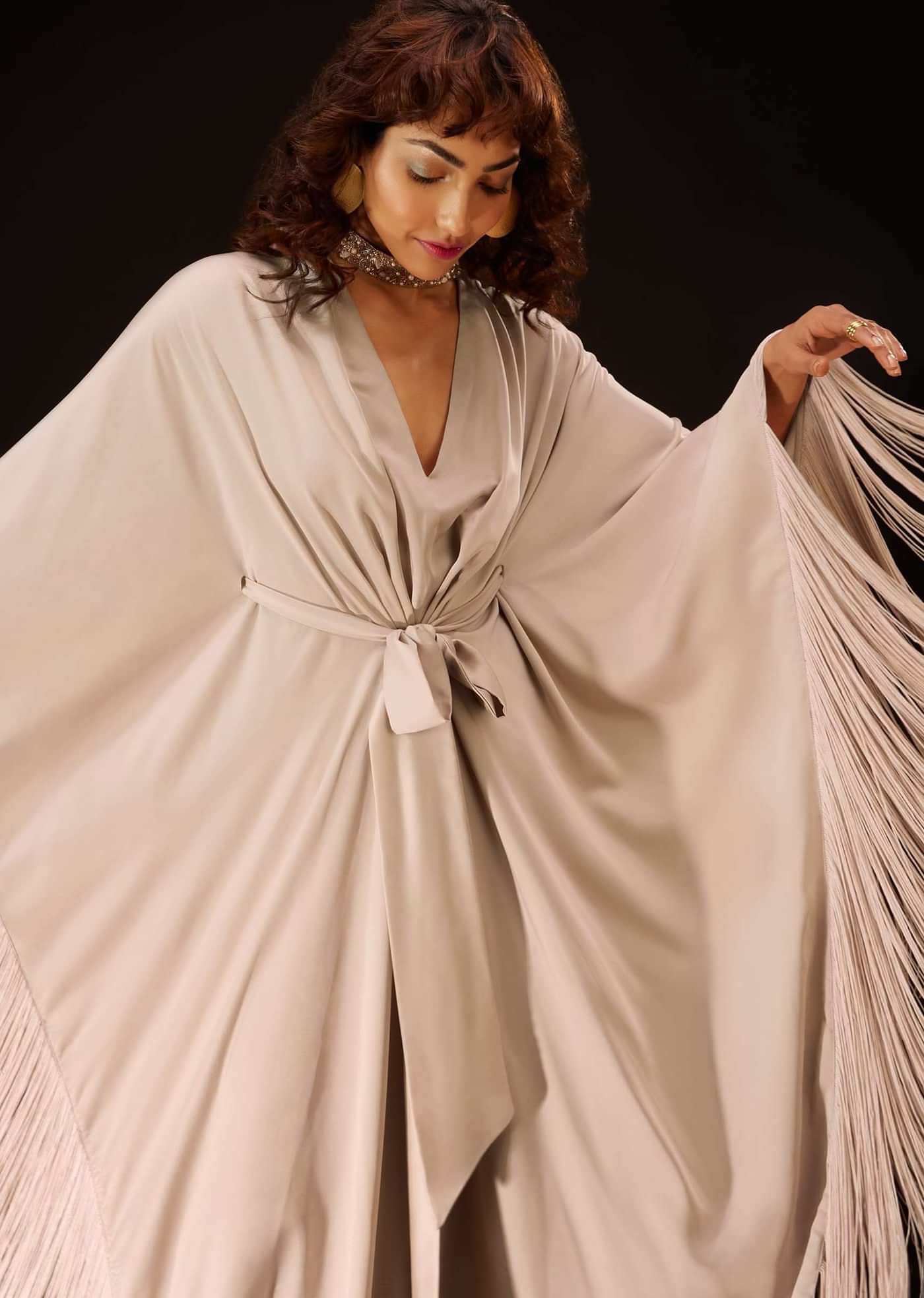 Candy Pink Embroidered Kaftan With Fringe Border And Tie-Up Bow - DEME X KALKI