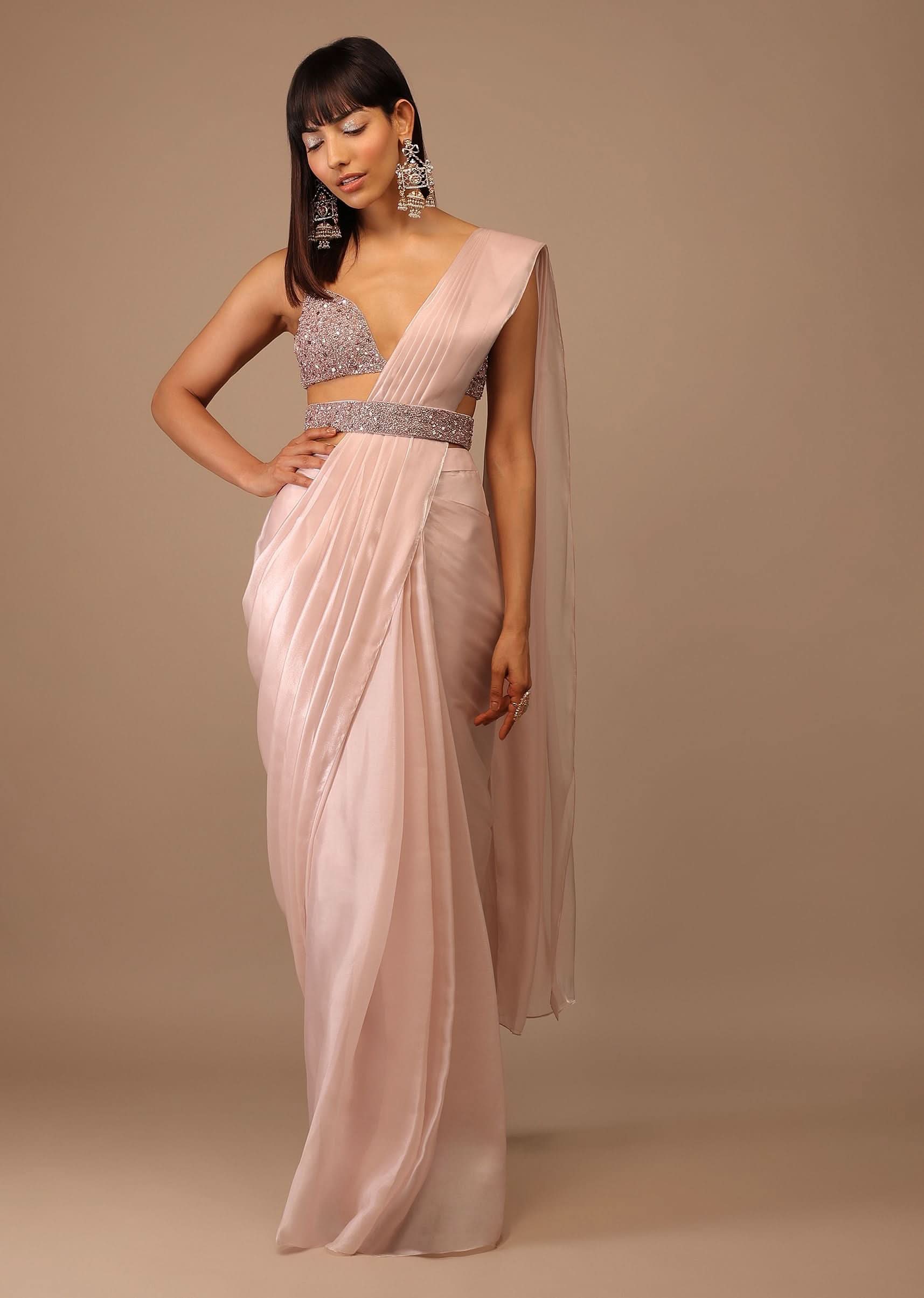 - Glossy organza ready-made pleated saree in Powder Pink worn with a heaviily hand-embroidered bustier top.