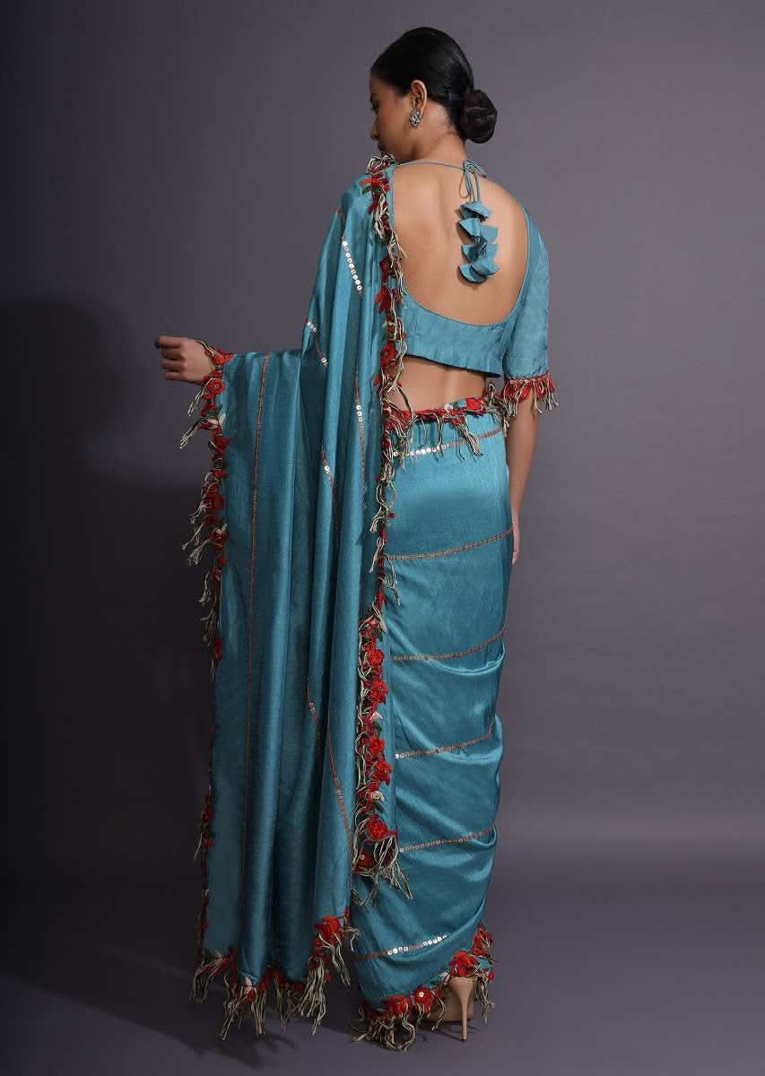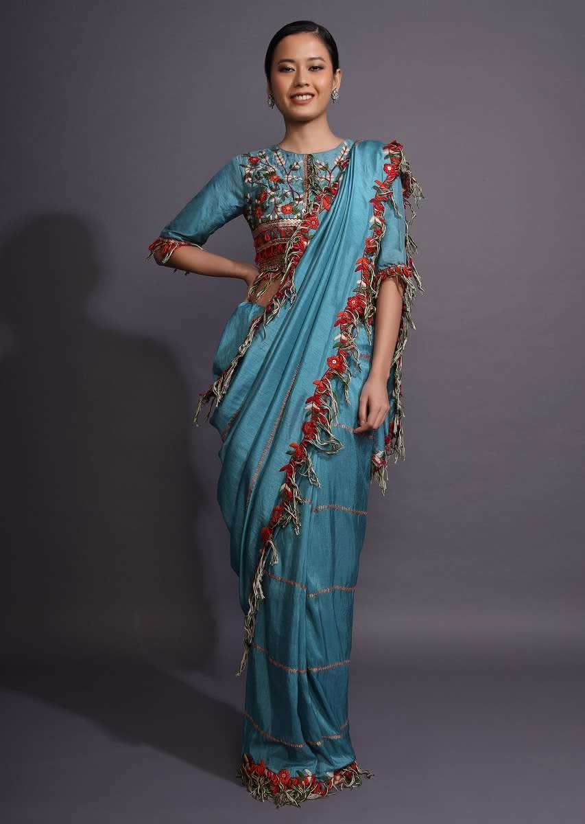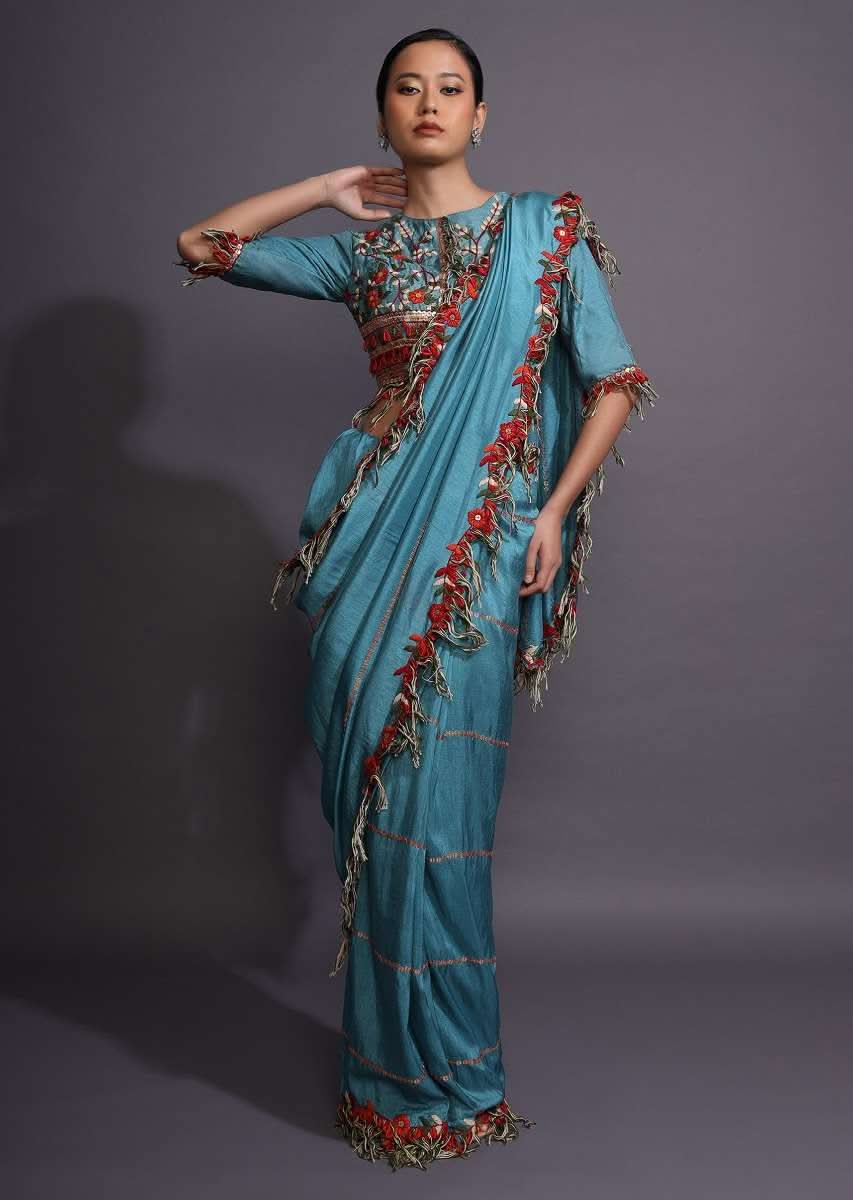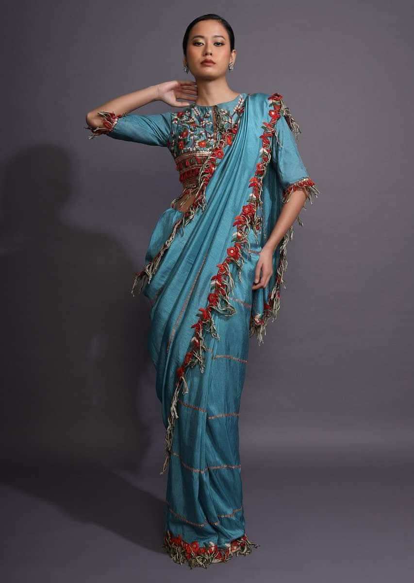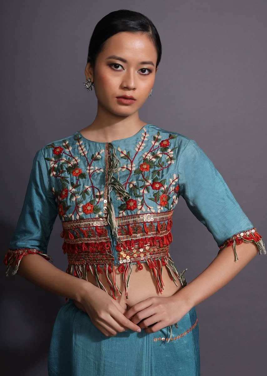 Cerulean Blue Saree With Thread Embroidered Floral Design And Tassels On The Border Online - Kalki Fashion