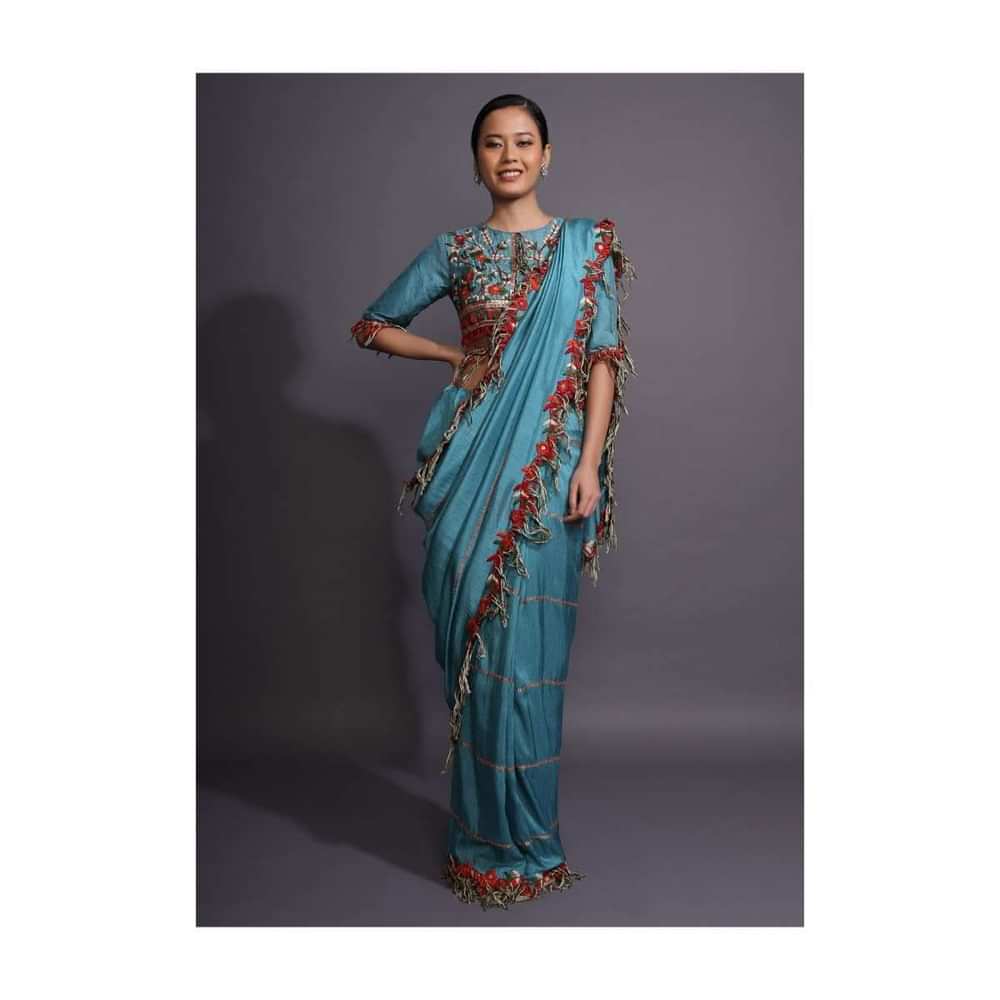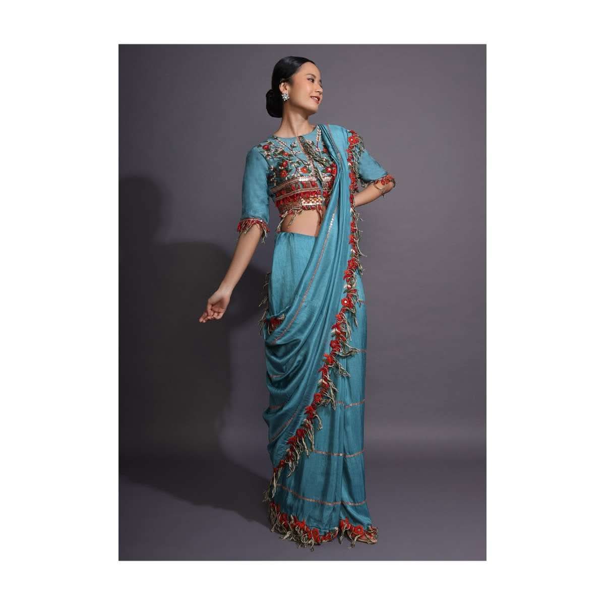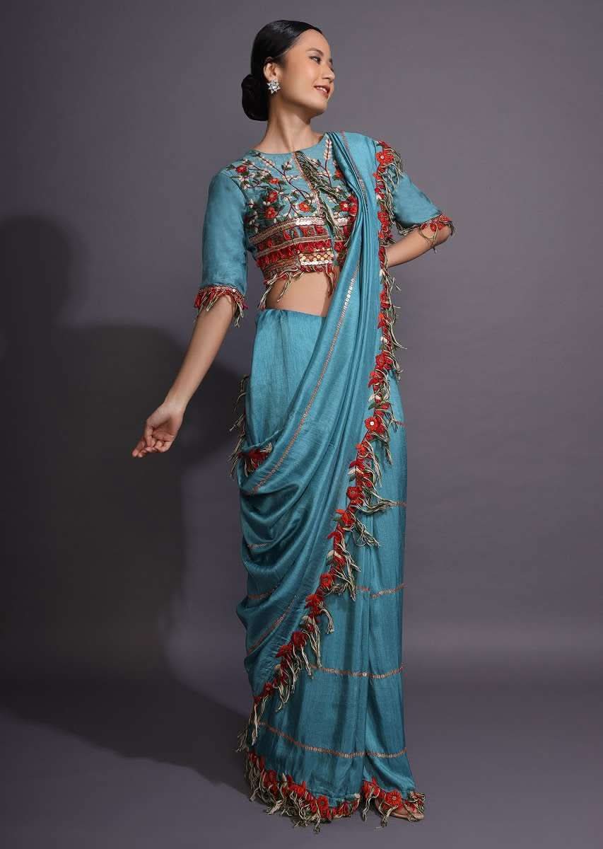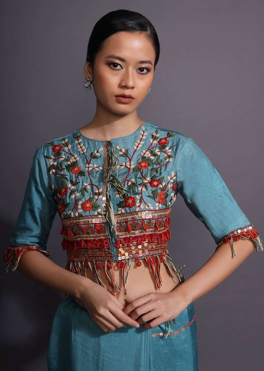 Cerulean Blue Saree With Thread Embroidered Floral Design And Tassels On The Border Online - Kalki Fashion