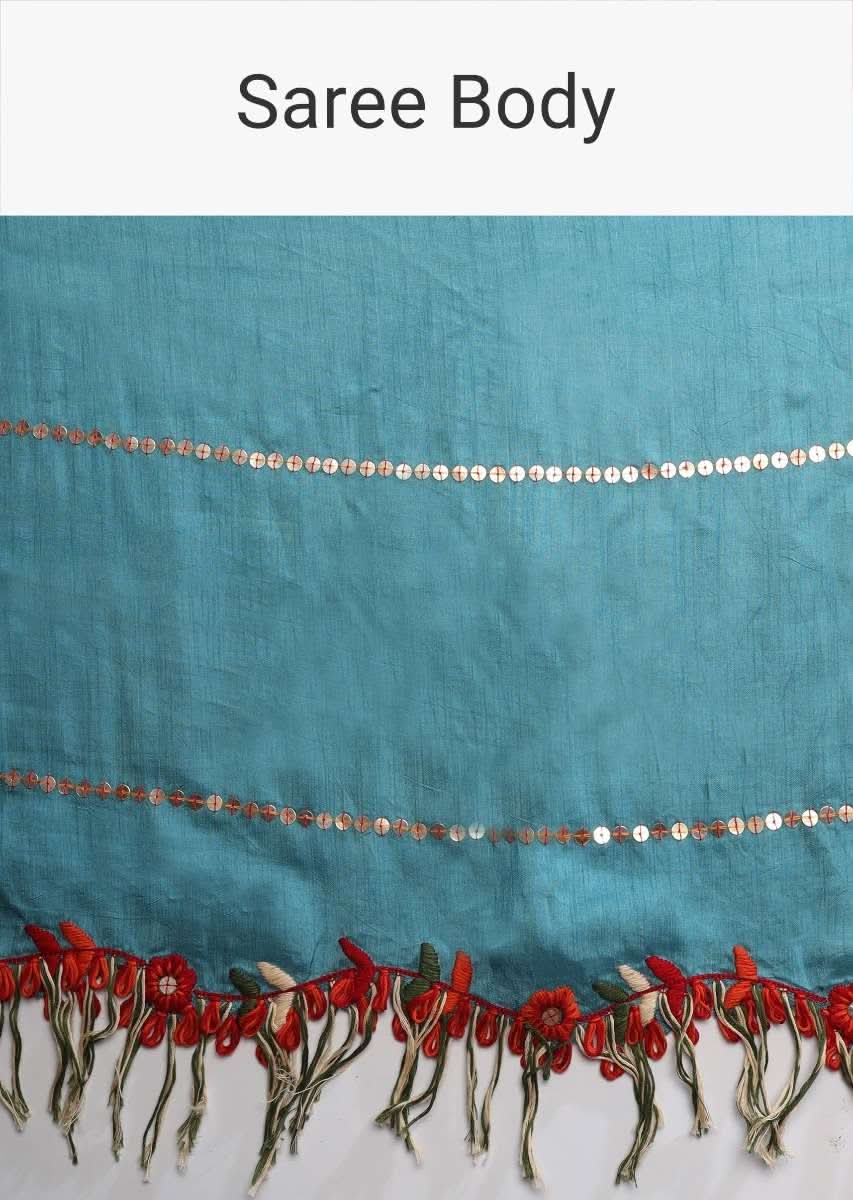 - Cerulean blue saree in cotton silk with thread embroidered border in floral motifs and trimmed with fancy tassels.