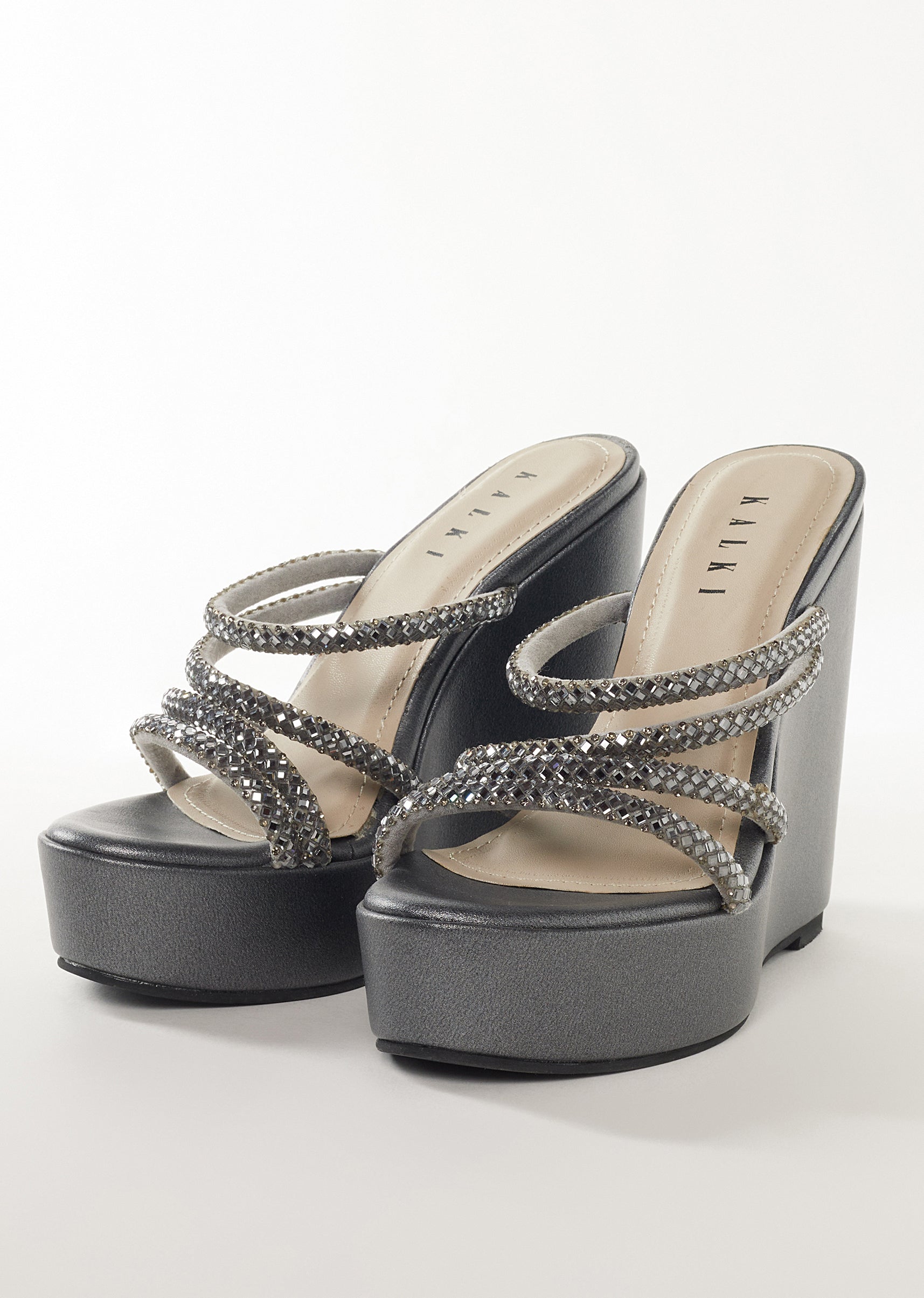Charcoal Grey Faux Leather Womens Footwear With Embellished Detail Work