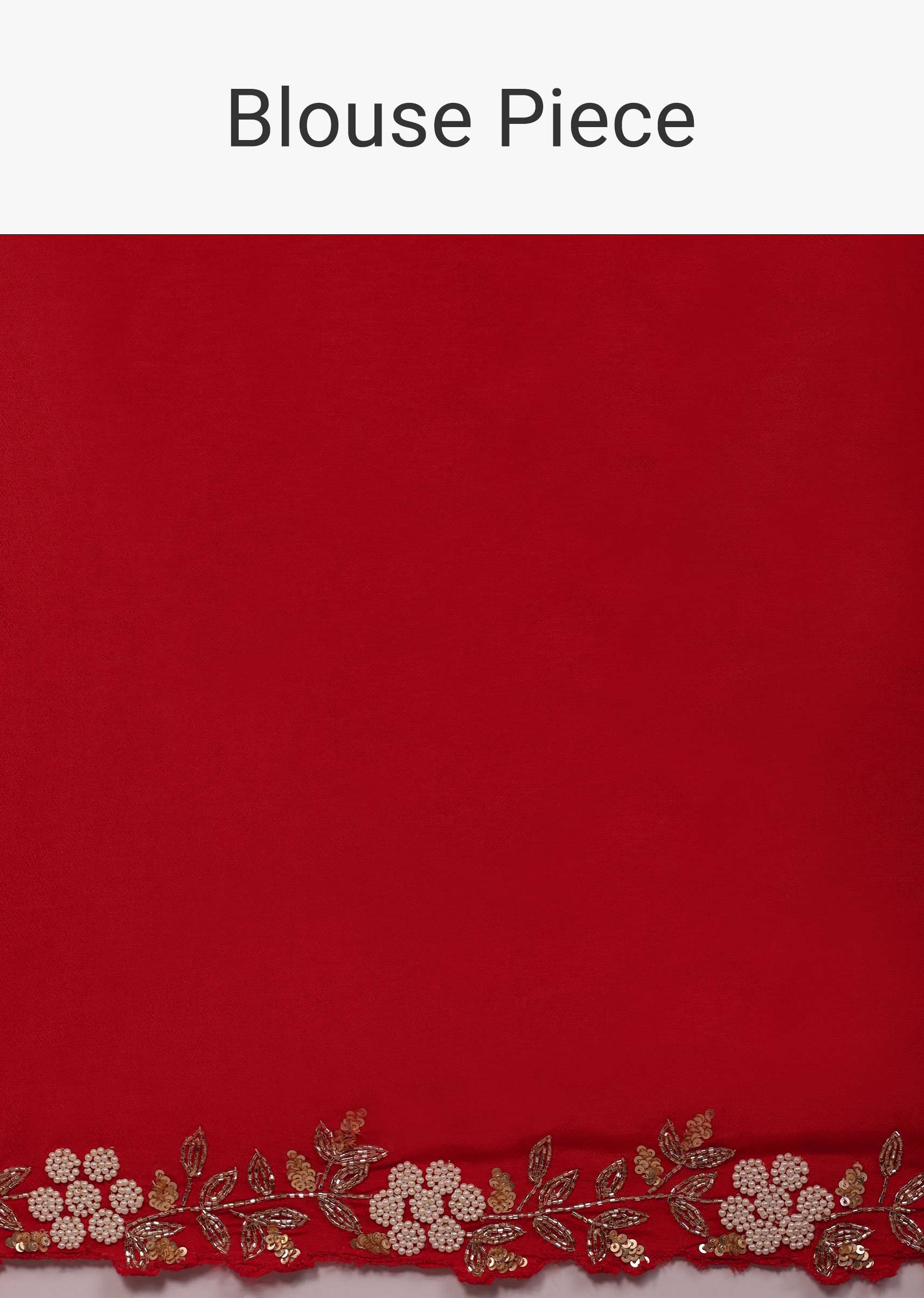 - Elevate your style quotient with our cherry red organza unstitched saree, a perfect blend of tradition and contemporary fashion.