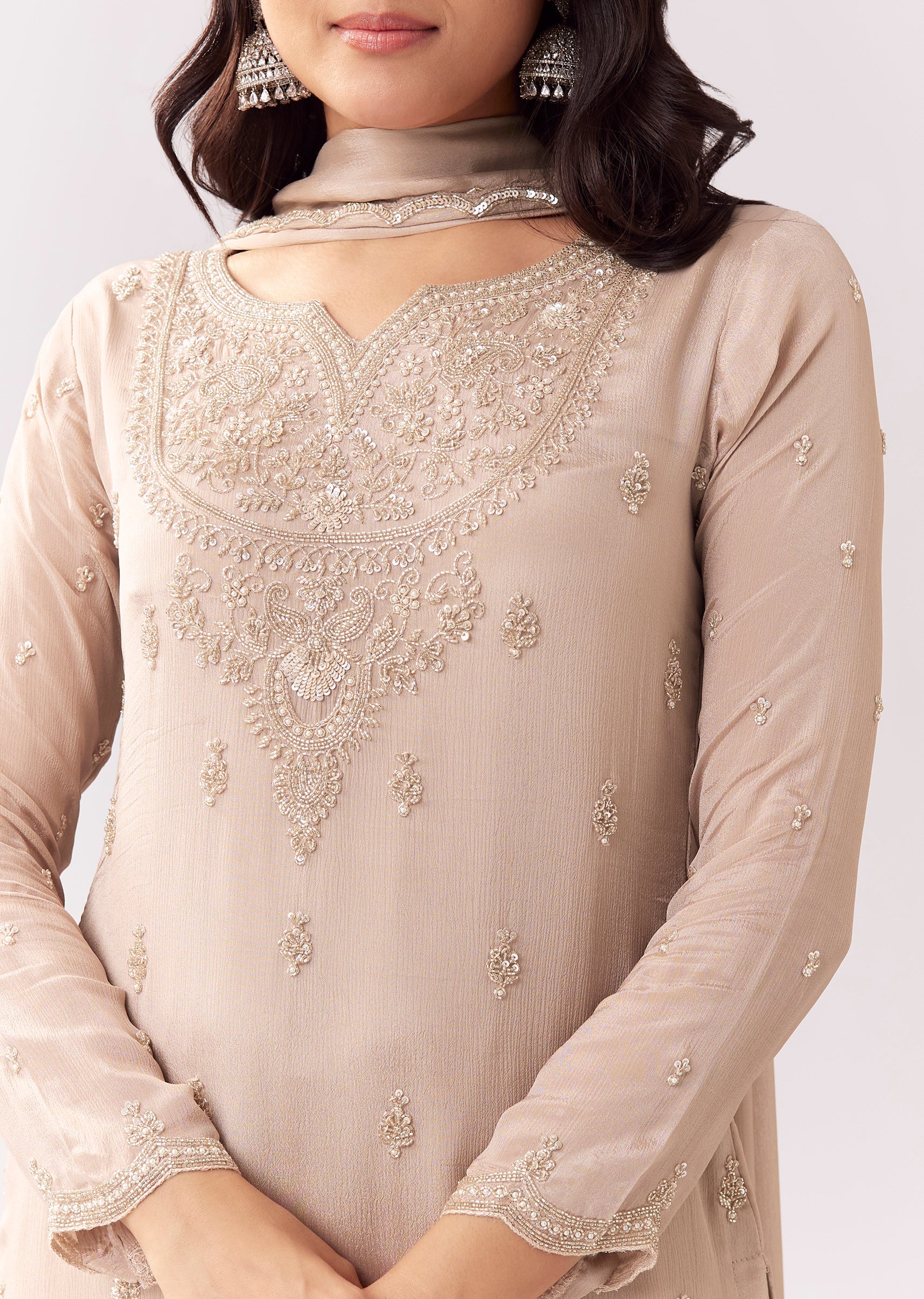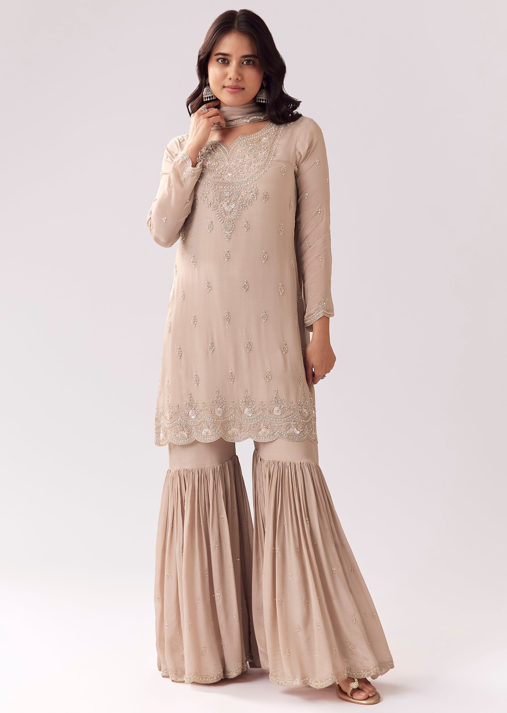 This sharara suit is designed in chinon with cut-dana detailing that adds sparkle in a subtle way. The straight kurta with full sleeves and a notched neckline keeps it modest... More Product Details