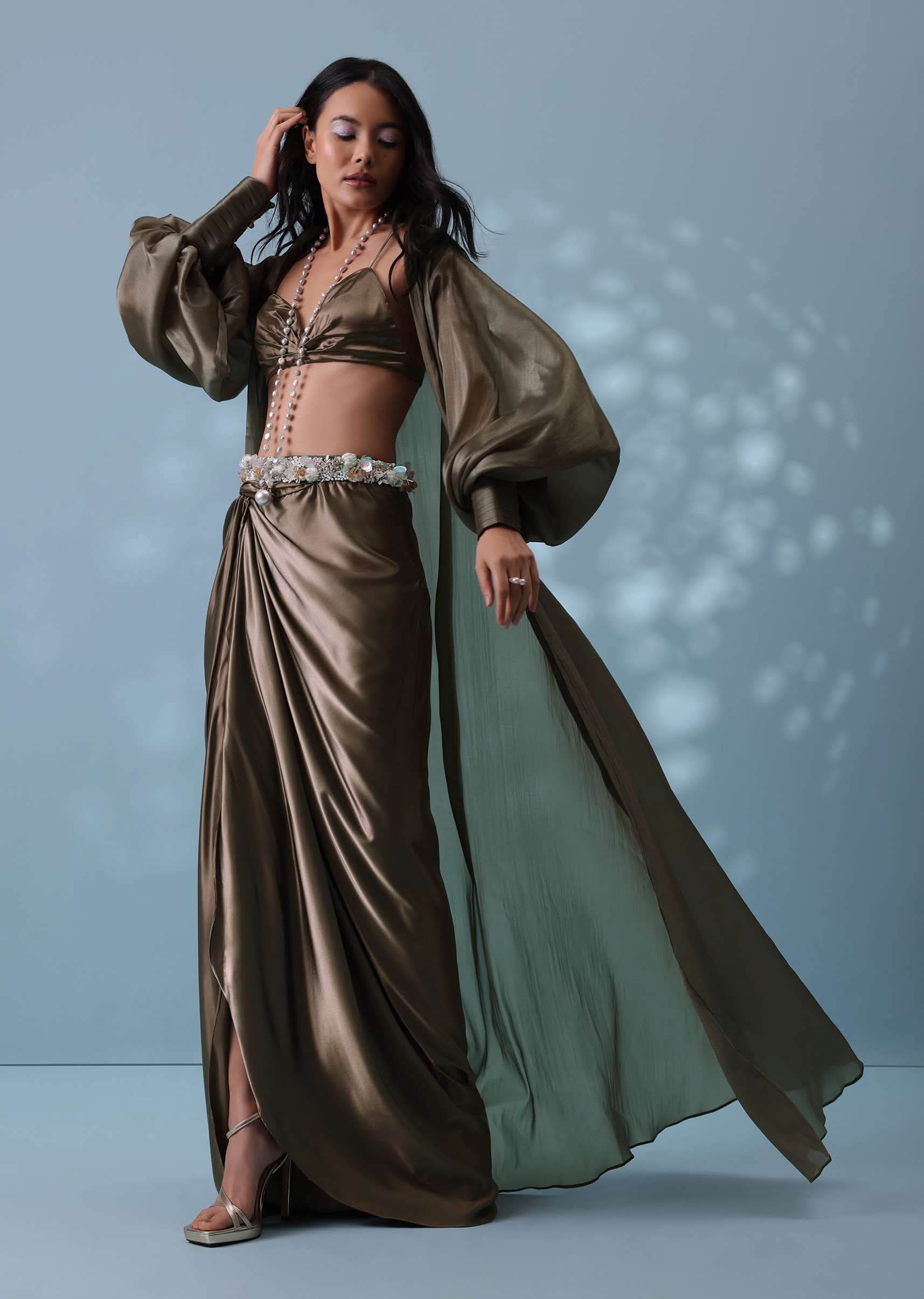 - The outfit is further complemented with a long shrug in bishop sleeves.