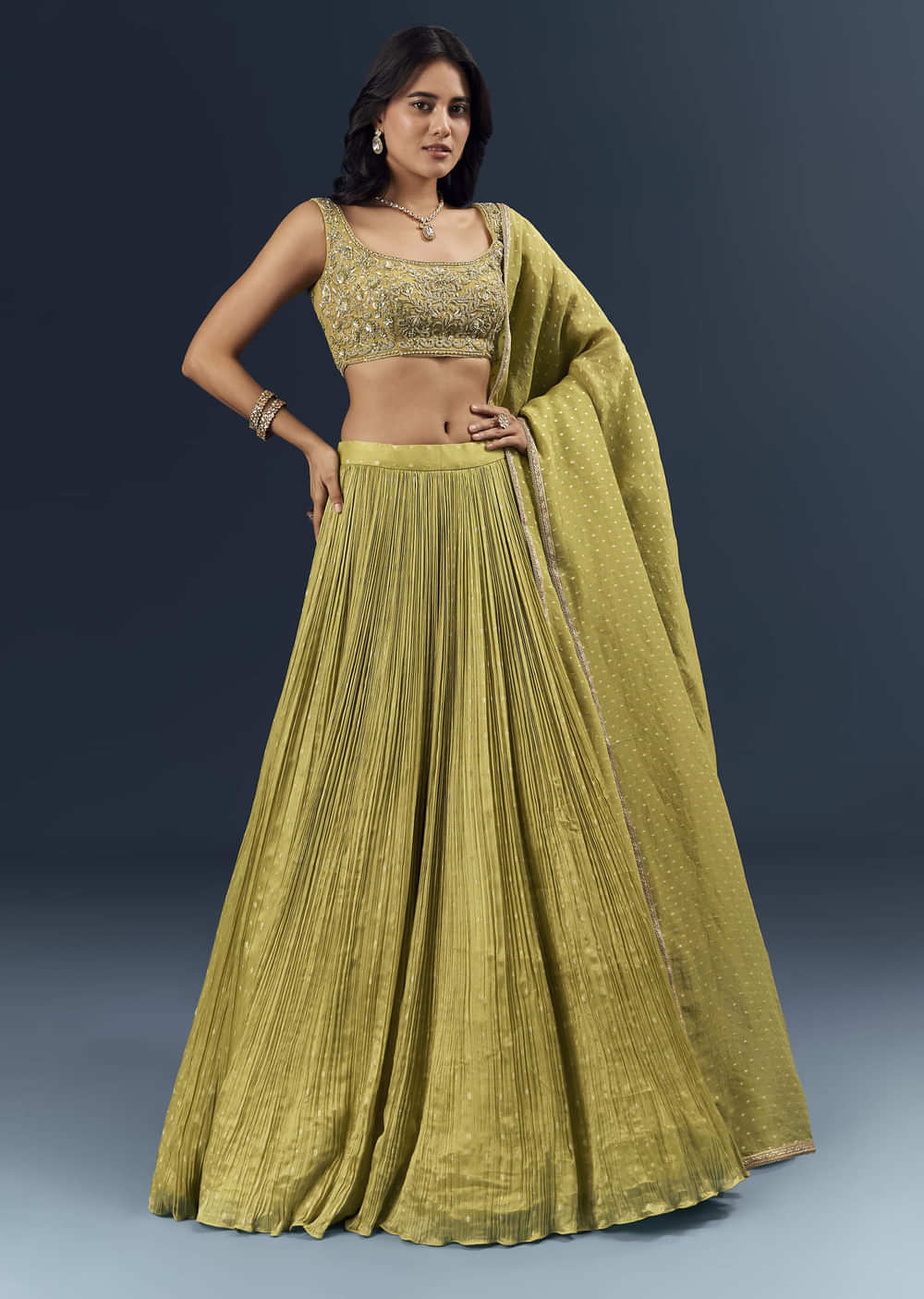 Fresh and upbeat on arrival, this citrus green banarasi silk bridesmaid lehenga brings a crisp, modern lift to group photos. Fine handwork places sequin light, bead accents, and slim lace... More Product Details