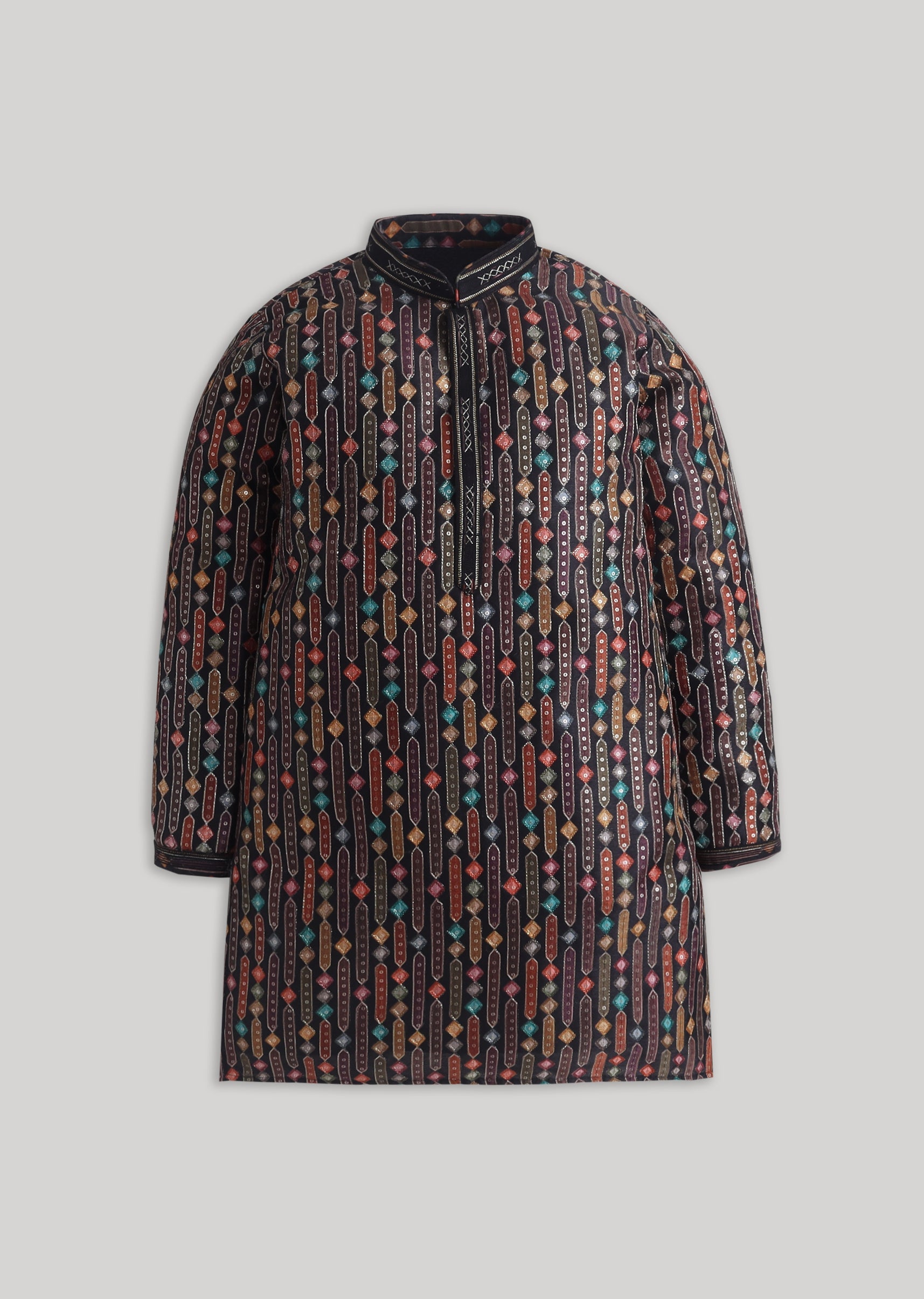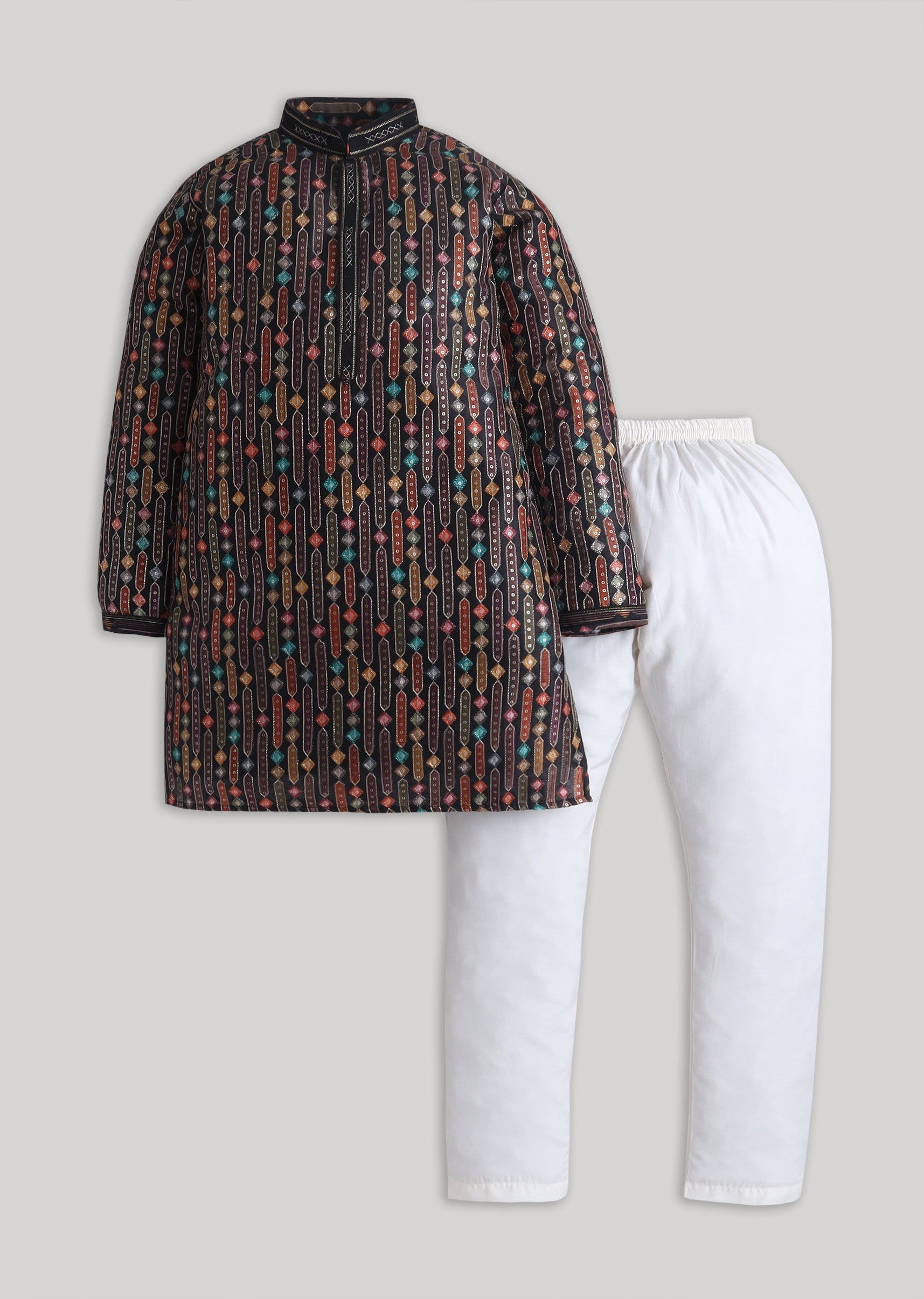 A timeless festive essential in black, this cotton kurta set is elevated with embroidery and sequin highlights. Designed with a mandarin collar, full sleeves, and matching bottom, its perfect for evening celebrations and wedding festivities. Awarded as the Most Trusted Brand, we're delivering styles you love, just as promised.